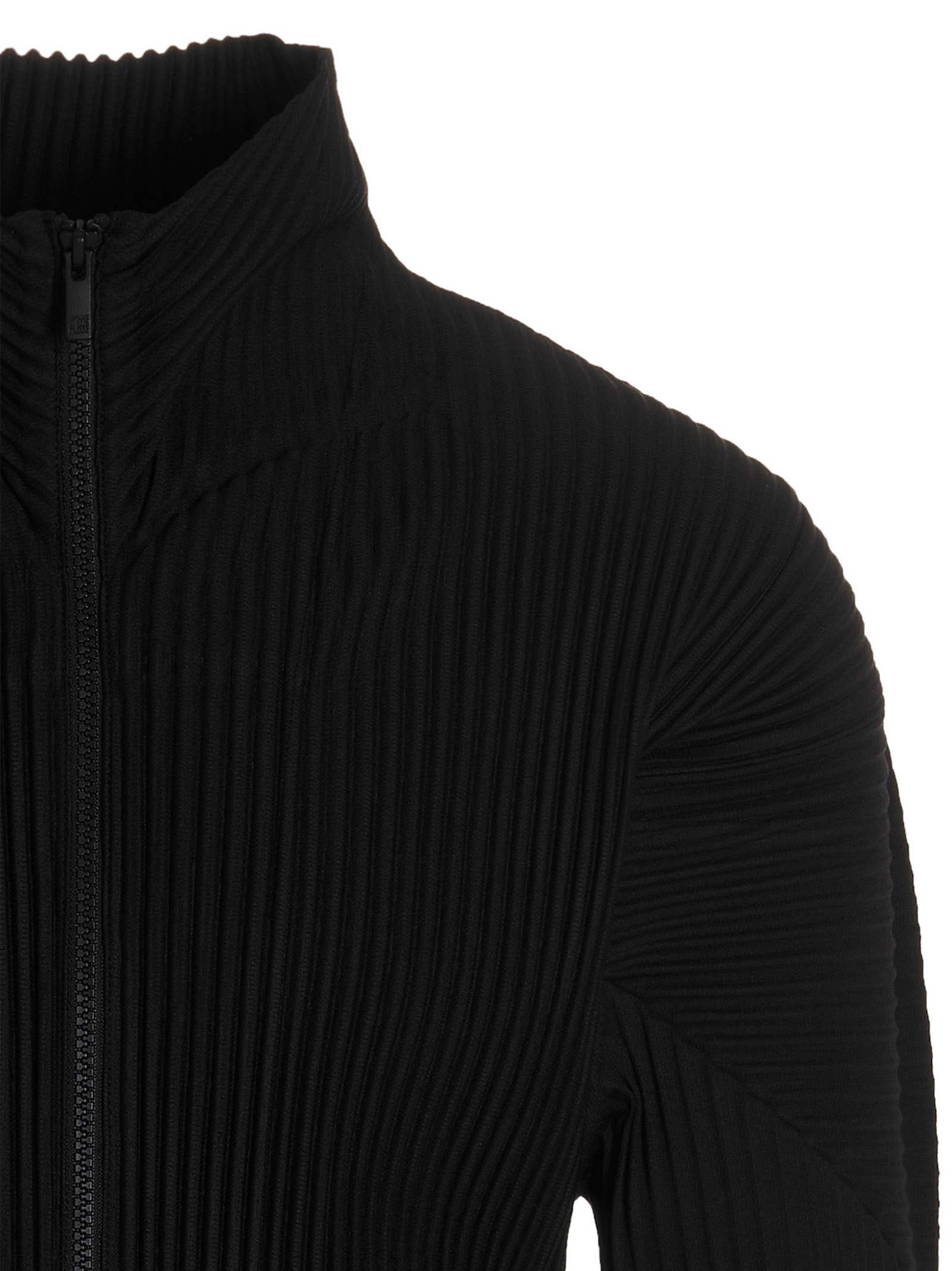 ‘Basics’ pleated cardigan with high neck, front zip closure, long sleeves.