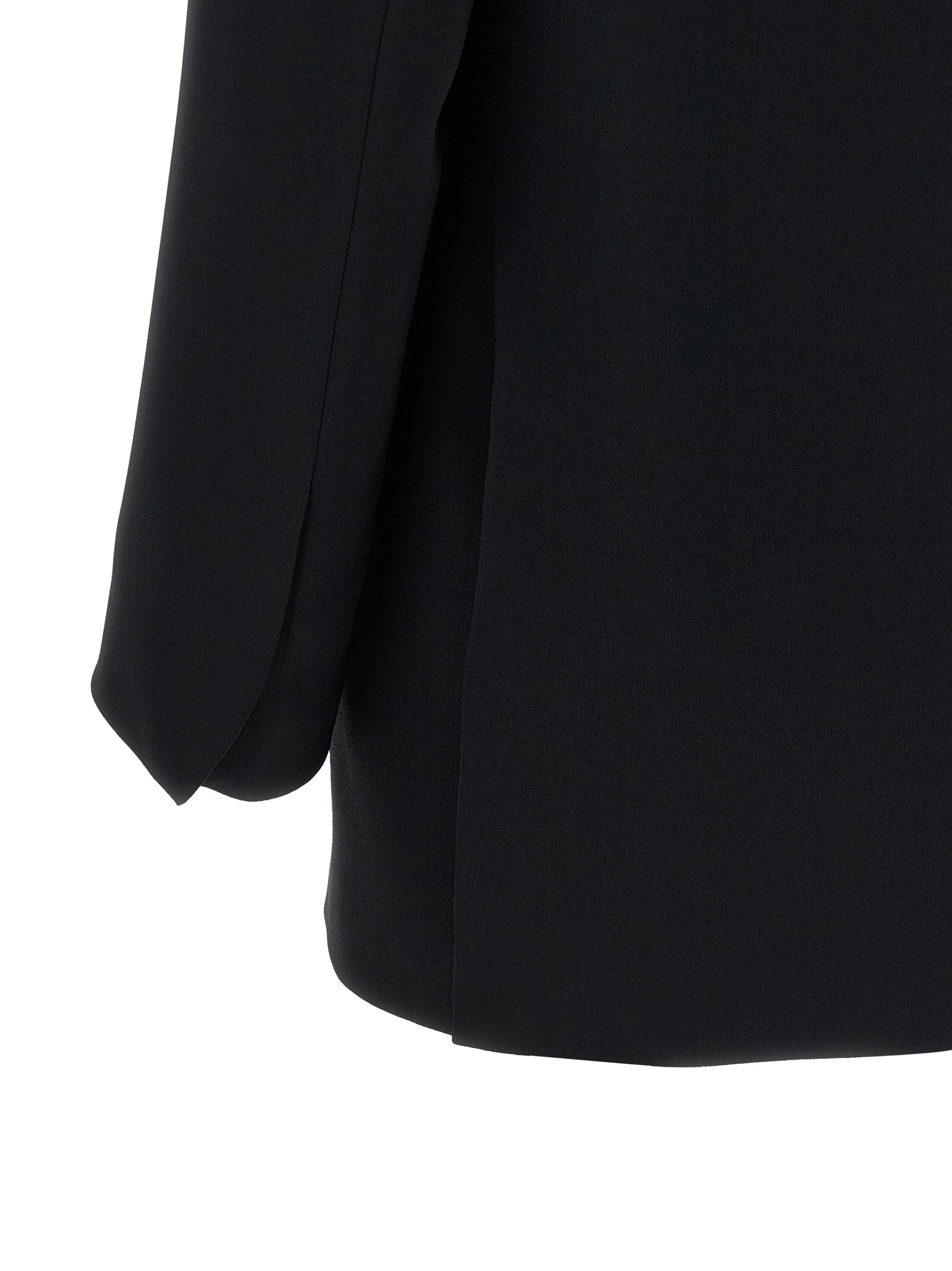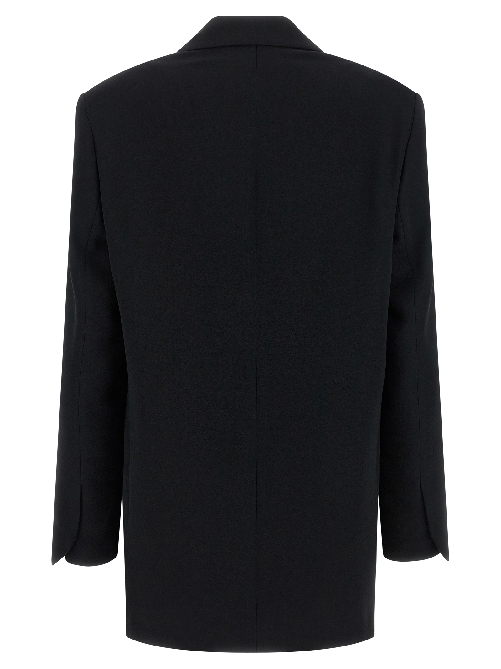 Basti’ single-breasted crêpe blazer with two front button closure, mirror lapels, breast pocket, flap pockets, padded shoulders, long sleeves, back vents, viscose lining.