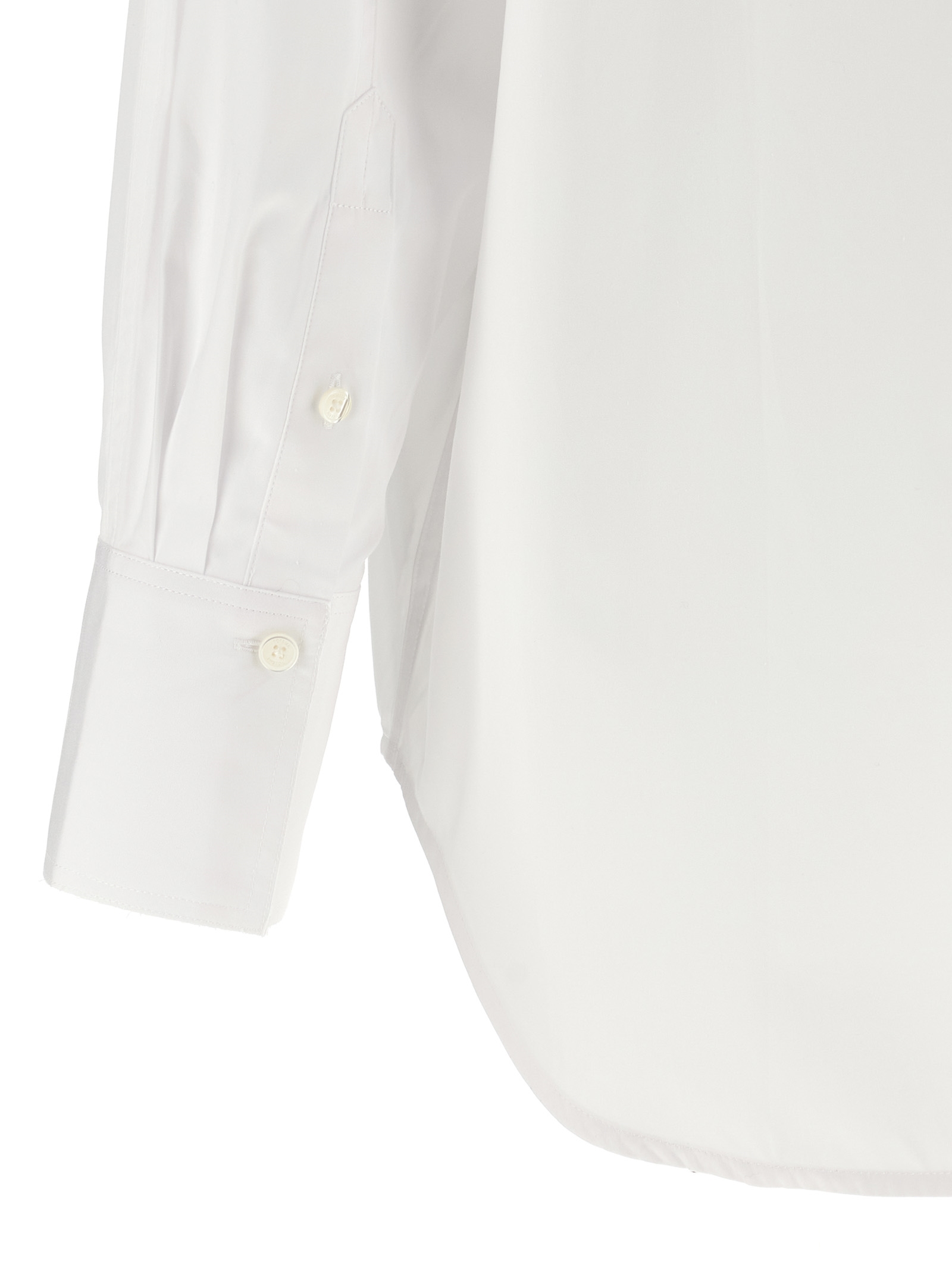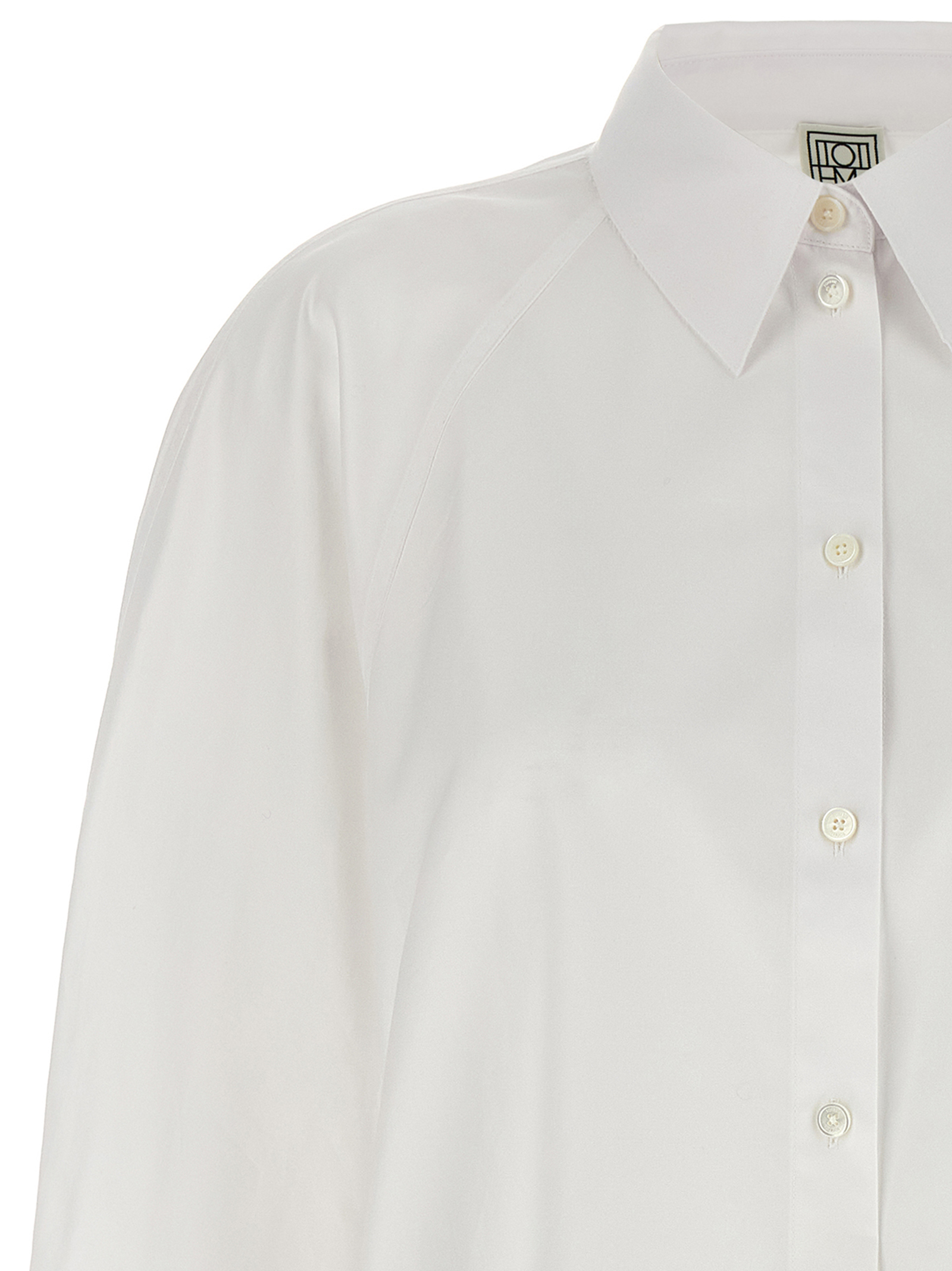 Cotton poplin shirt with front button closure, long bat raglan sleeves with cuffs, raw cut collar and cuffs.