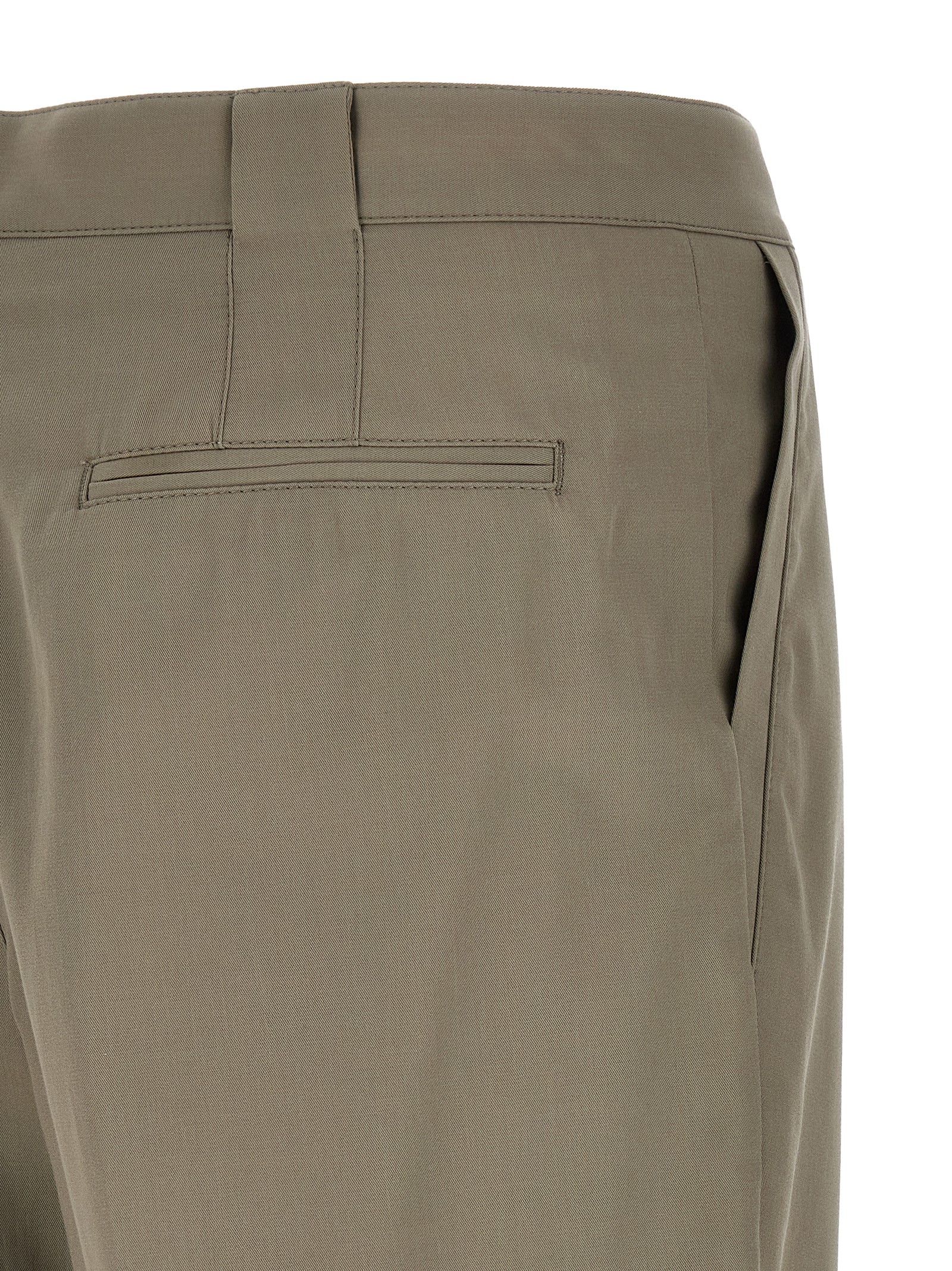 Cotton crêpe batavia pants with diagonal weave, regular waist fit with deliberately soft and wide volumes on the leg, front pincer, stretched pleat, zip and button closure and front American pockets, back welt pockets.