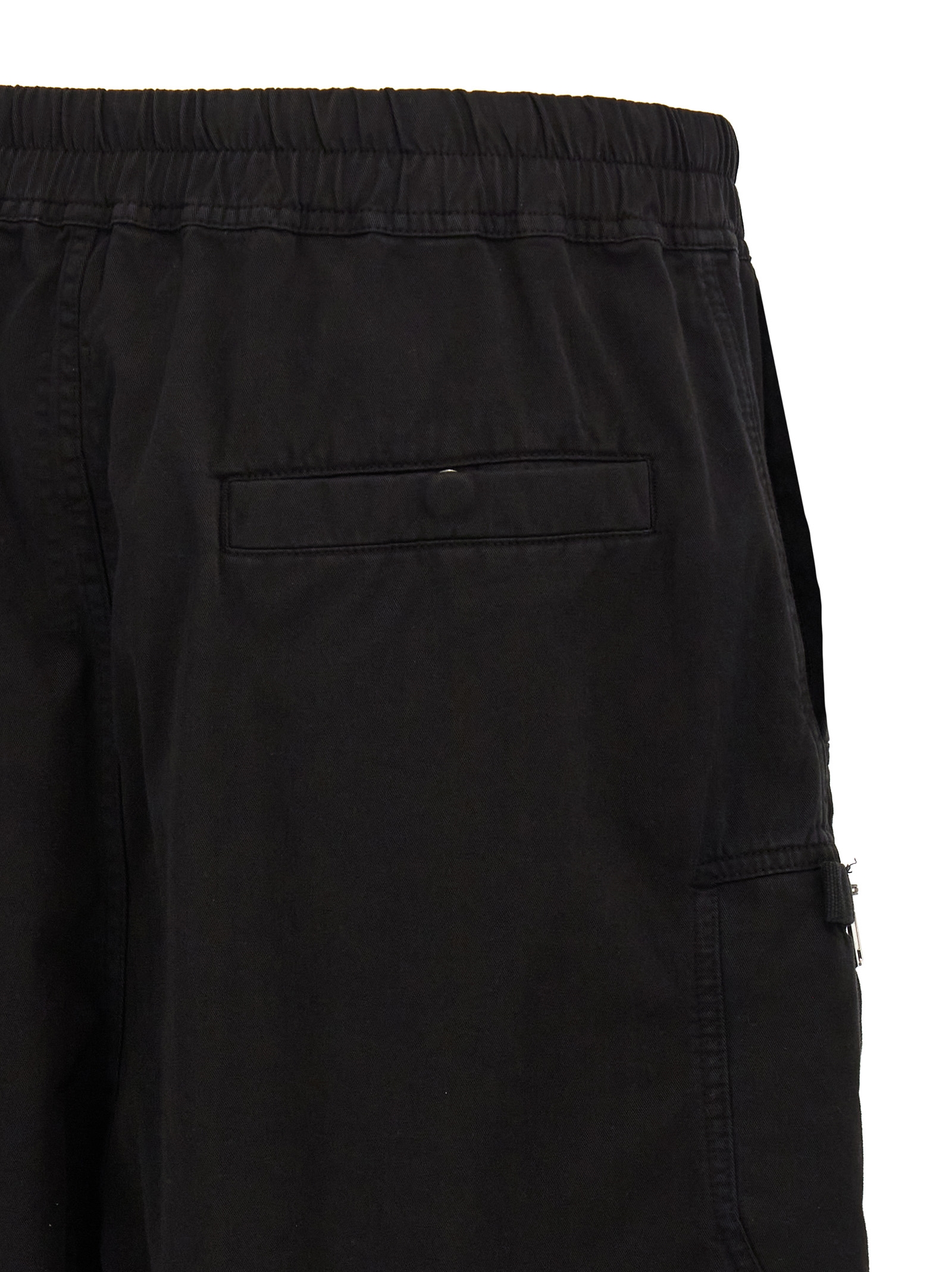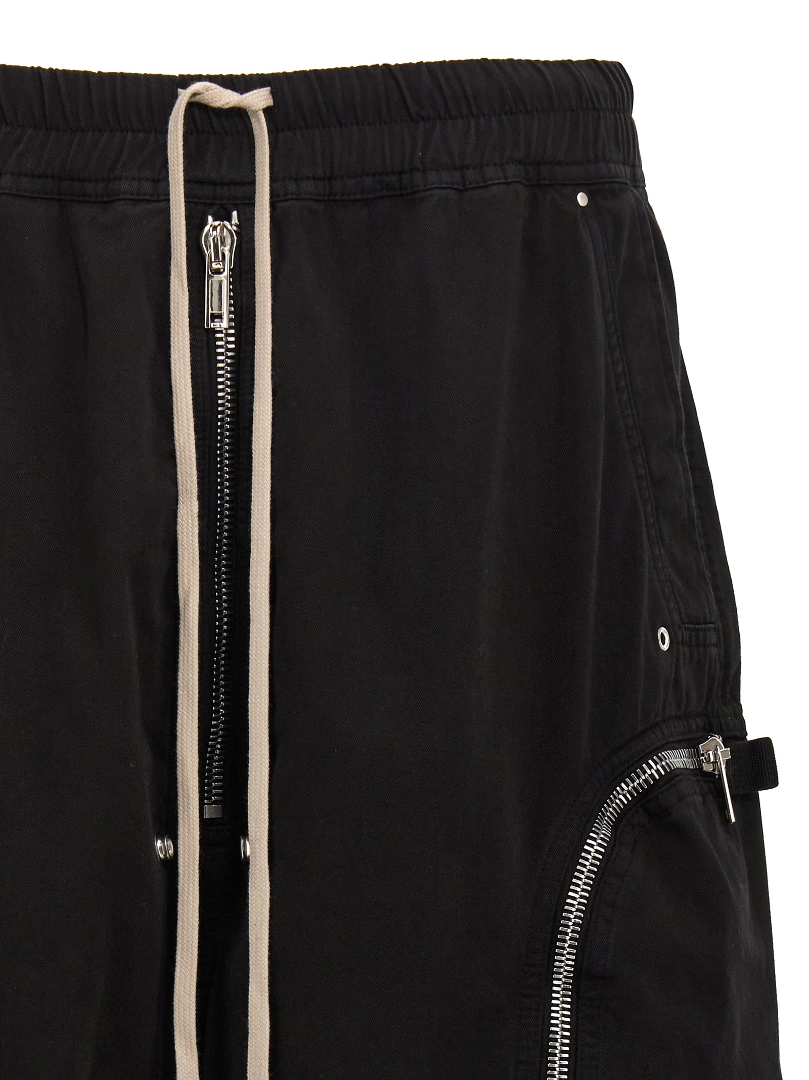 ‘Bauhaus’ cotton bermudas, elastic and drawstring at the waist, zip flap, pockets.