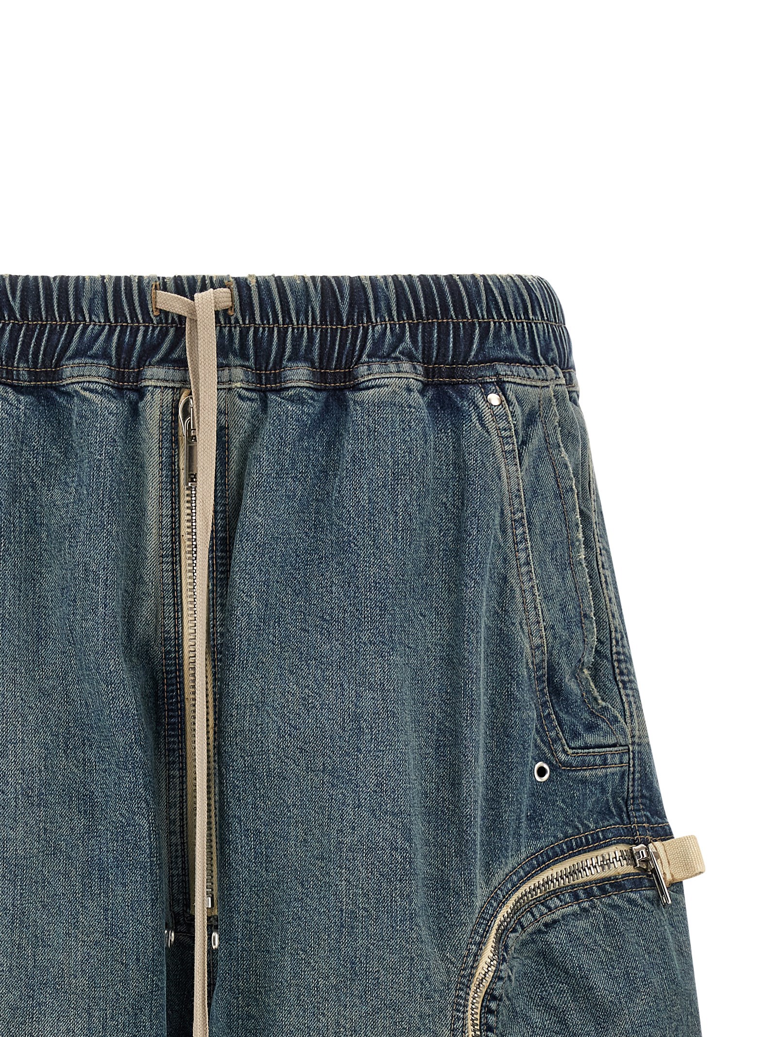‘Bauhaus Pod’ cotton denim bermuda shorts, elastic waistband and drawstring, zip flap, pockets, metal rivets.