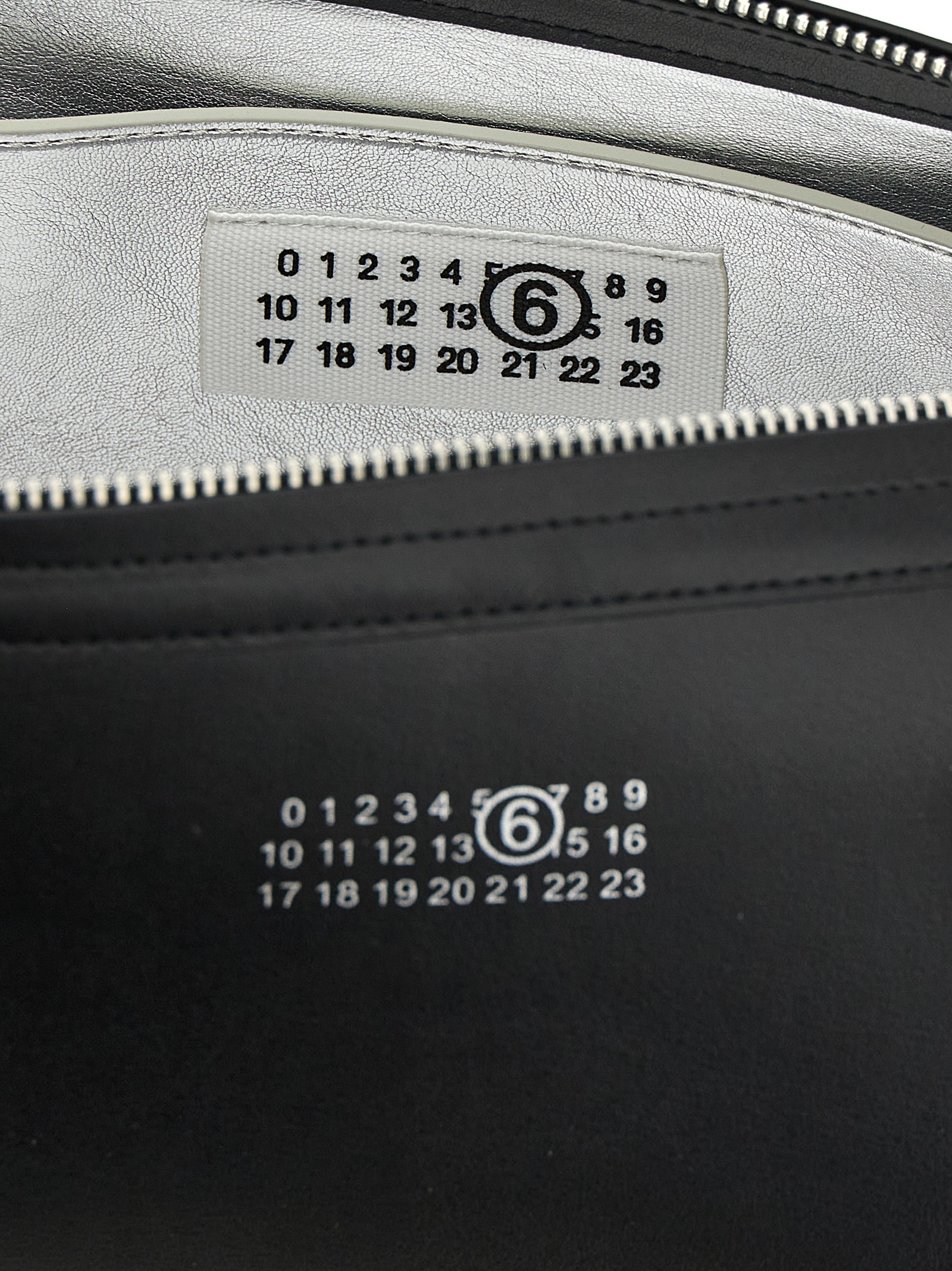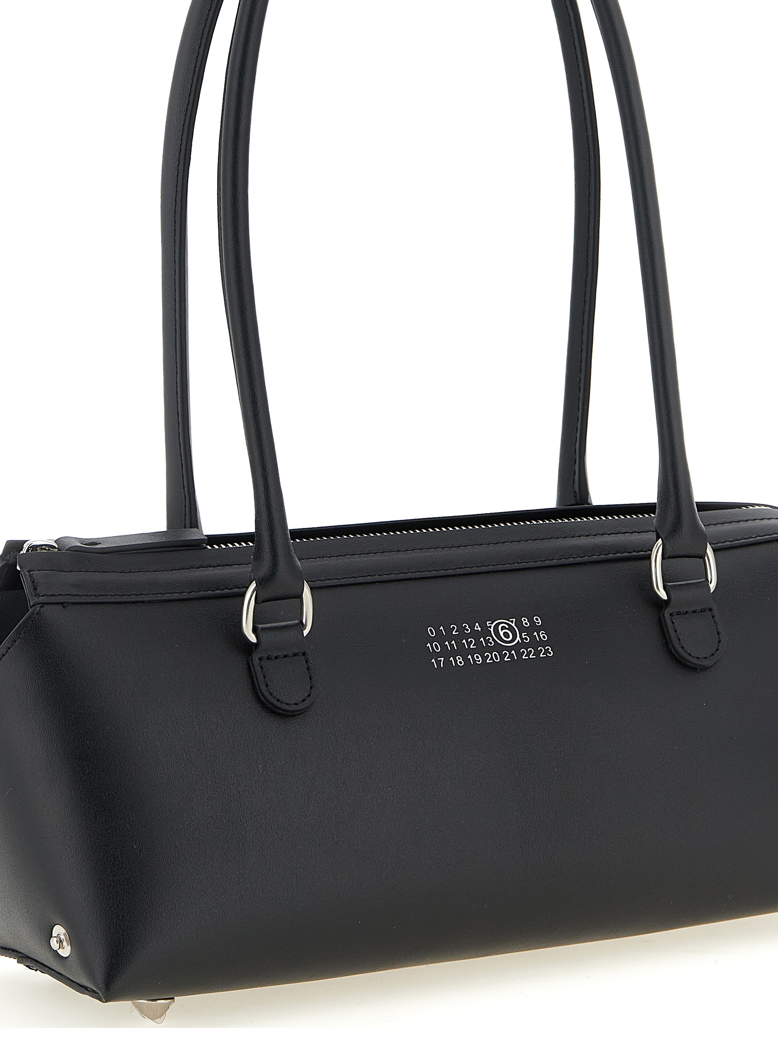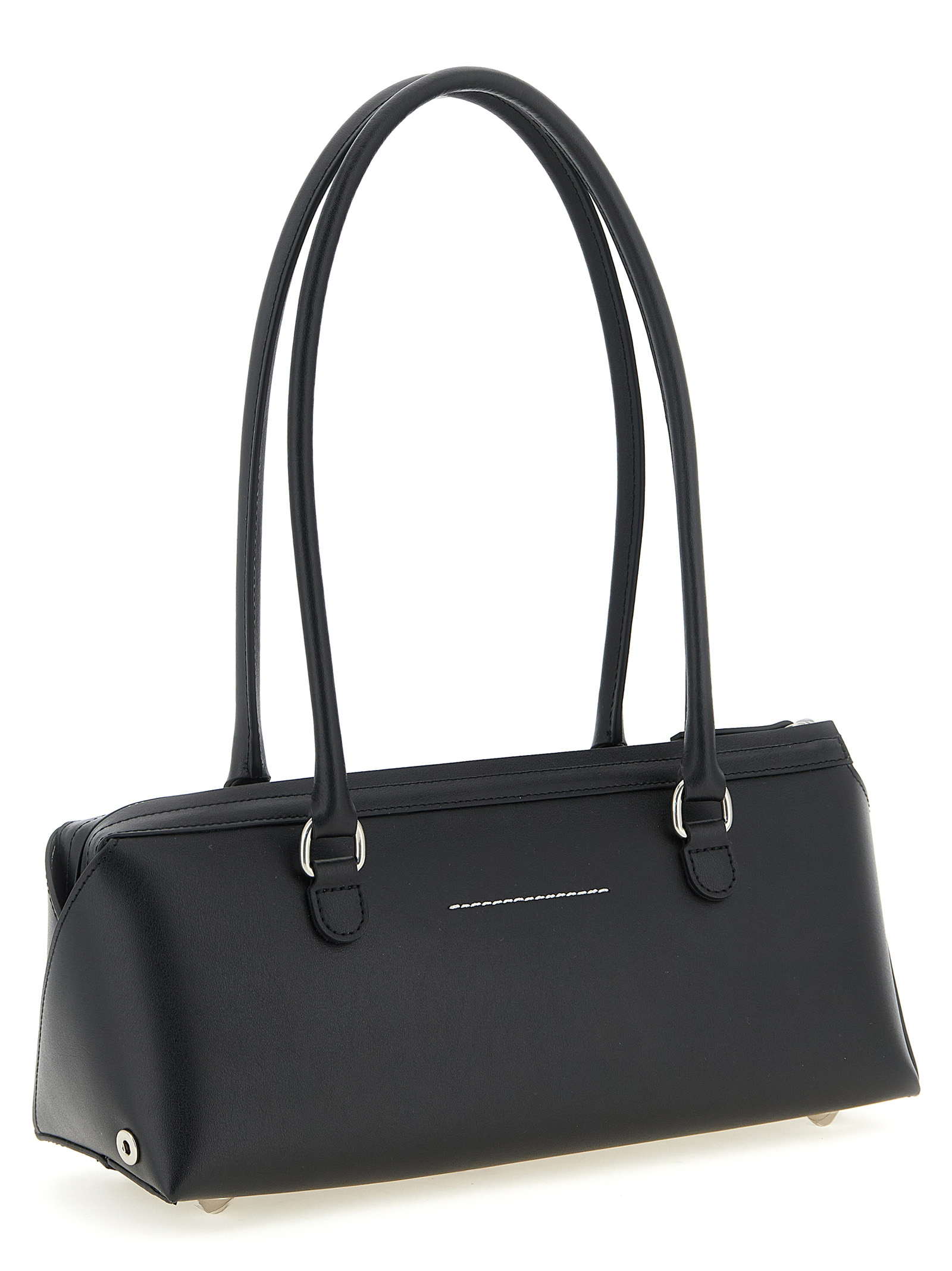 Bowling medium ‘Bauletto’ smooth leather shoulder bag with horizontal design, front embossed ‘Numeric Signature MM6’ print, double fixed tubular handle, top zip closure, back ‘White Stitch Line’, rigid base with metal feet, lining.