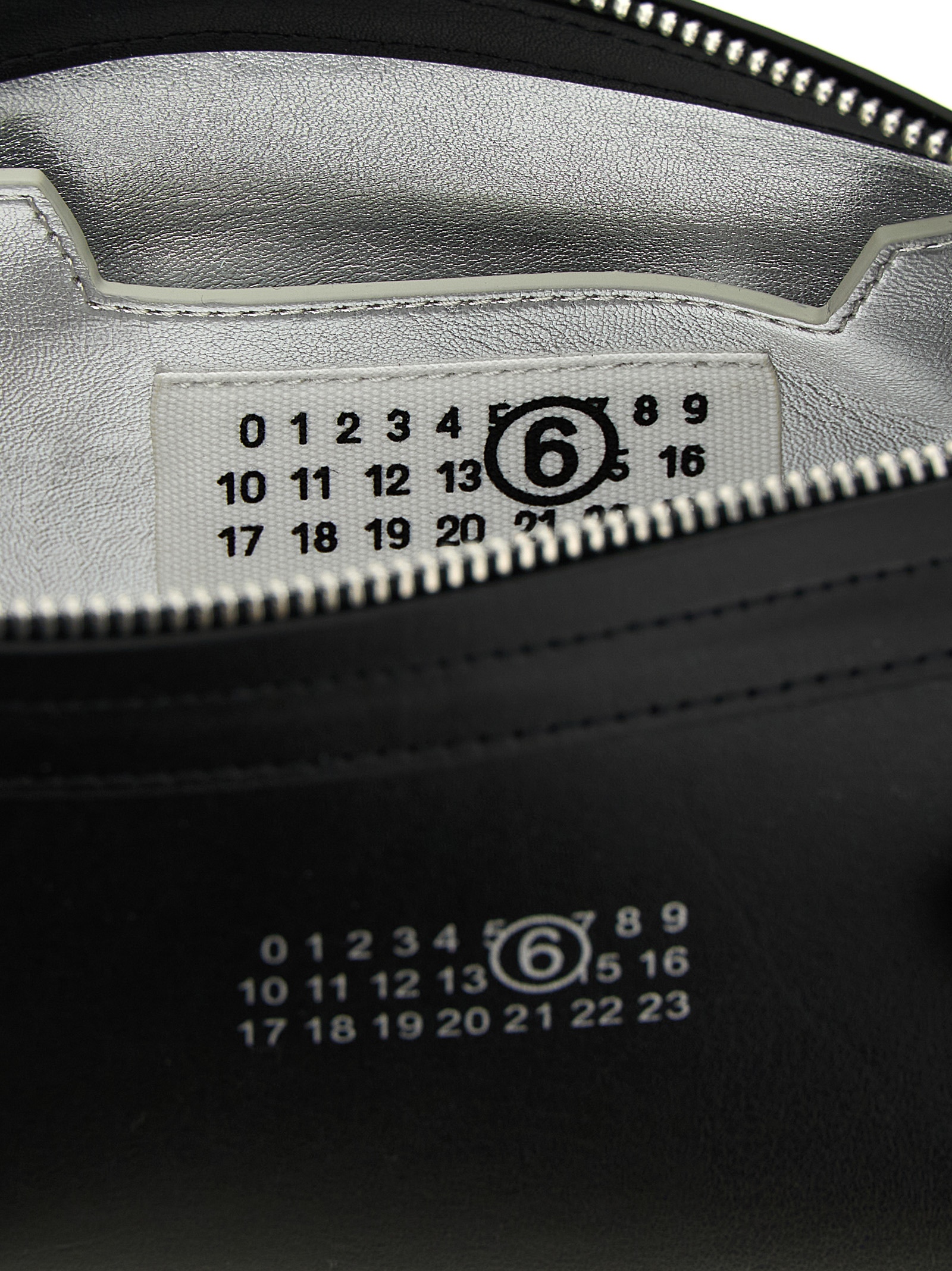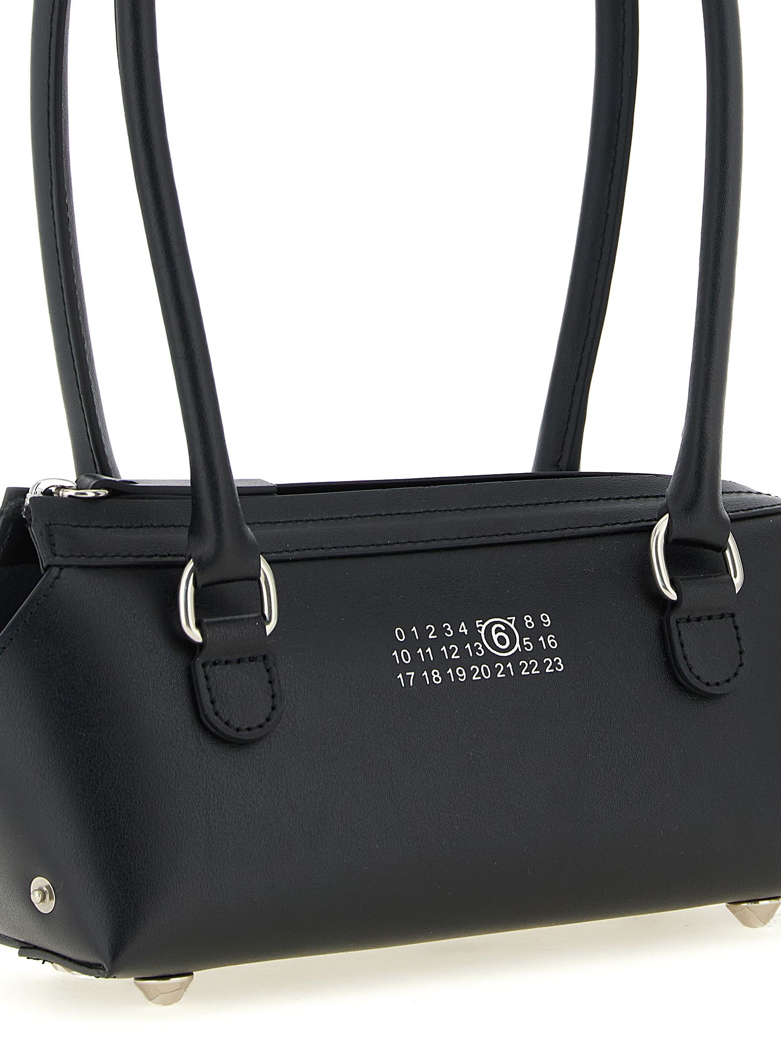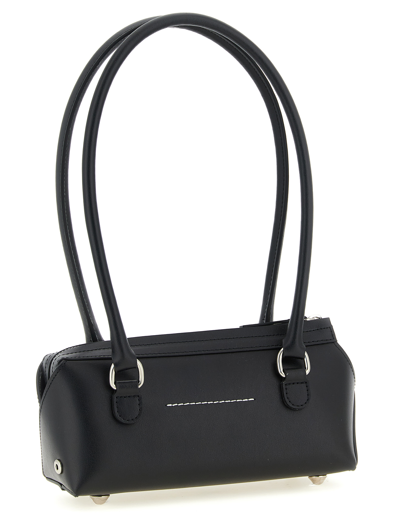 Mini ‘Bauletto’ smooth leather bowling shoulder bag with horizontal design, front embossed ‘Numeric Signature MM6’ print, double fixed tubular handle, top zip closure, back ‘White Stitch Line’, rigid base with metal feet, lining.