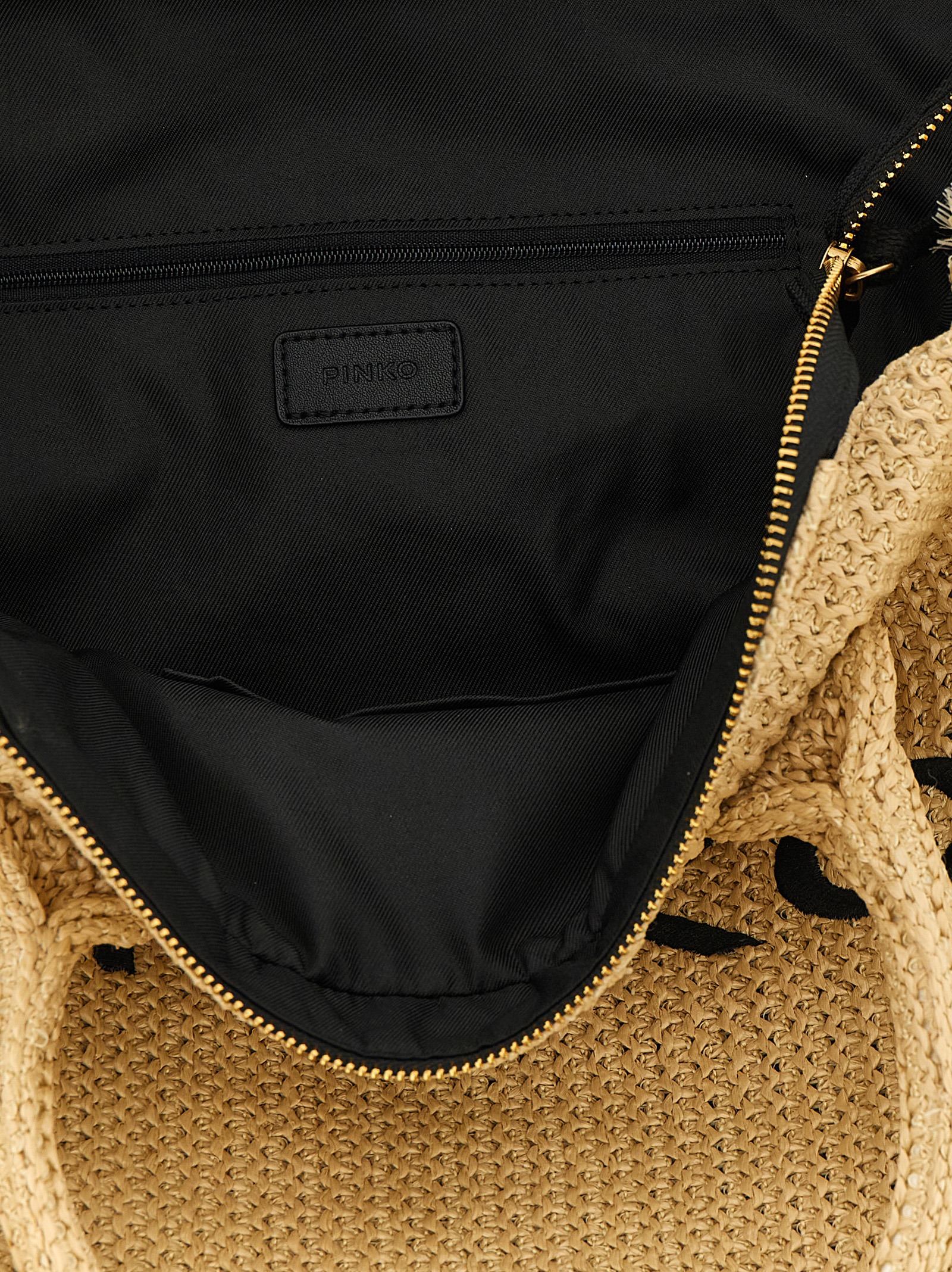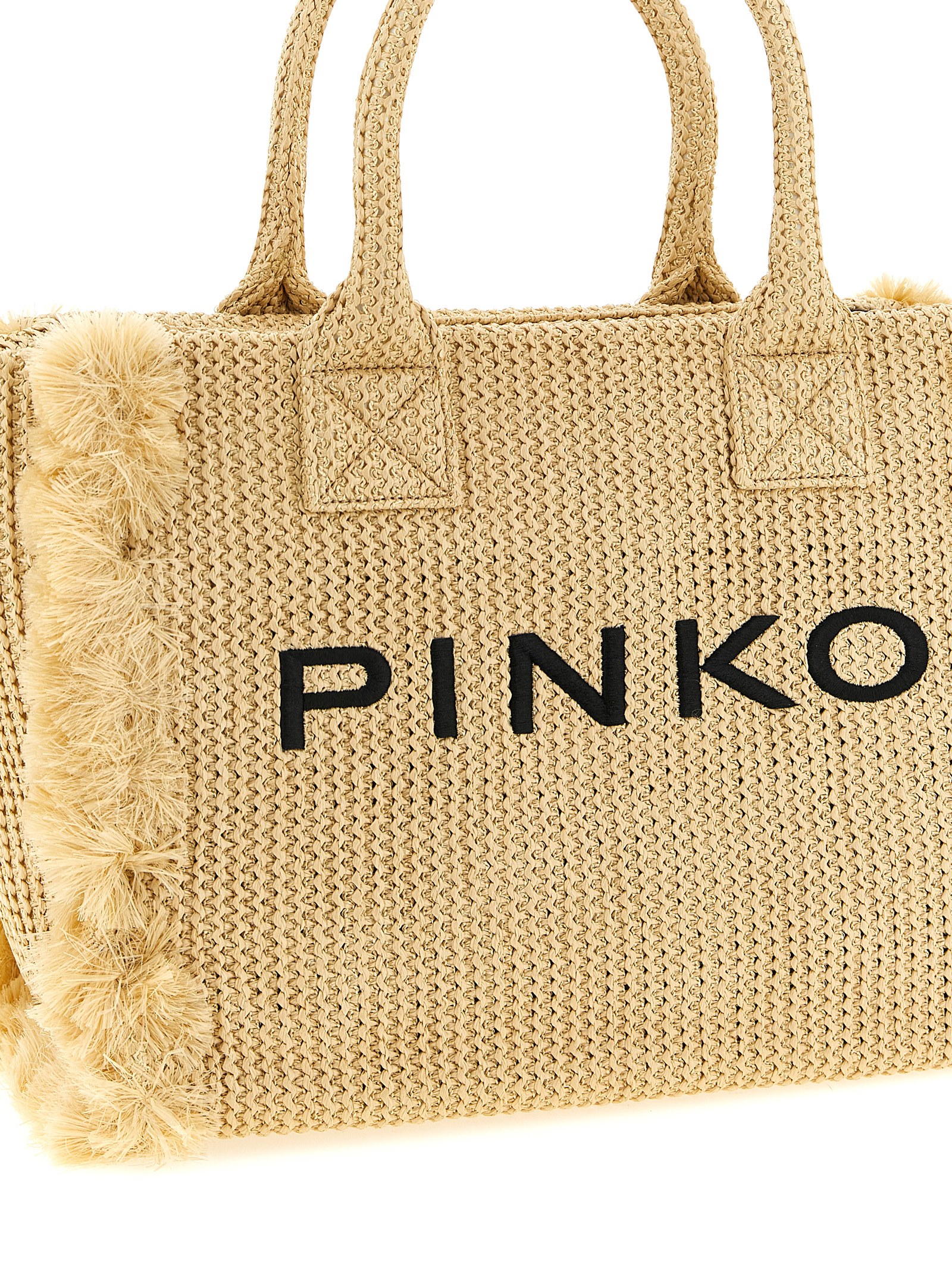‘Beach’ large shopping bag in woven raffia-effect fabric with tone-on-tone fringes at the edges, contrasting lettering logo embroidery on the front, double fixed tubular handle, top zip closure, lining, two inner pockets.
