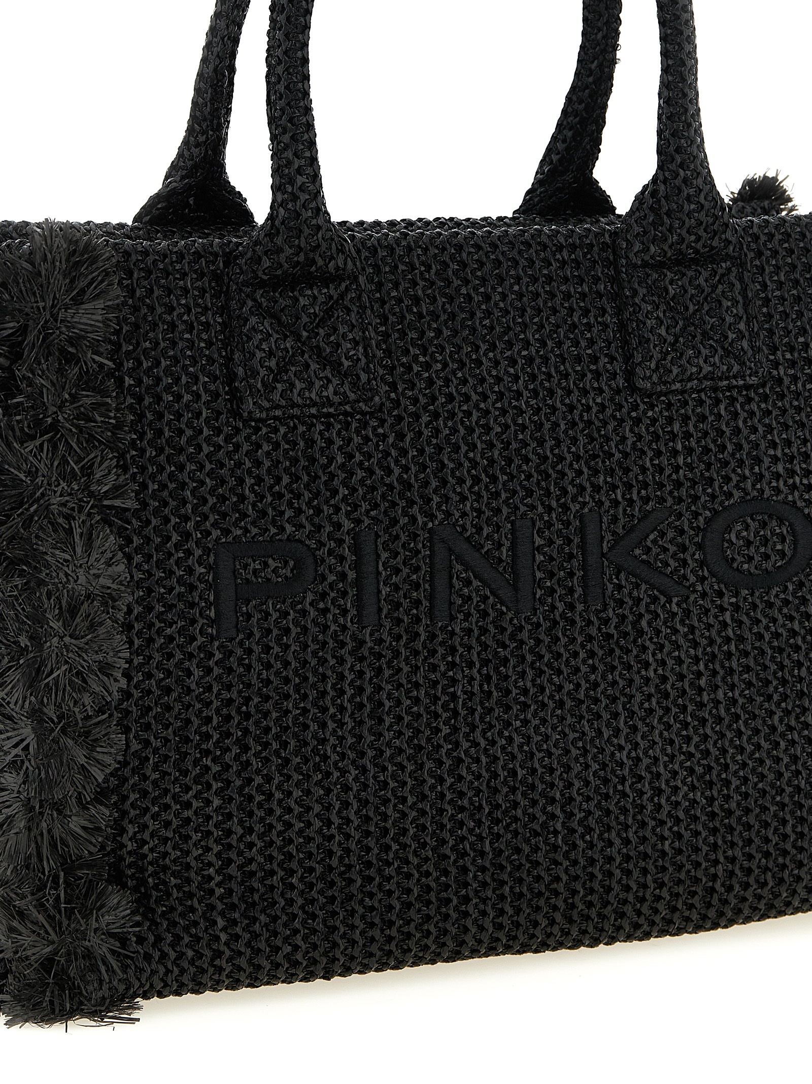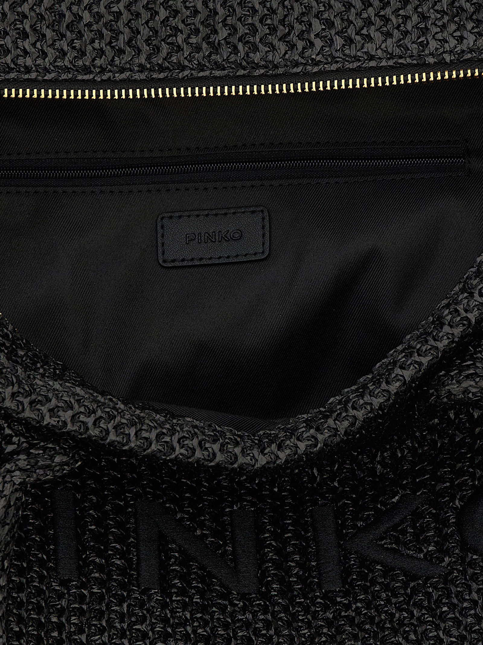 ‘Beach’ large shopping bag in woven raffia-effect fabric with tone-on-tone fringes at the edges, contrasting lettering logo embroidery on the front, double fixed tubular handle, top zip closure, lining, two inner pockets.