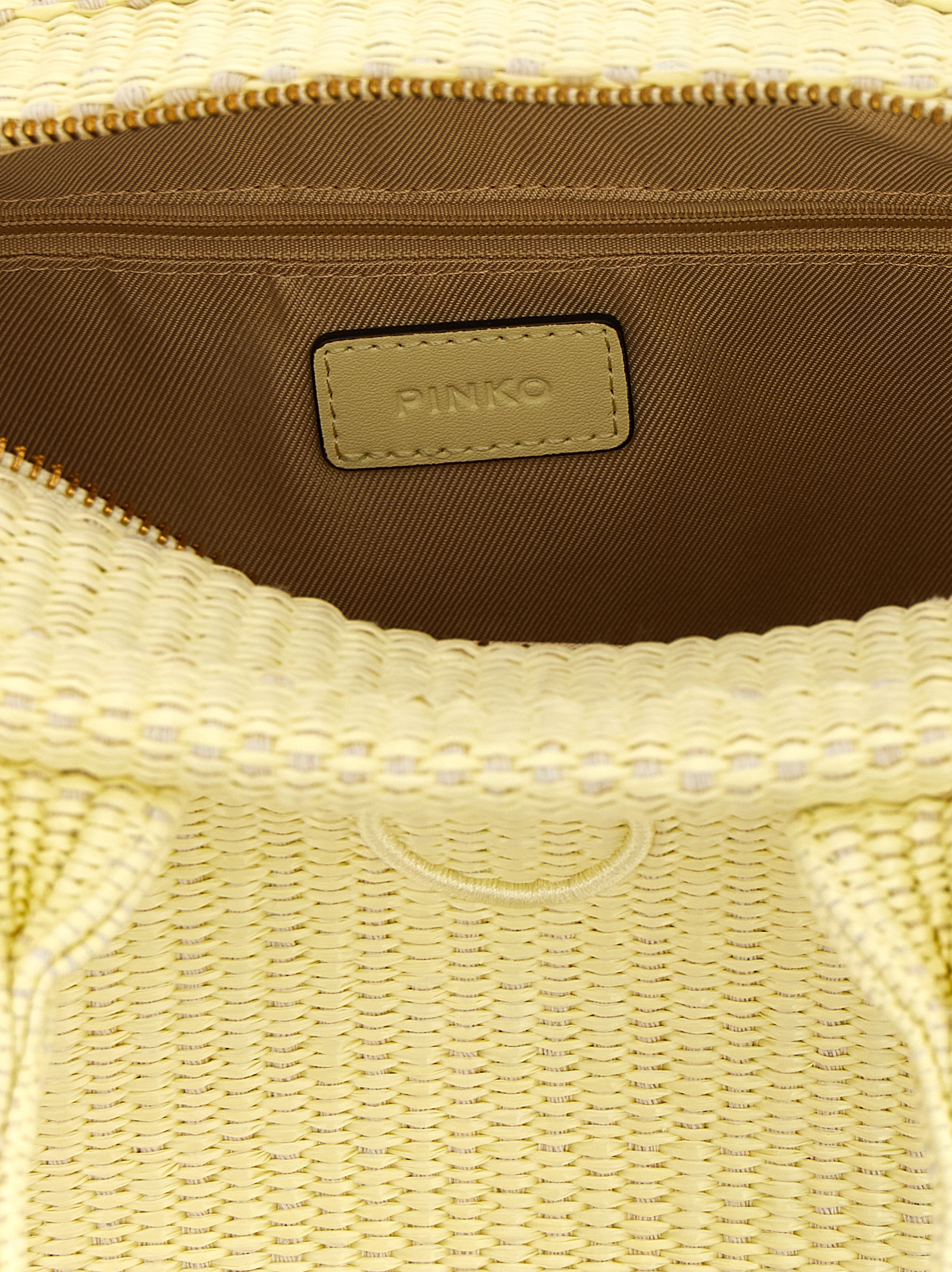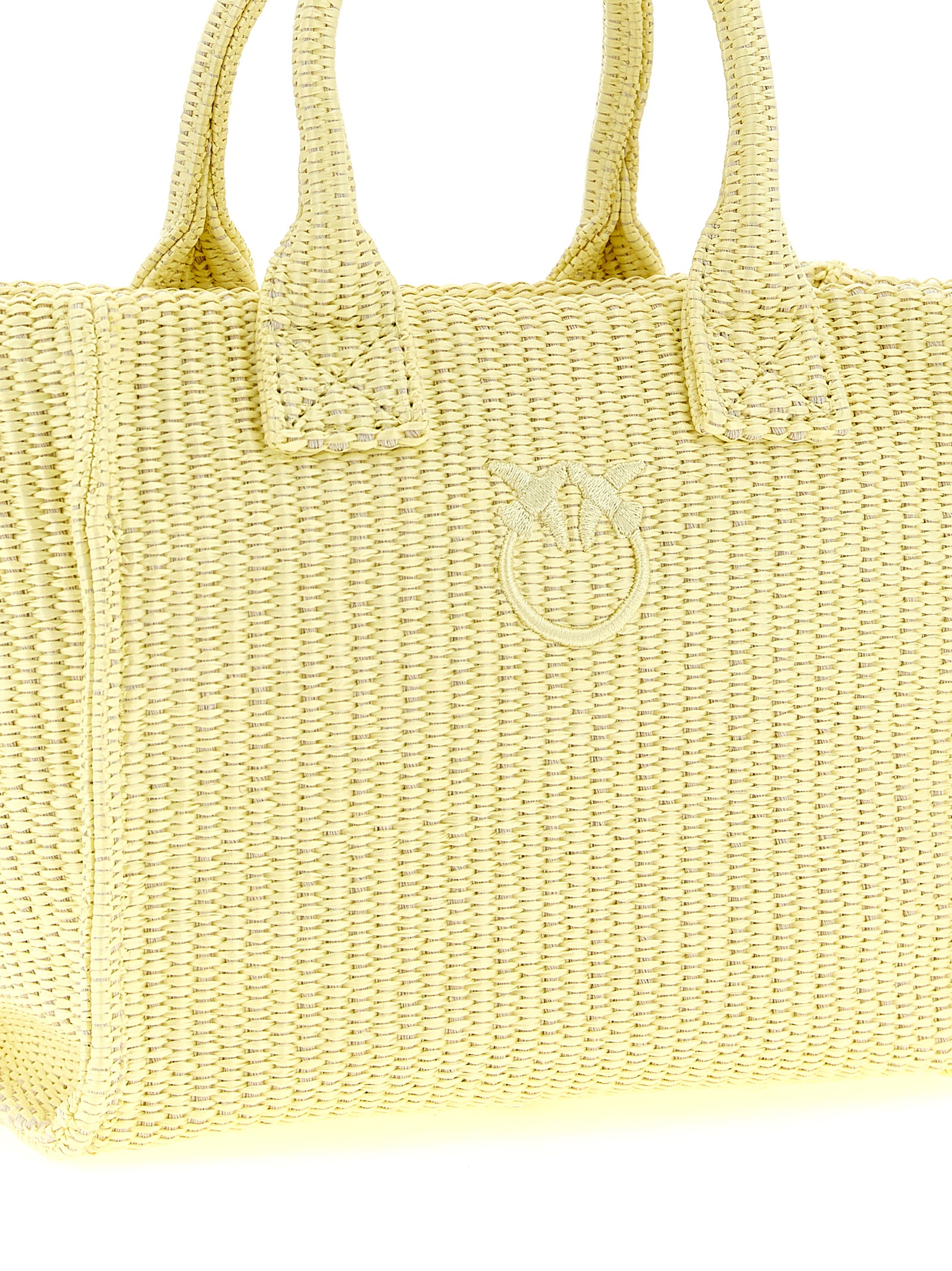 ‘Beach’ mini shopping bag in woven raffia with tonal ‘Love Birds Diamond’ embroidery on the front, double fixed tubular handle, top zip closure, lining, two inner pockets.