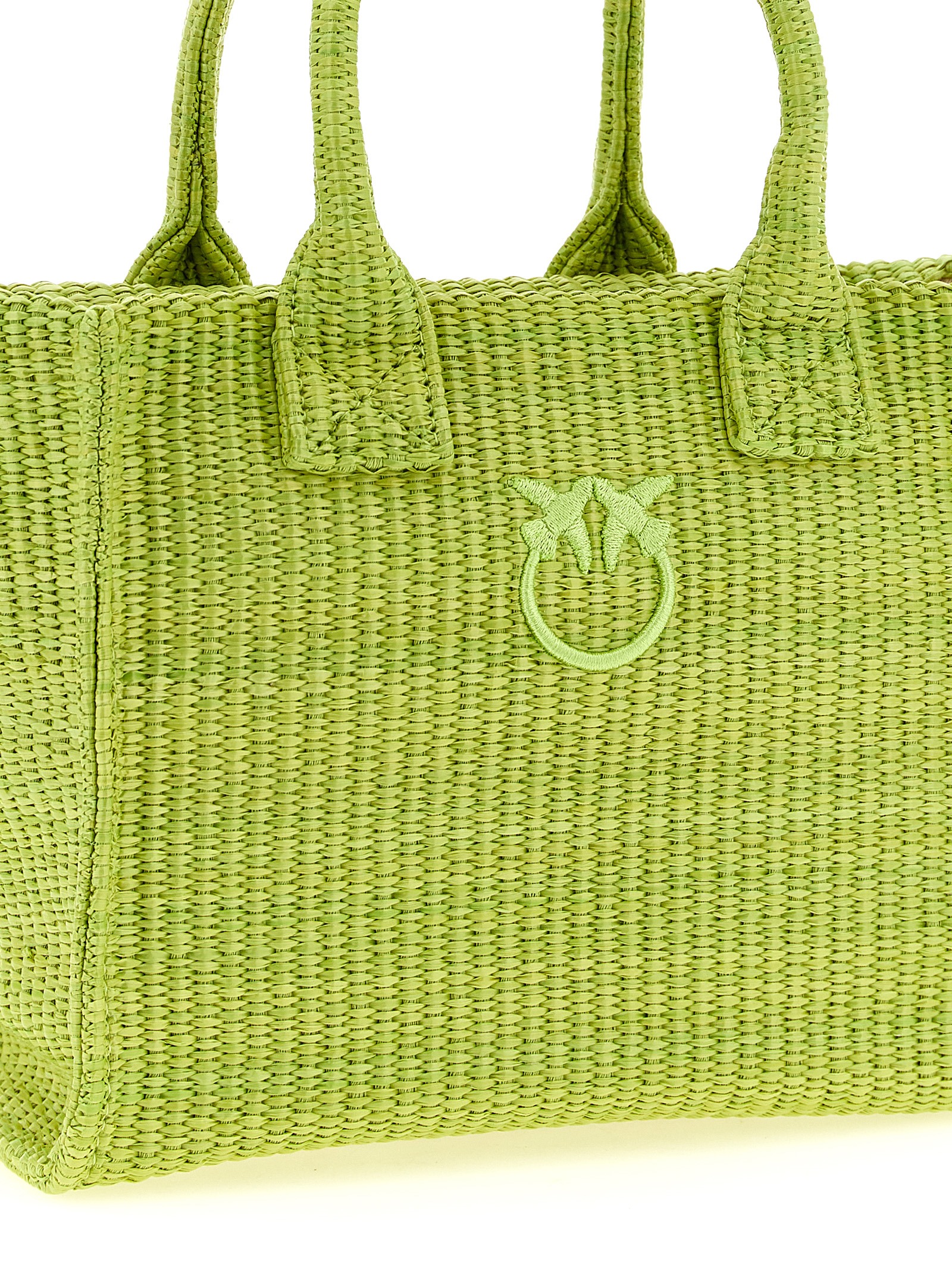 ‘Beach’ mini shopping bag in woven raffia with tonal ‘Love Birds Diamond’ embroidery on the front, double fixed tubular handle, top zip closure, lining, two inner pockets.