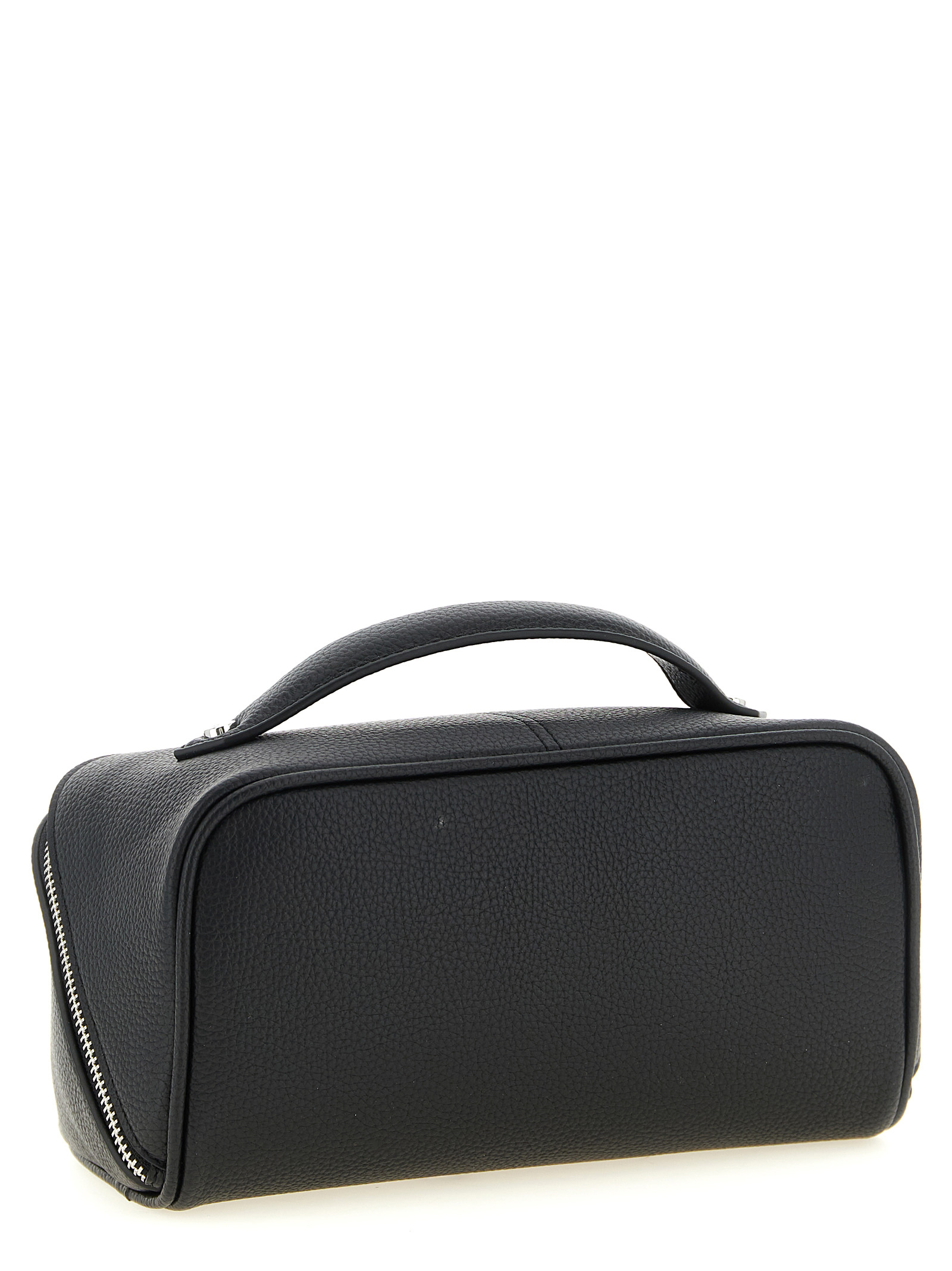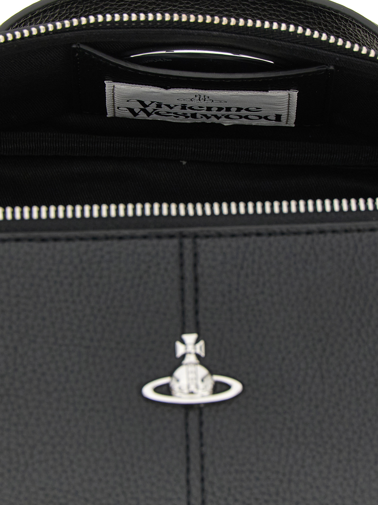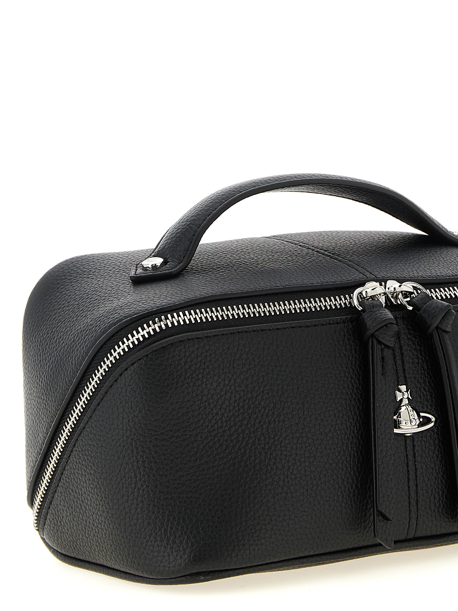 Hammered PU beauty with iconic metal ‘Orb Bas Relief’ pattern on the front, fixed top handle, zip closure, lining, three inner pockets and a removable mirror.