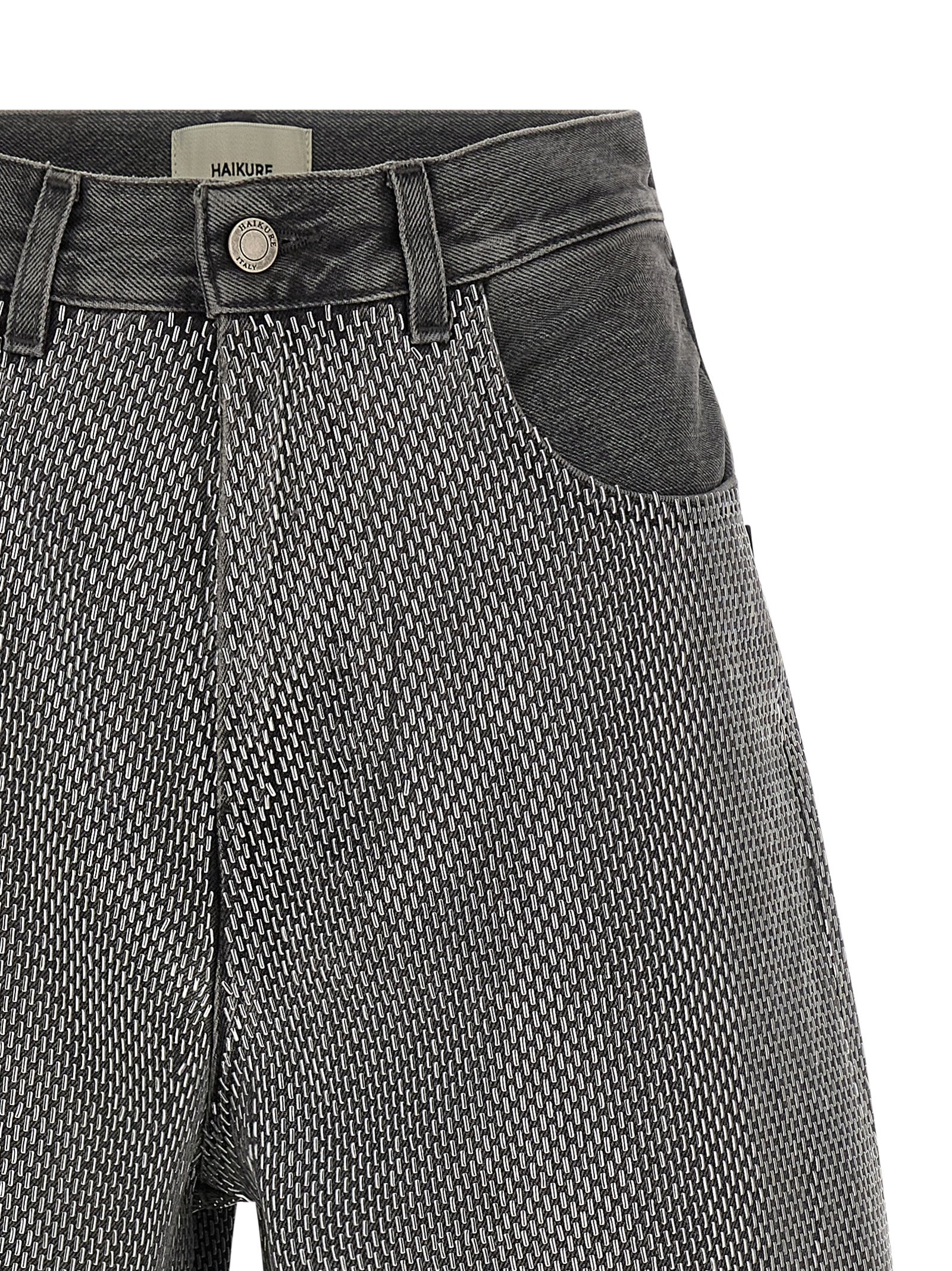 ‘Belle’ cotton denim bermuda shorts with all-over baguette studs, wide leg, front zip and button closure, five pockets, back suede logo tag.