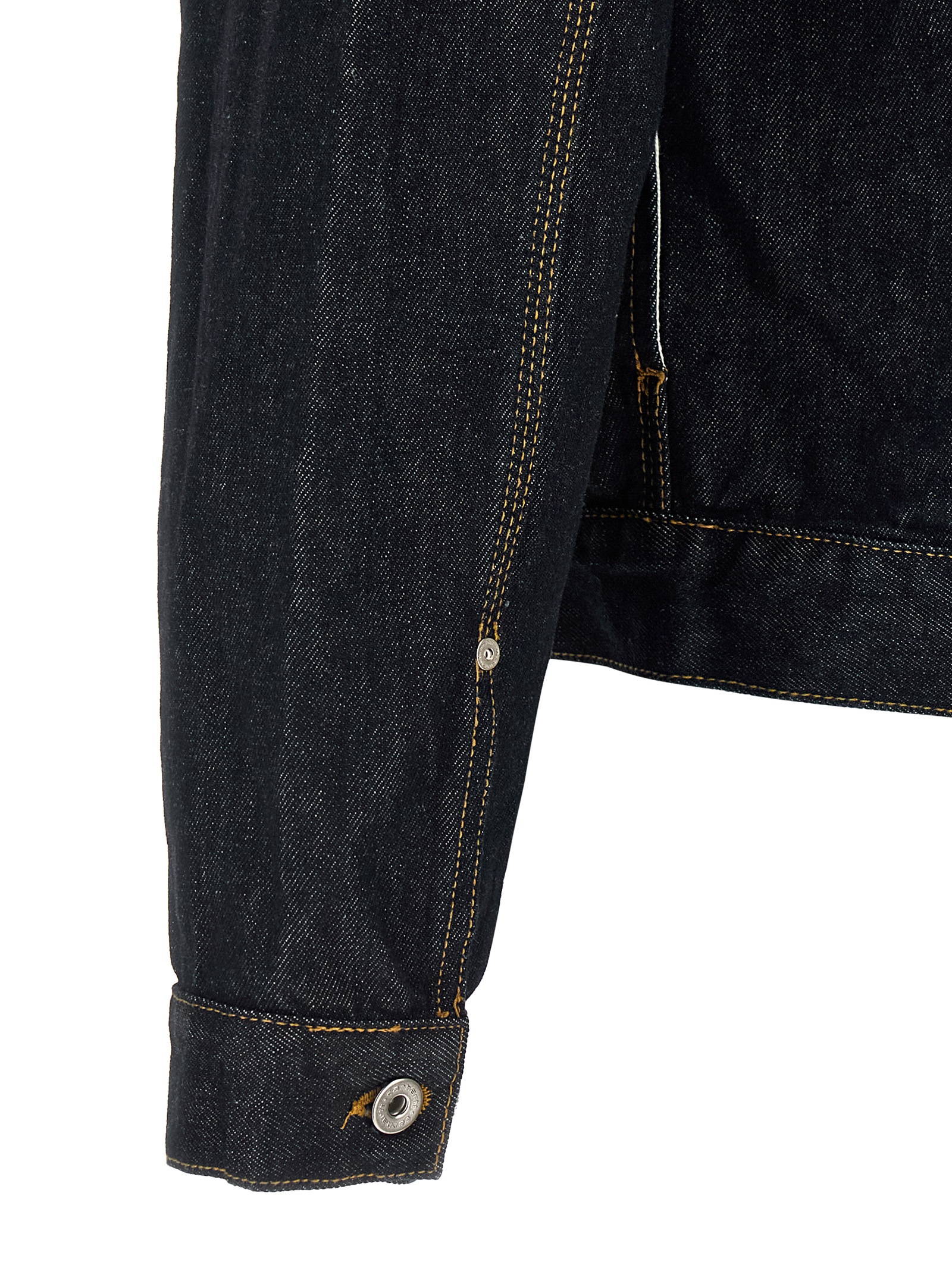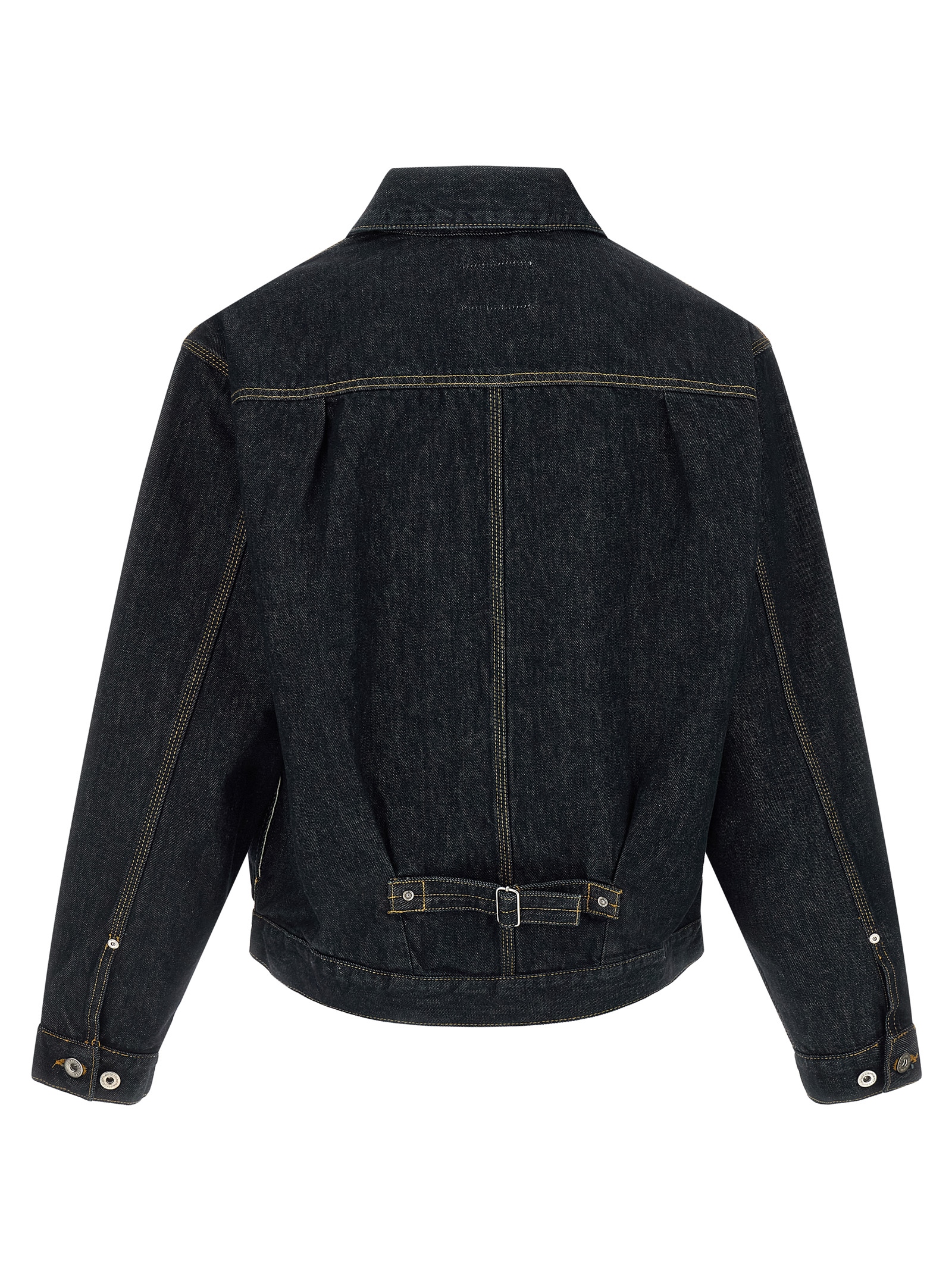 ‘Belmar’ jacket in heavy cotton denim with contrast stitching, metal rivets, shirt collar, logo patch and front metal button closure, pockets, long sleeves with adjustable cuffs and dropped shoulders, adjustable back strap.
