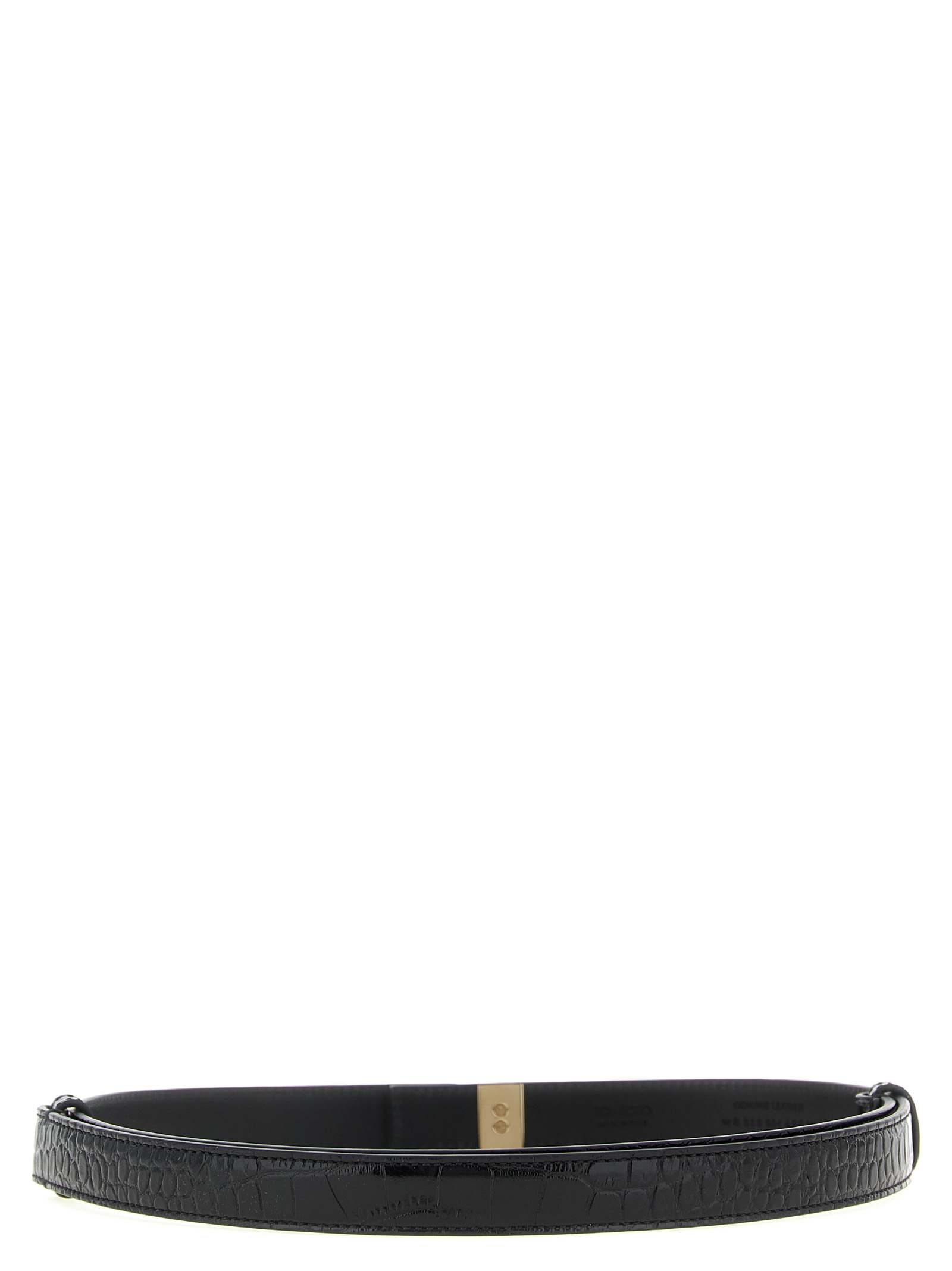 Croc print leather belt, metal buckle with T-closure, adjustable.