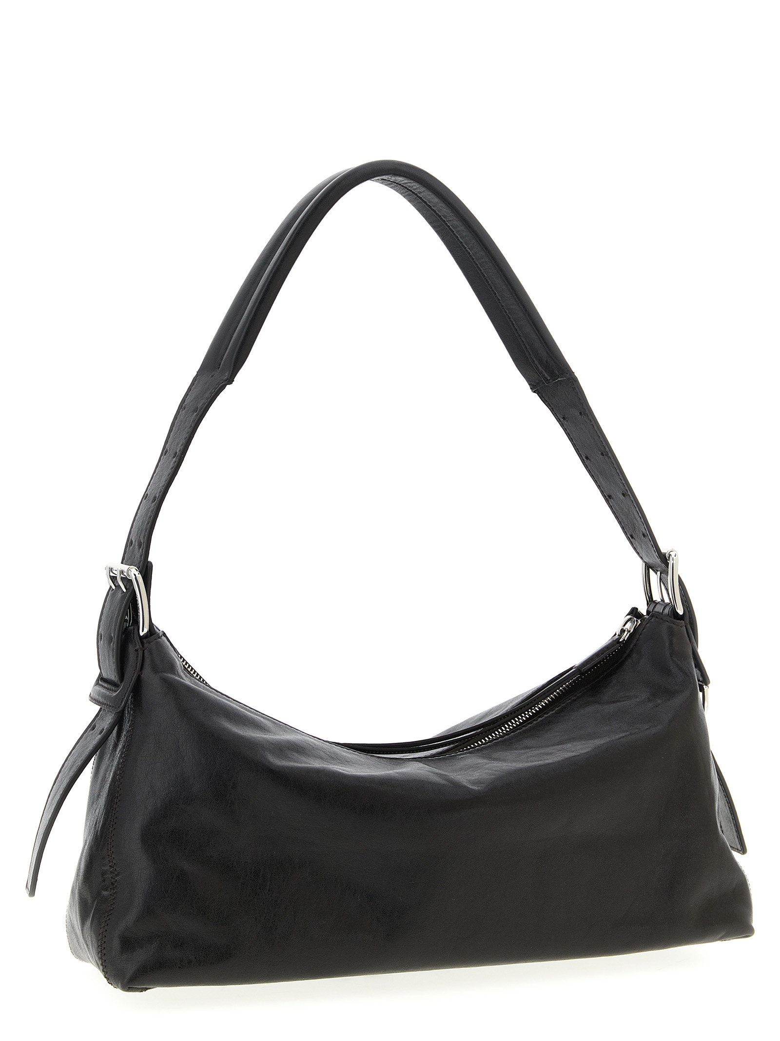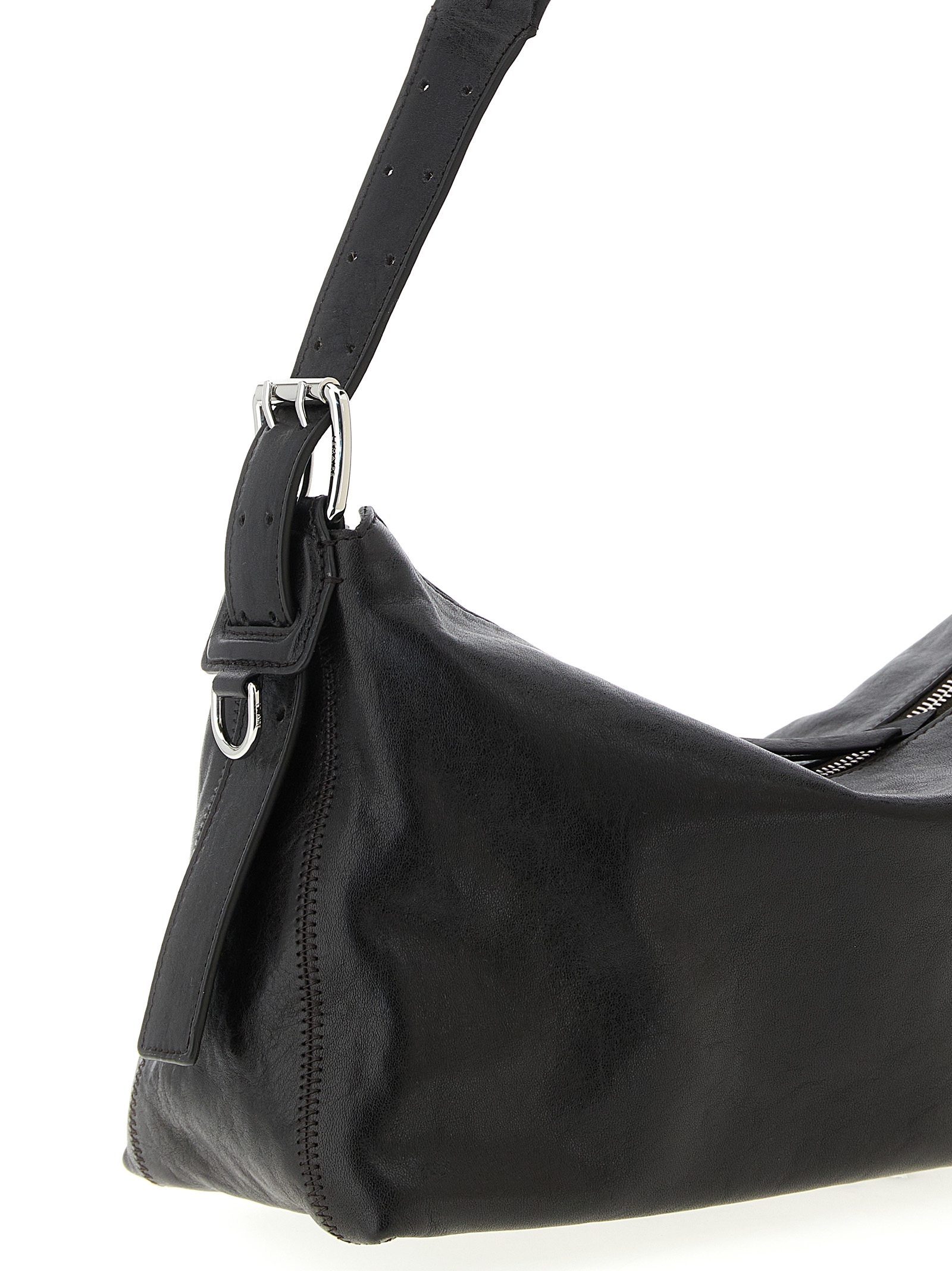 Belted Baguette’ baguette shoulder bag in LWG Gold-certified paper lux leather with top zip closure, adjustable and removable belt-style handle with double-pin metal buckles, tone-on-tone zigzag stitching side trim, removable reinforced leather base, cross-belt construction on the bag bottom.