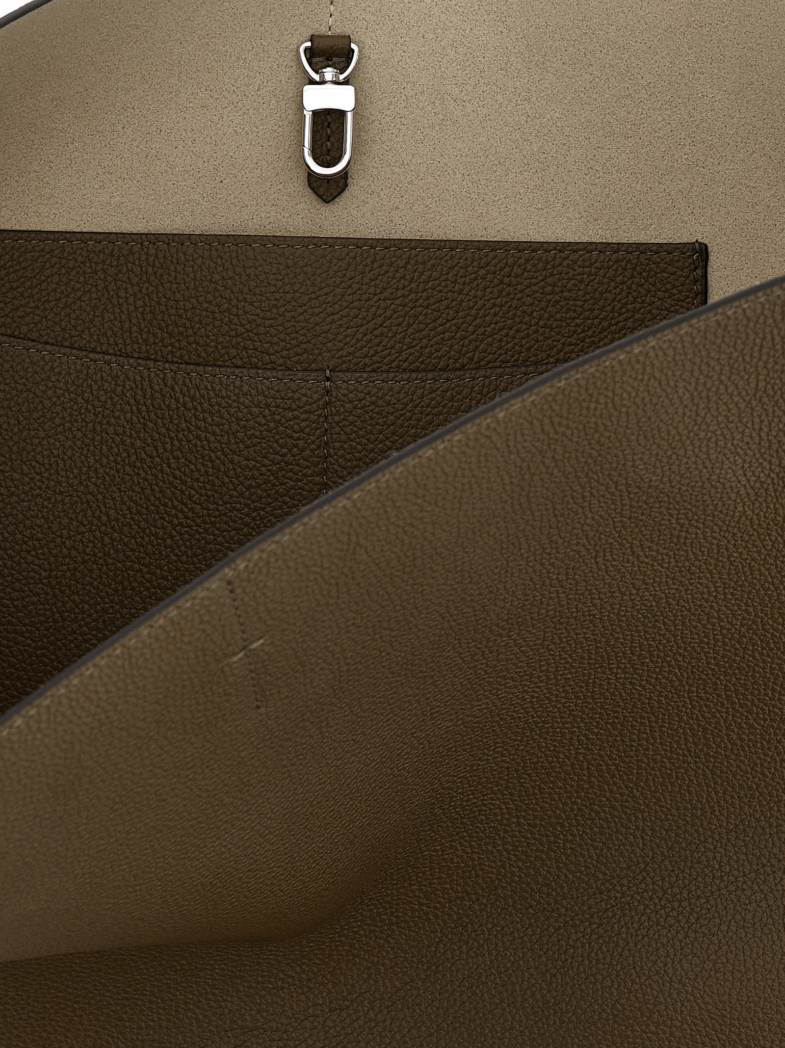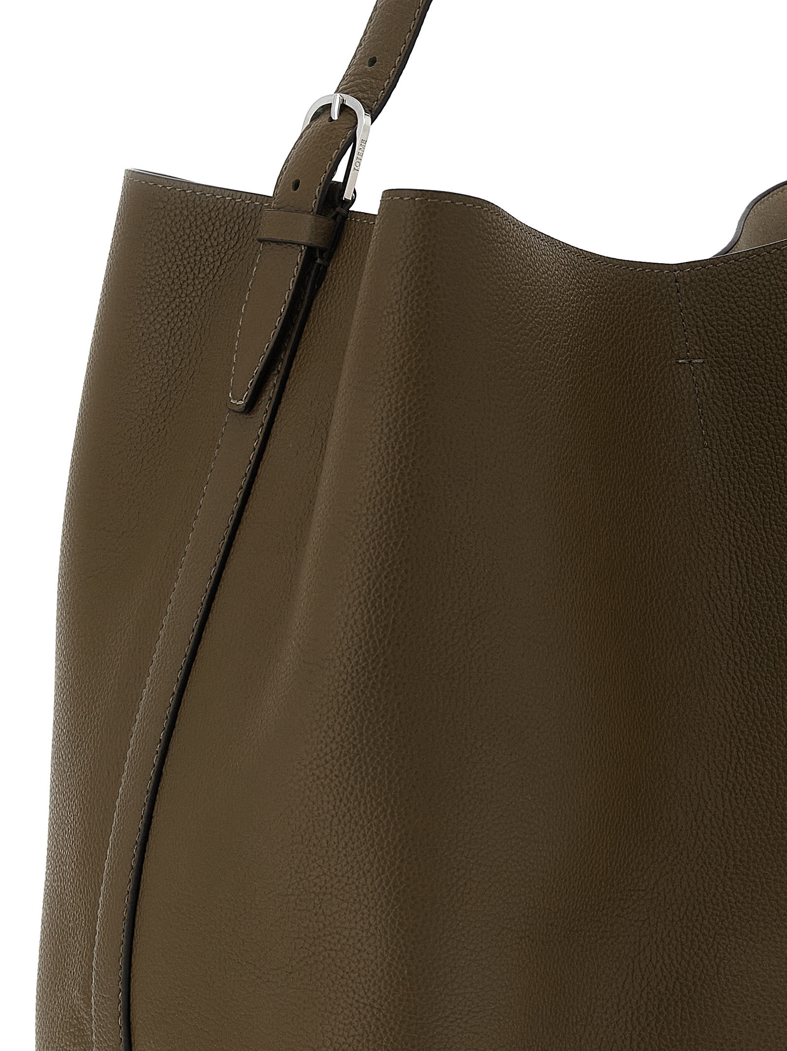 ‘Belted grained-leather’ handbag with adjustable handle with buckle, metal hook closure, silver metal details.