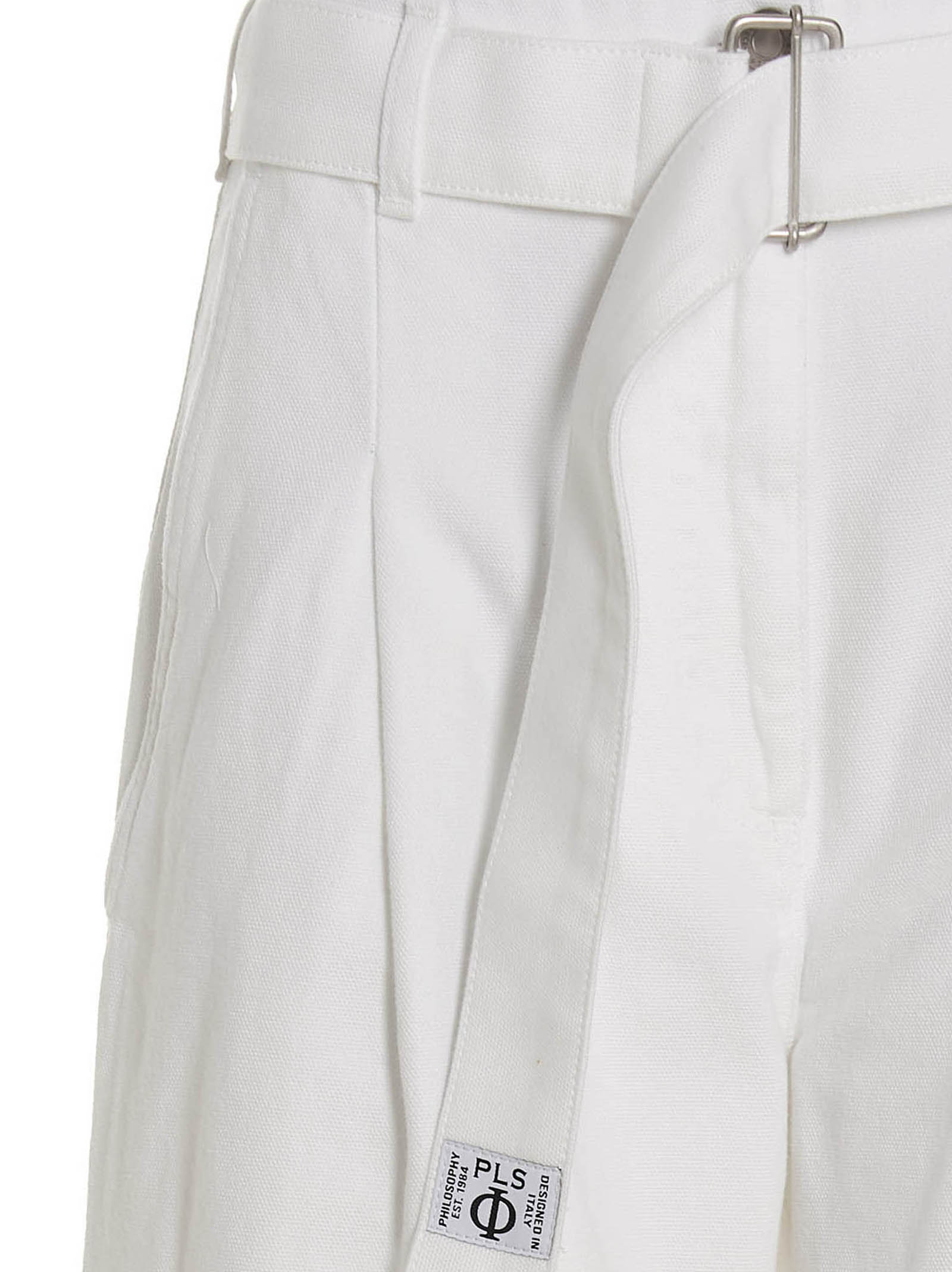 Cotton denim jeans with removable waist belt, a zip and button closure, pockets, front pleats and a loose leg.