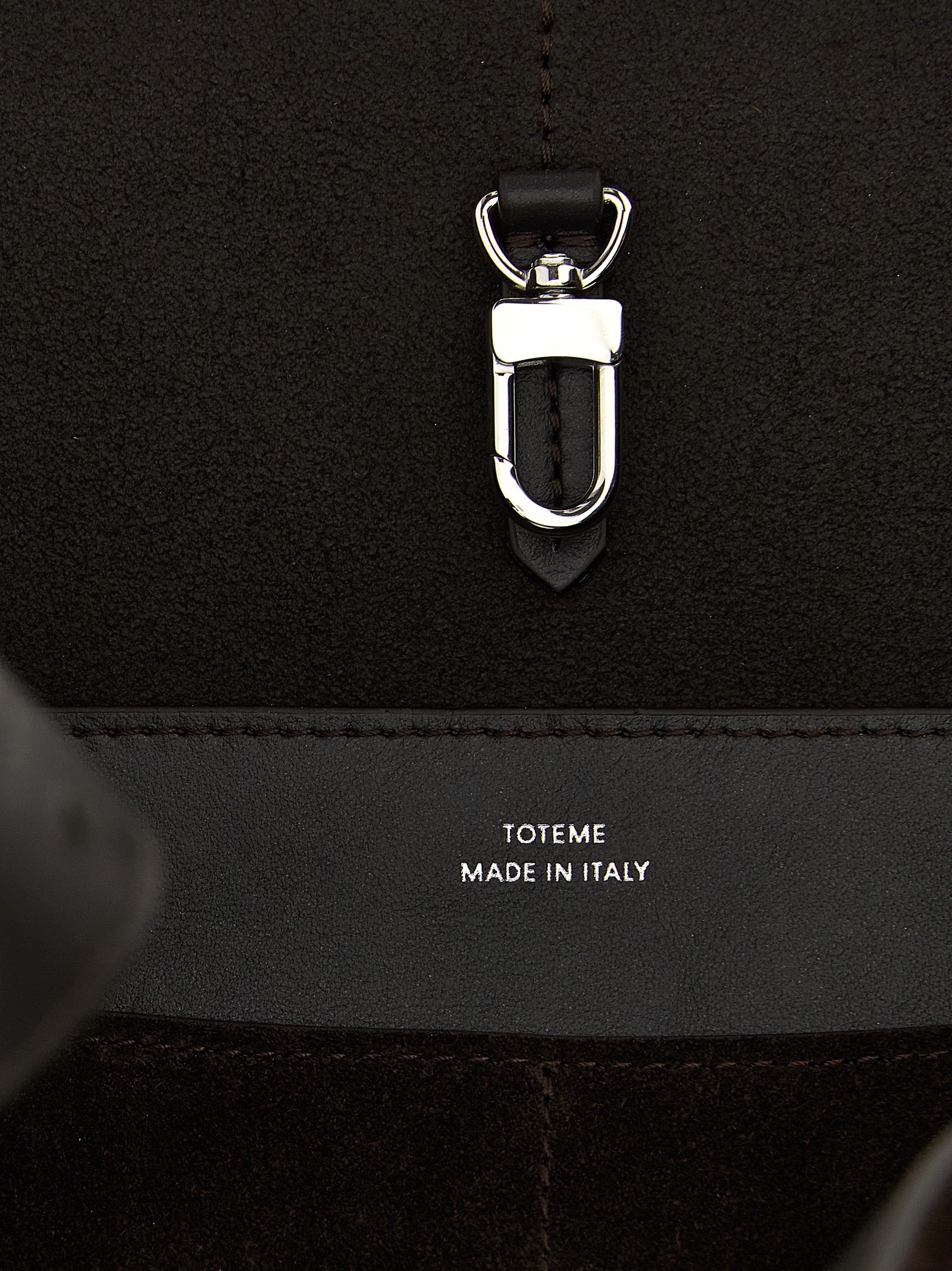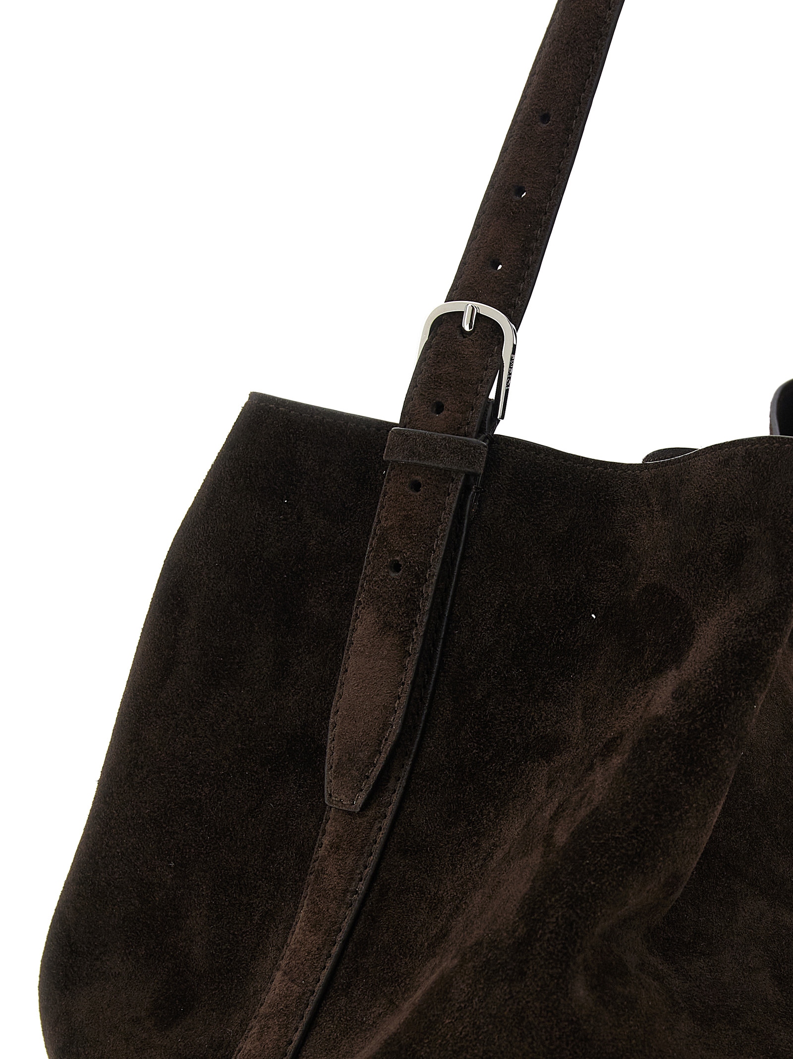 Belted Tote suede shoulder bag with adjustable handle, and metal hook closure.