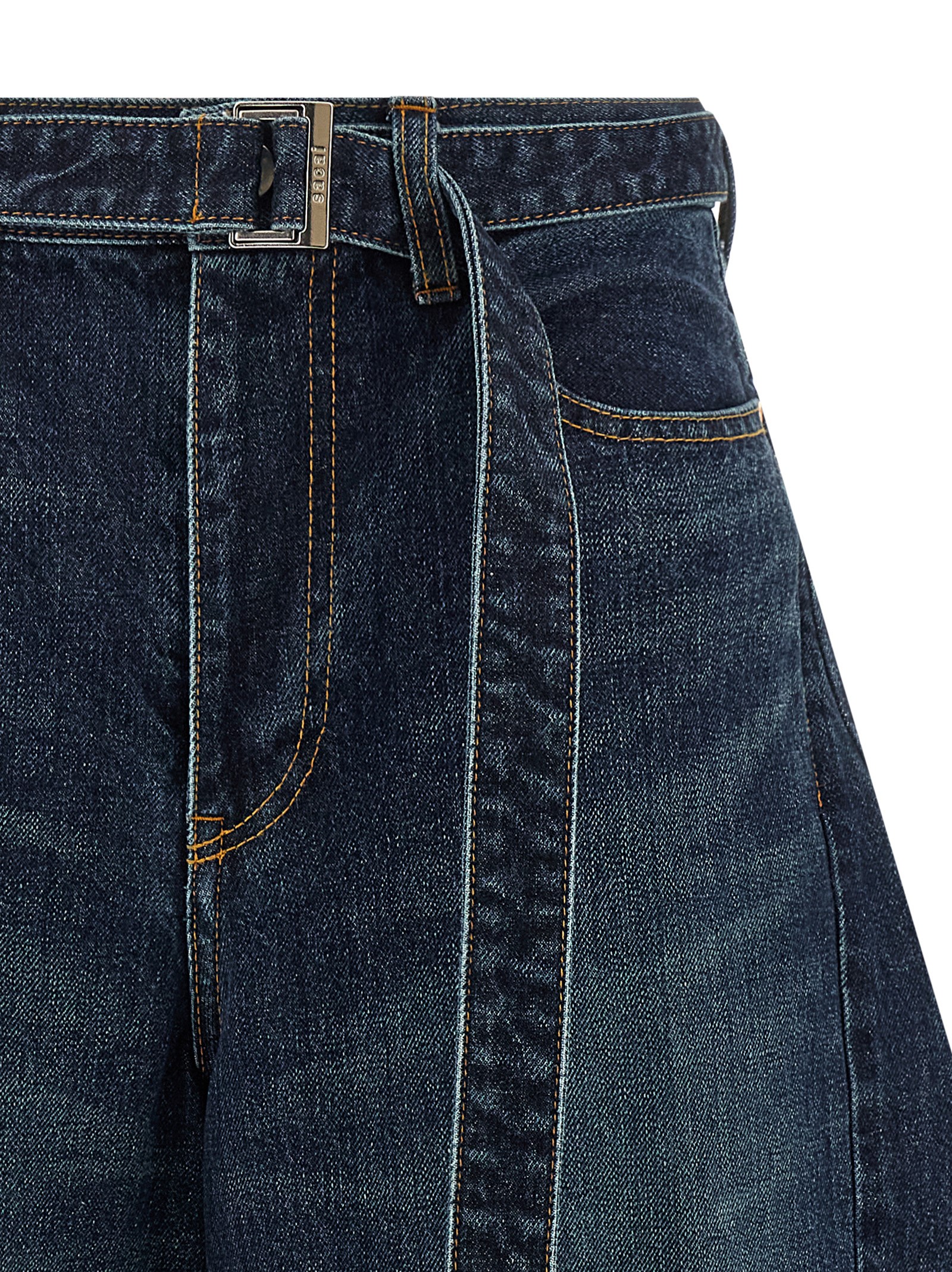 Cotton denim bermuda shorts with contrast stitching, wide curved leg, zip and front button closure, five pockets, removable belt.
