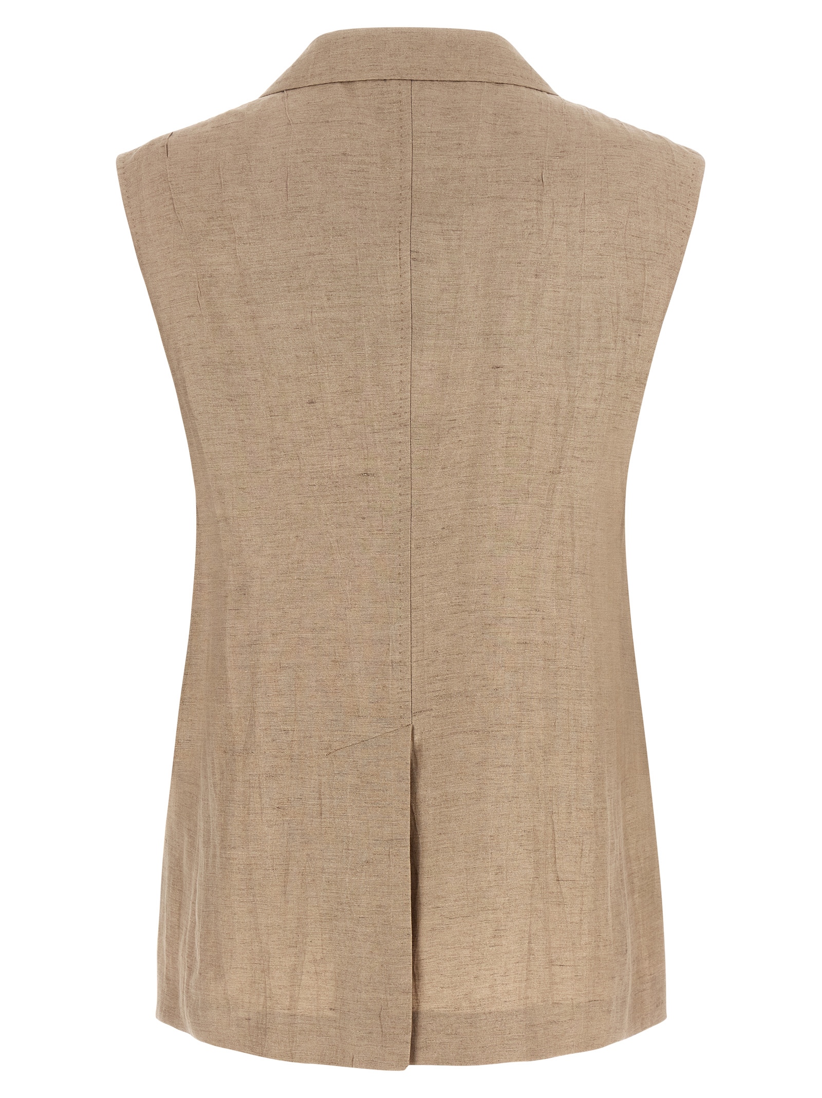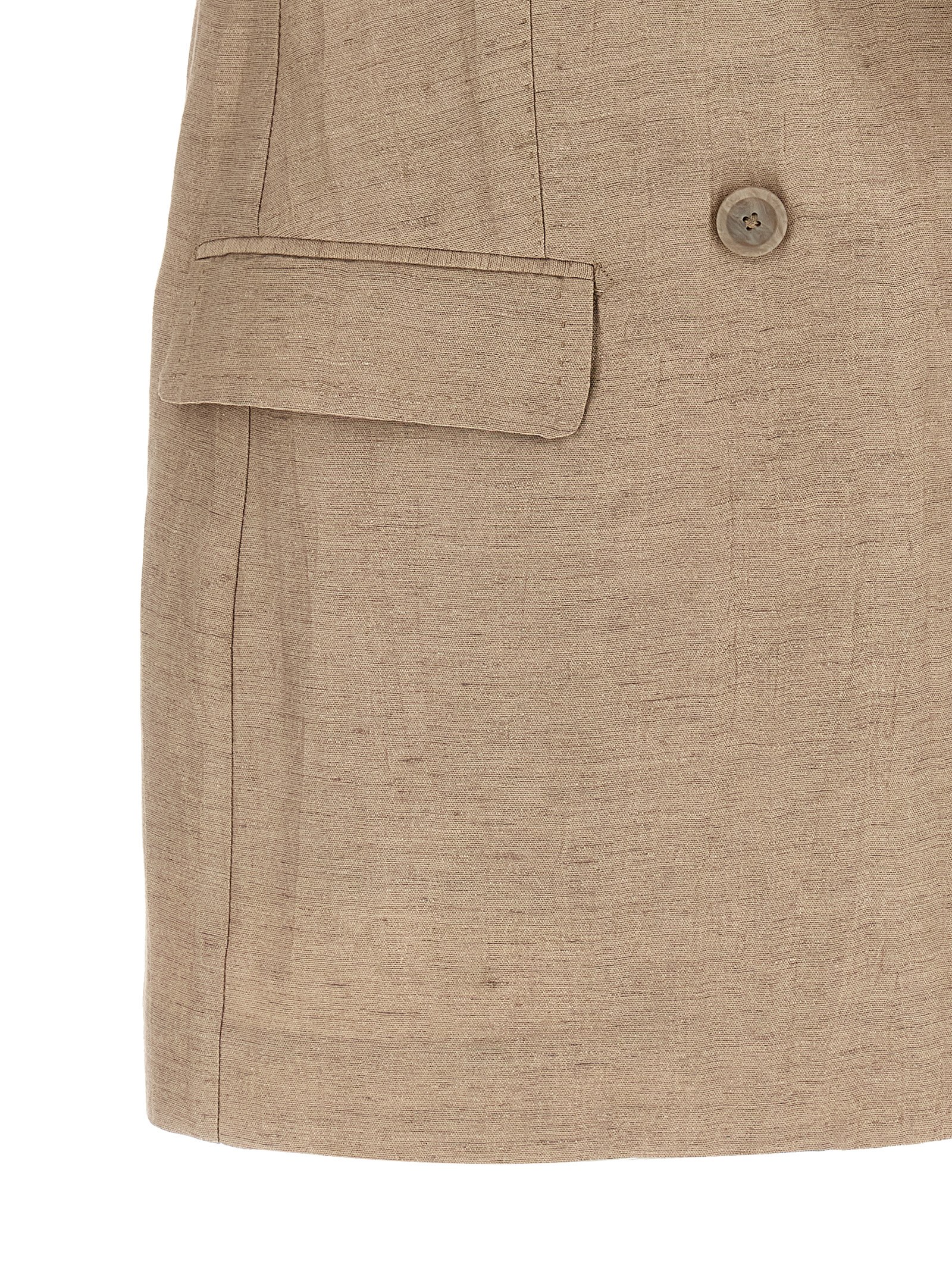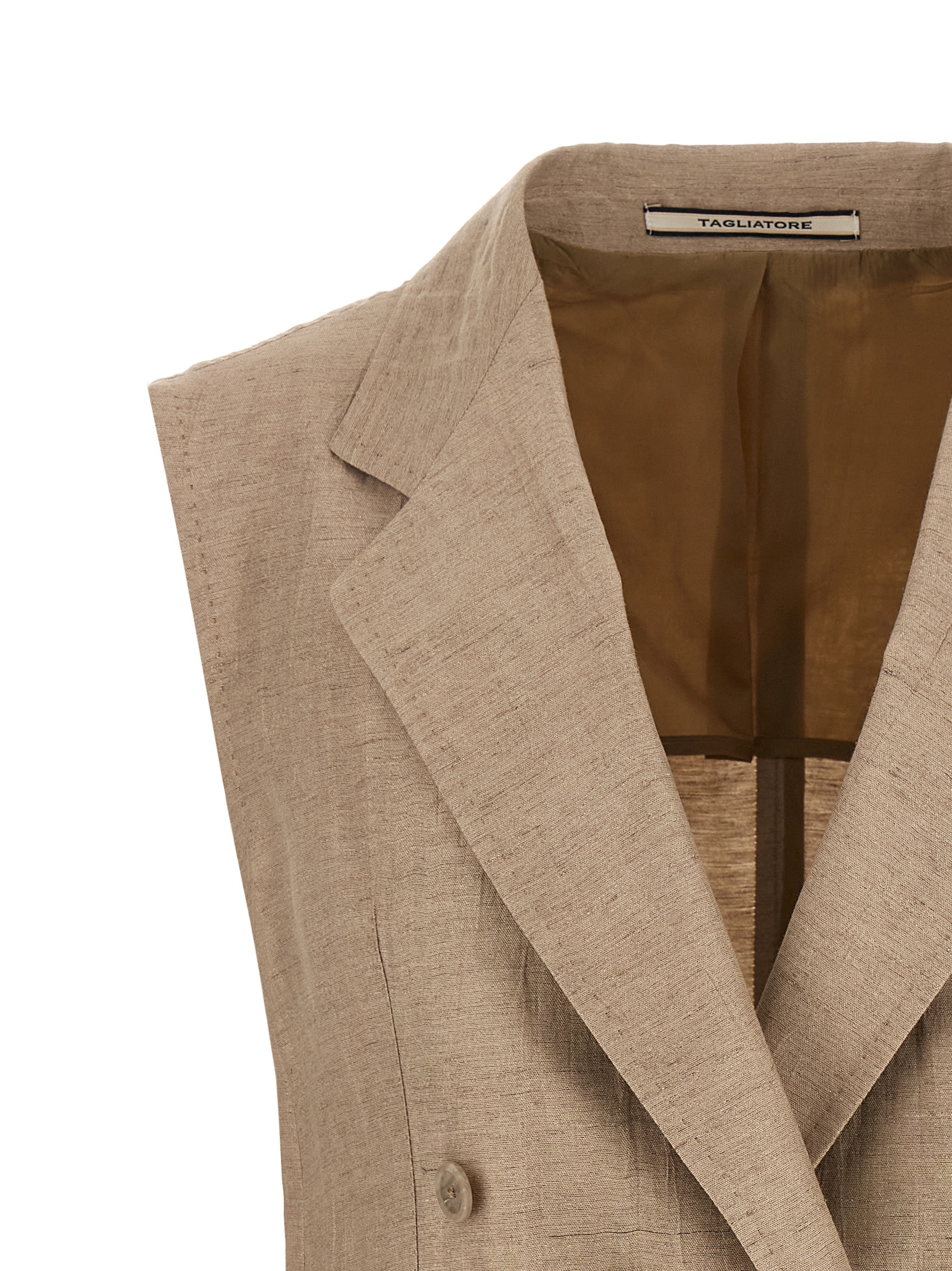 ‘Bernice’ wrinkled-effect wool and linen blend vest, double-breasted blazer style with front horn button closure, mirror lapels, flap pockets, back split and half lining.