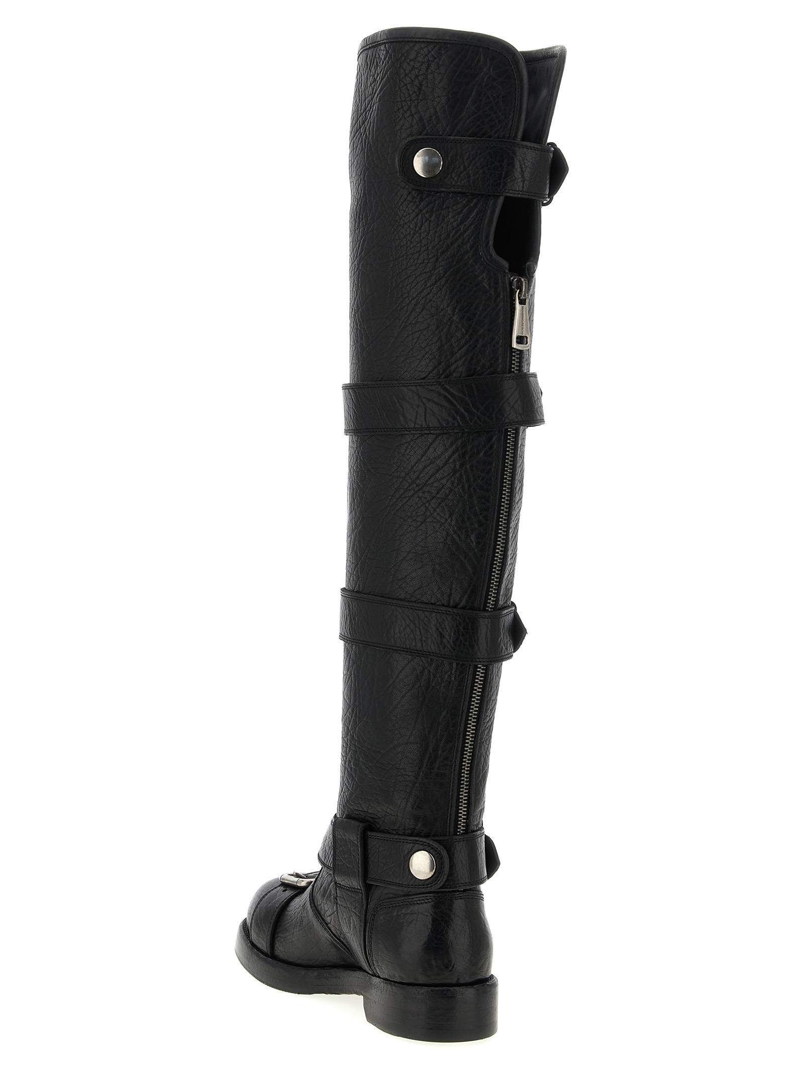 ‘Bernini’ hammered horse leather boots, biker-inspired model, rounded toe, adjustable straps, back zip closure, leather sole with non-slip VIBRAM® rubber island.