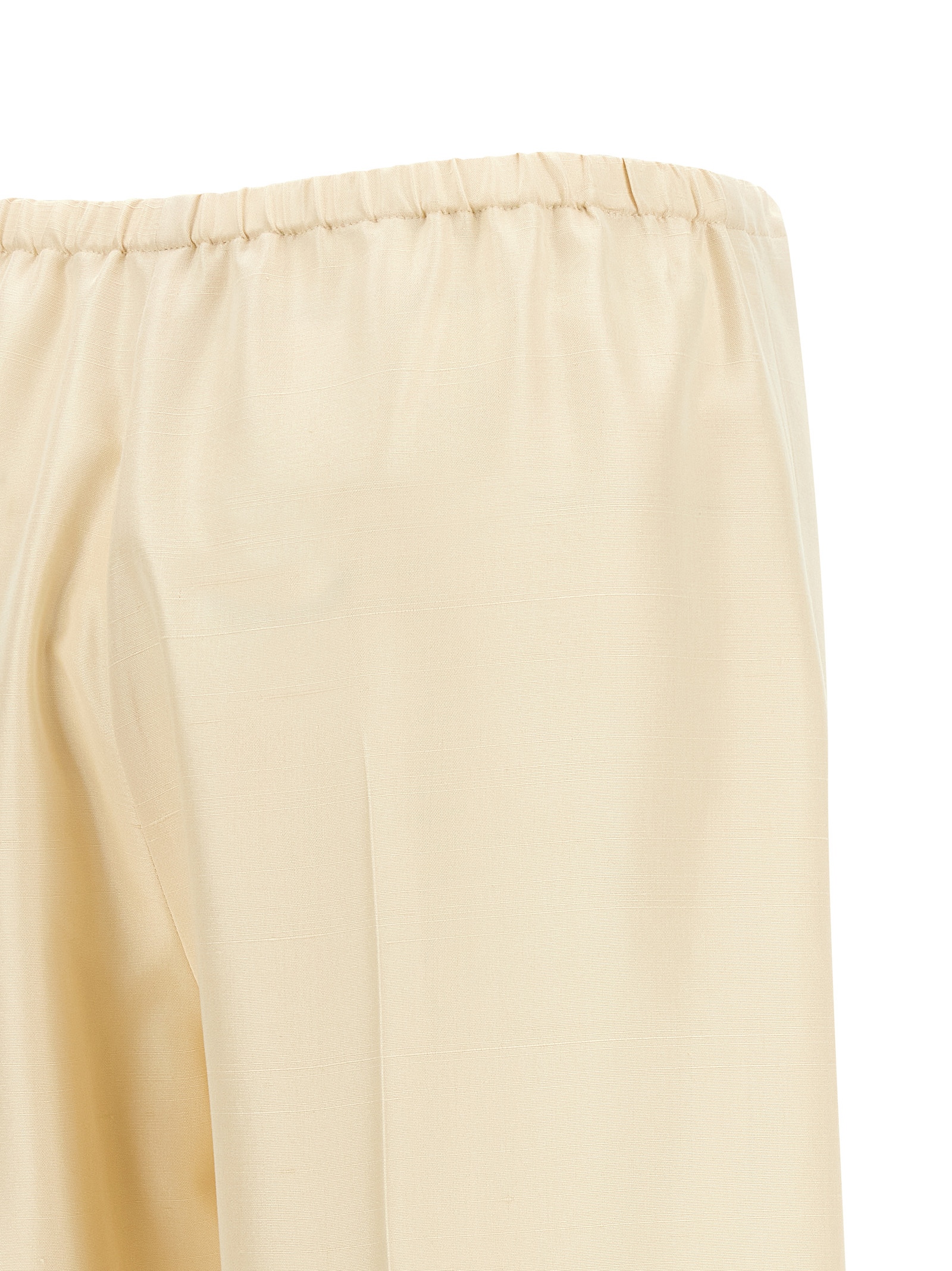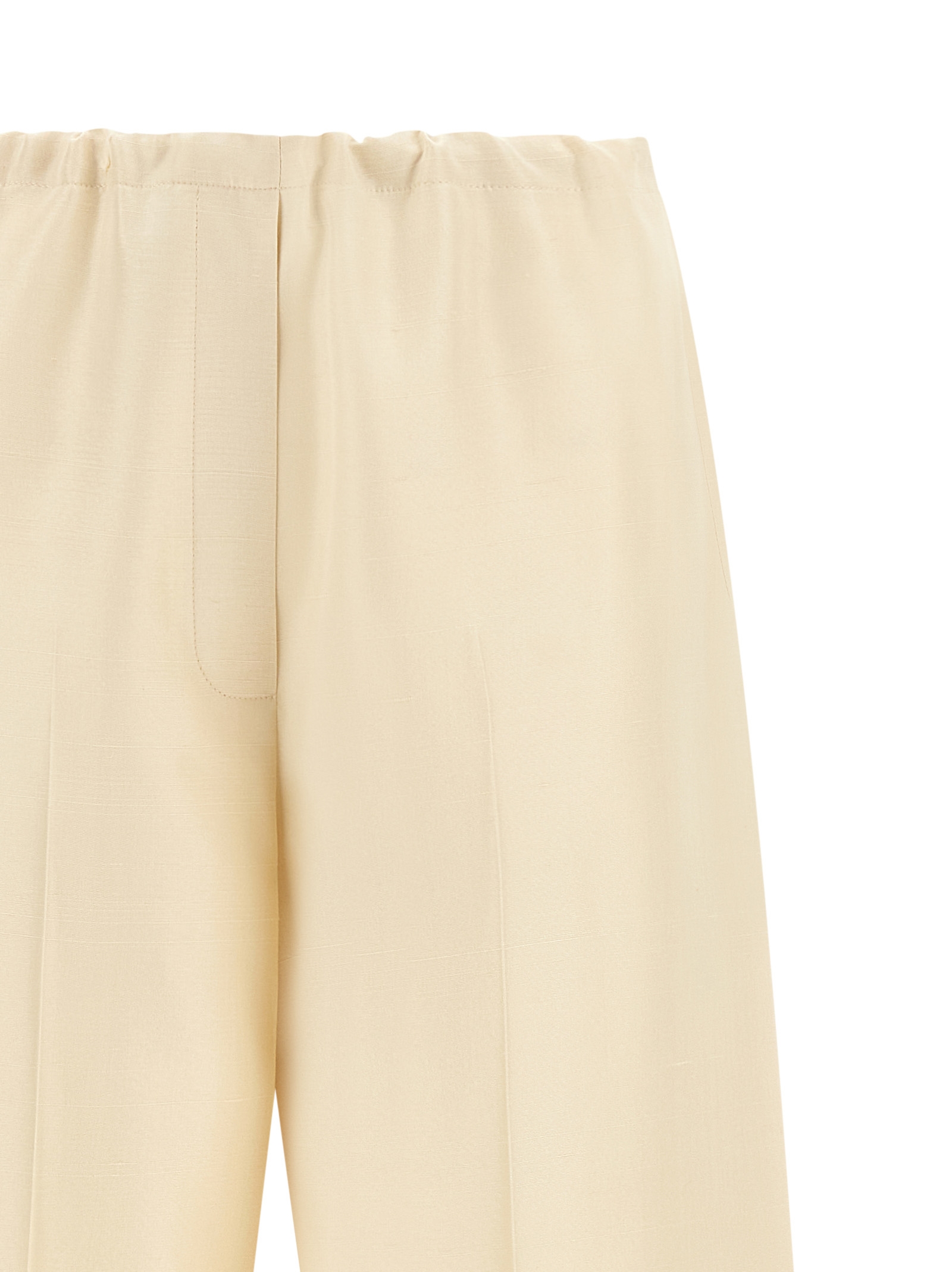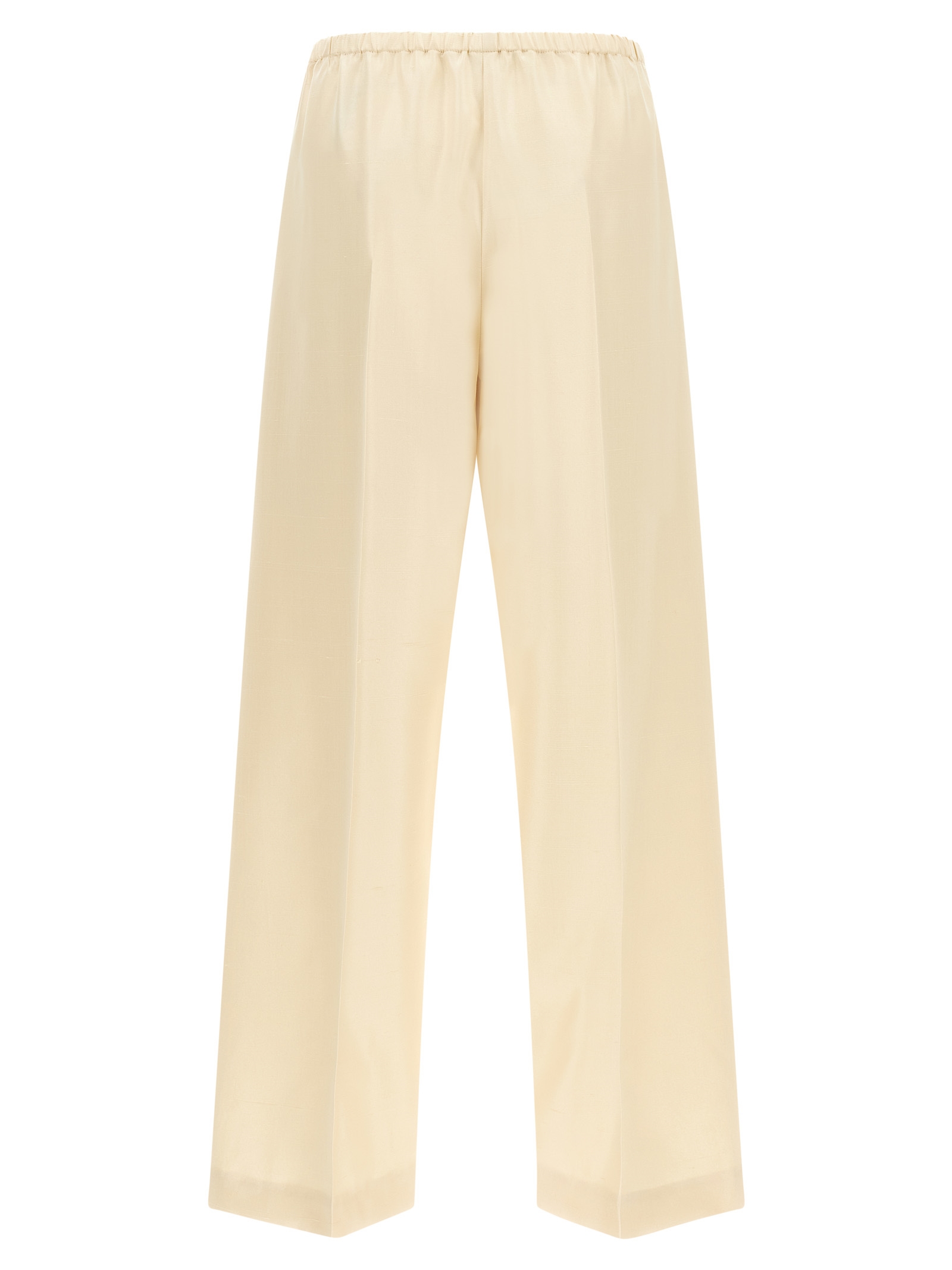 ‘Beta’ pants in richly worked silk shantung, pajama style, low waist, straight leg, stretched pleat, back elastic and drawstring at the waist, trompe l’oeil flap.