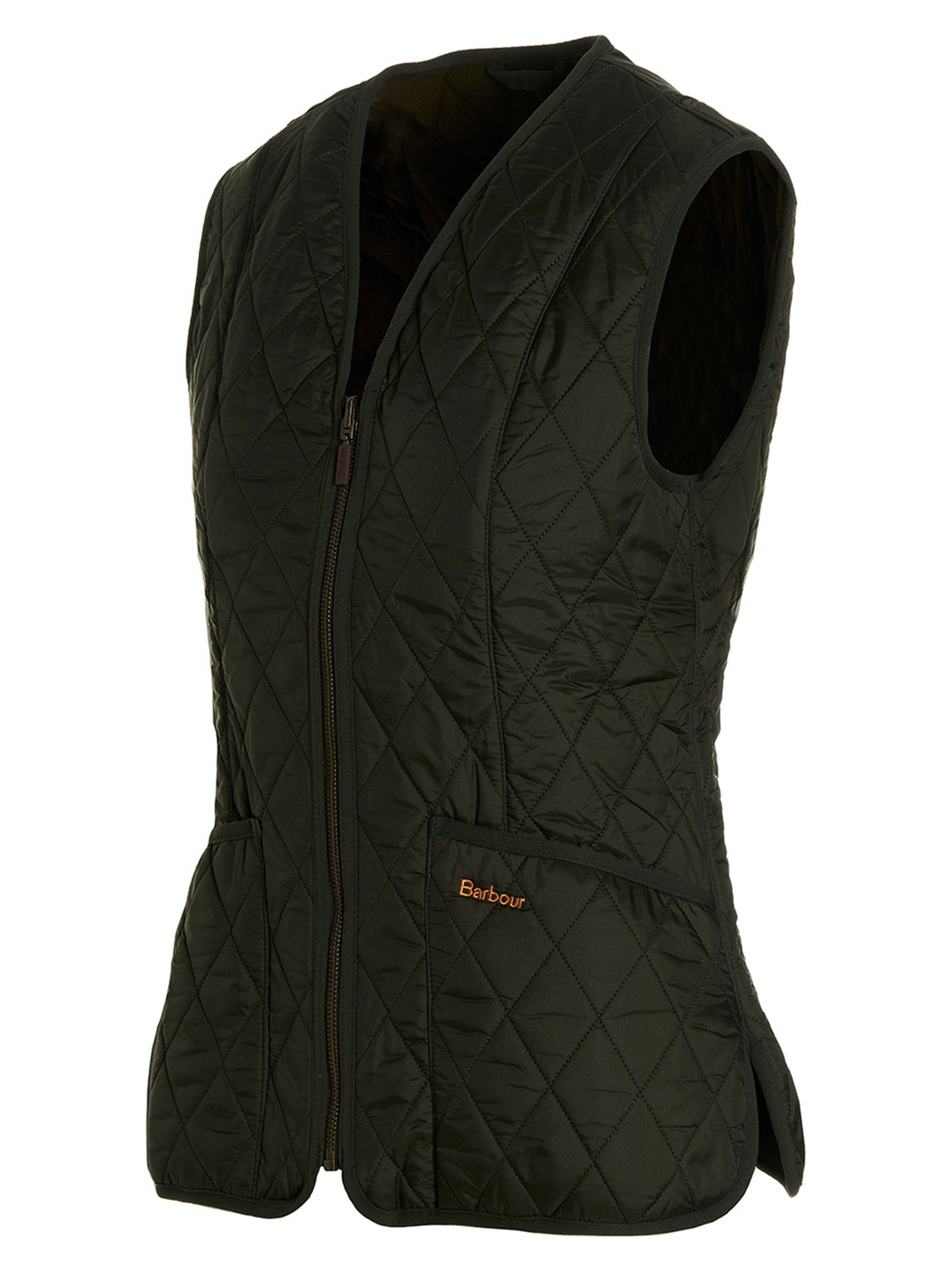 Quilted ‘Betty’ vest, fleece lining, patch pockets with embroidered logo, and zip closure.
