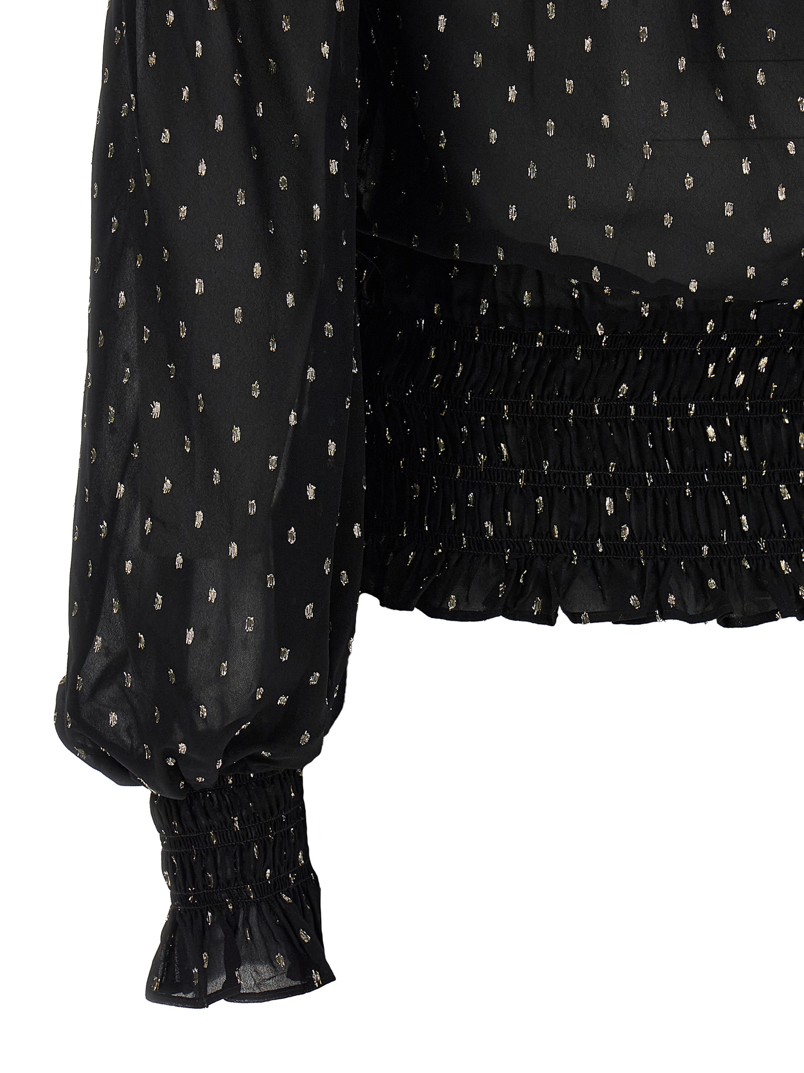 ‘Black And Gold Chiffon’ metallic fil coupé top, off-the-shoulder model with upper smock stitch, on the hem and in the cuffs, flounces, long sleeves with cuffs.
