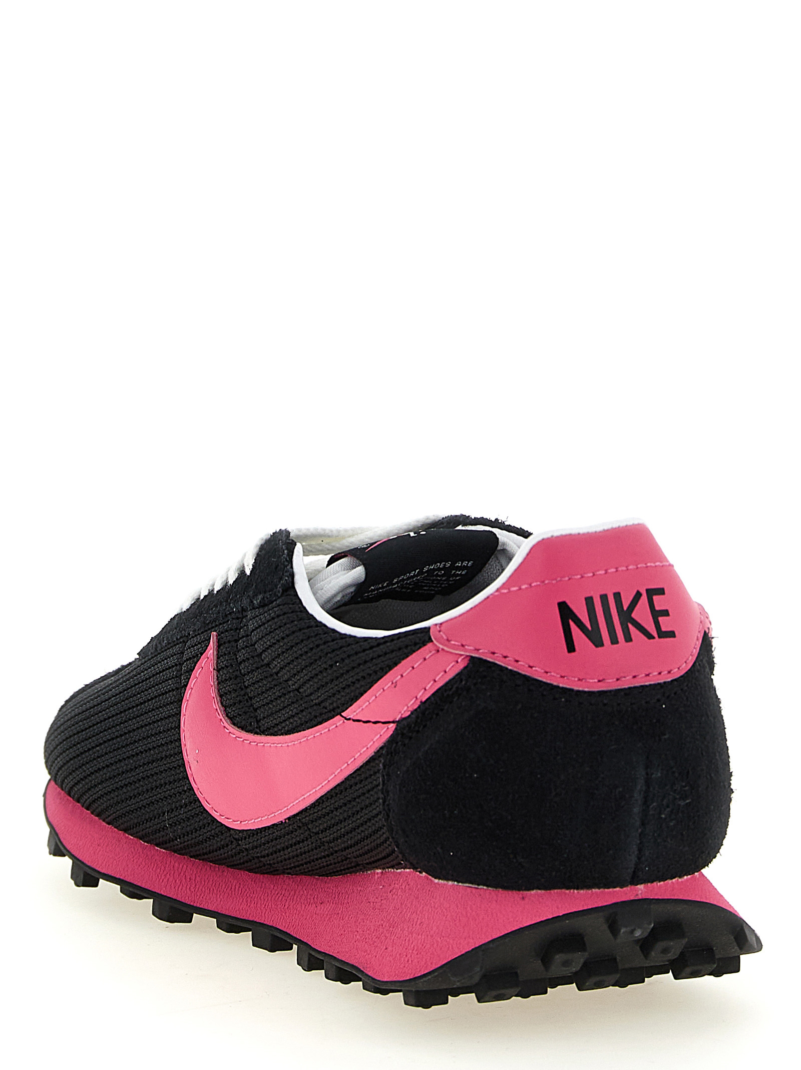 Black Comme Des Garçons x Nike ‘LD-1000’ sneakers in suede and durable, breathable fabric with contrasting smooth leather detailing, side ‘Swoosh Nike’, embossed logo on the heel and tongue, lace-up closure, foam midsole, flared heel, and rubber tread with waffle pattern.