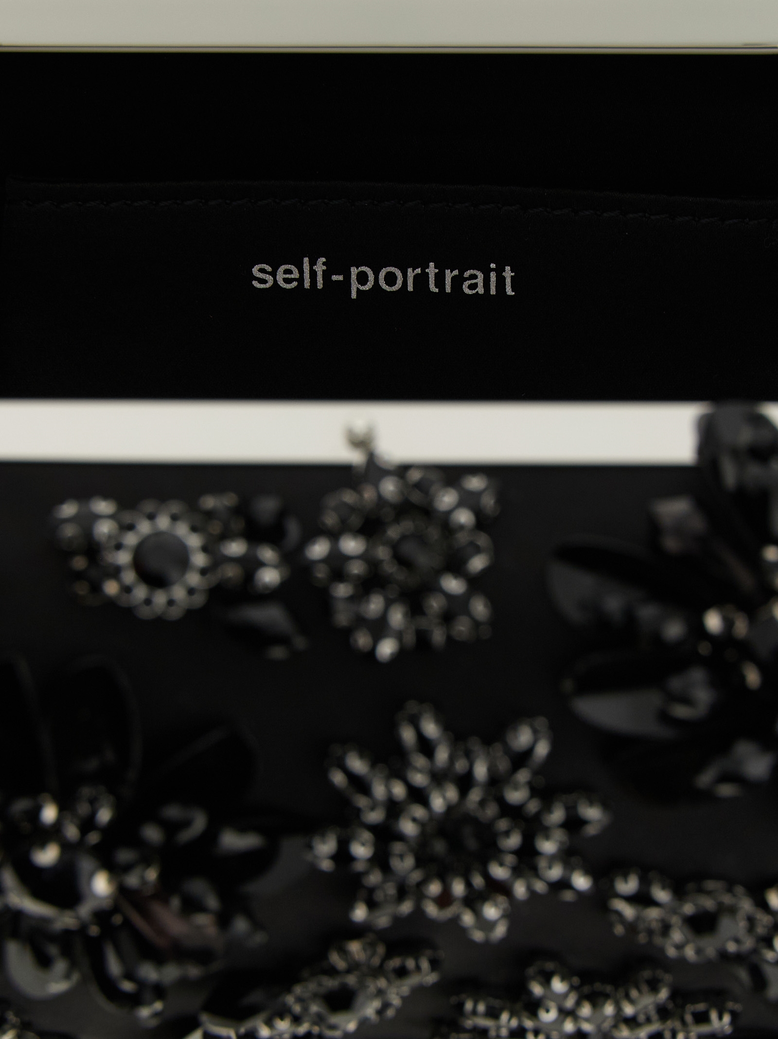 Black Satin Floral Crystal’ satin clutch with front floral embroidery in beads and crystals, interlocking closure with top jewel bow application, removable chain shoulder strap.