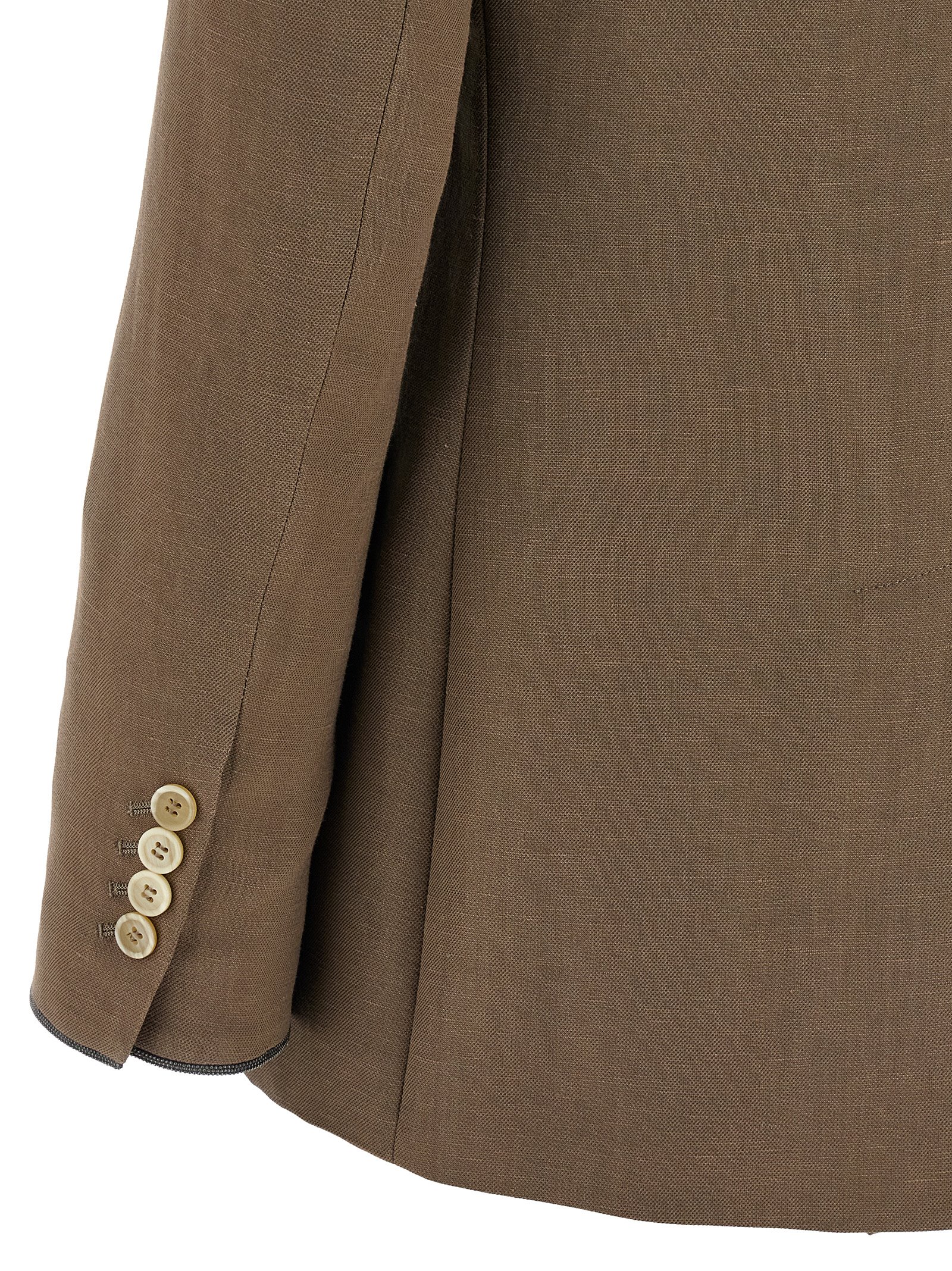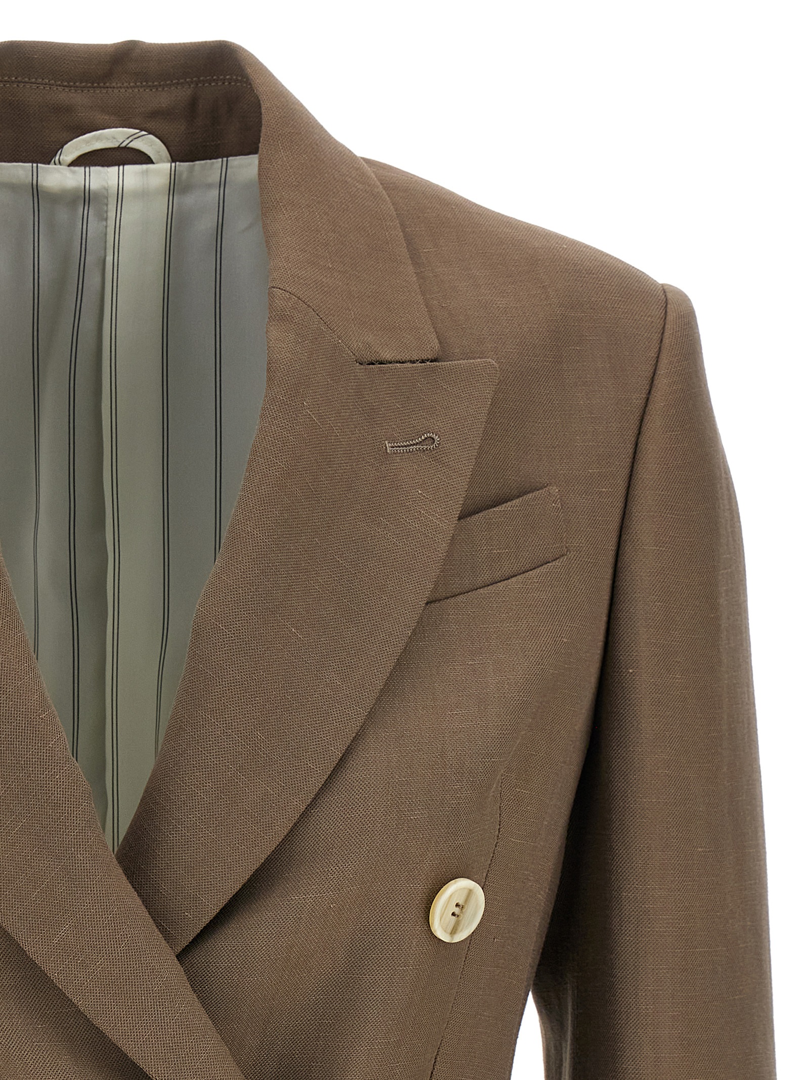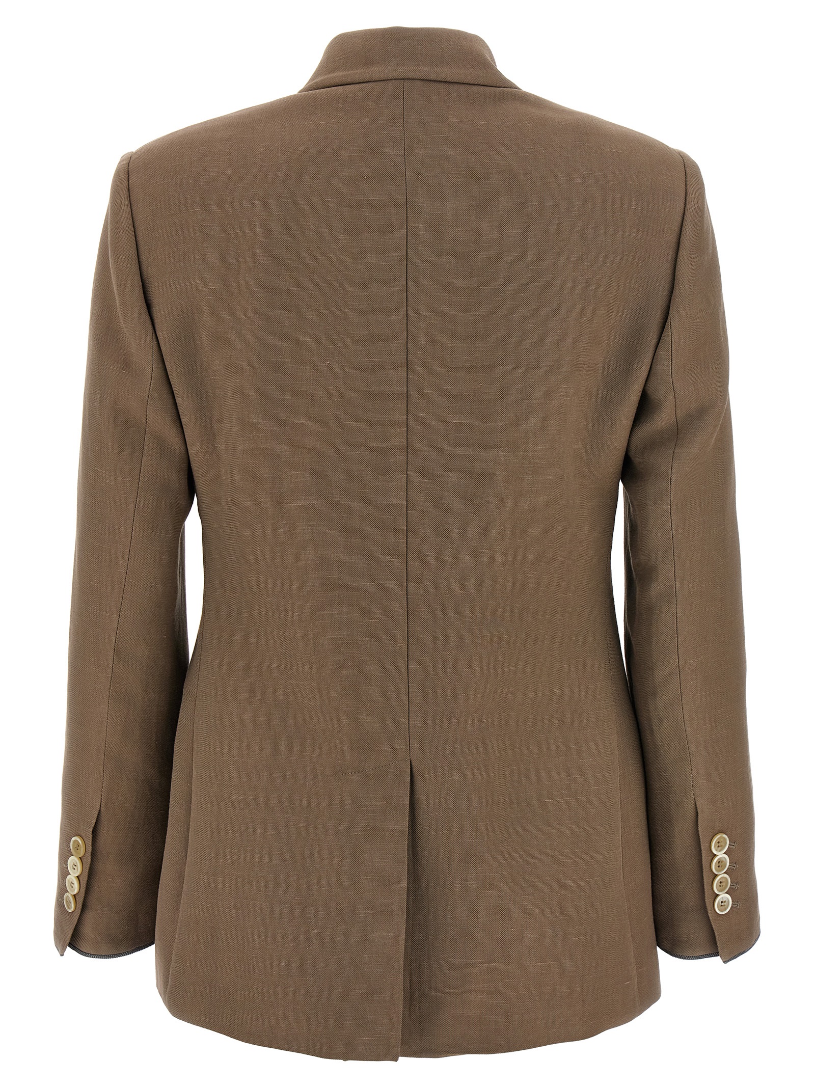 Double-breasted Fluid viscose and linen twill blazer with front button closure, peak lapels, breast pocket, flap pockets, padded shoulder strap, long sleeves with Monile ‘Shiny Cuffs’ detail, back vent, blend lining