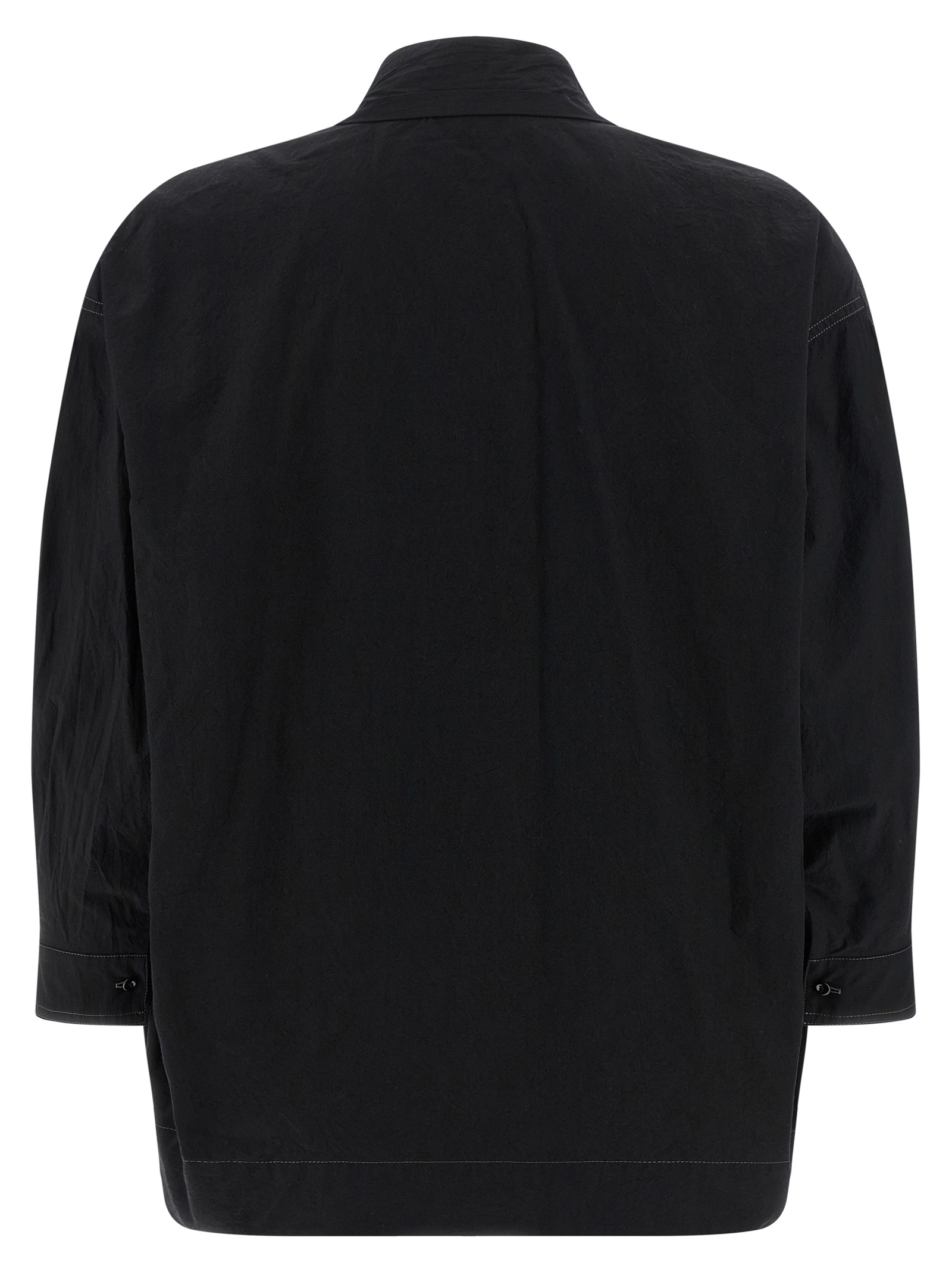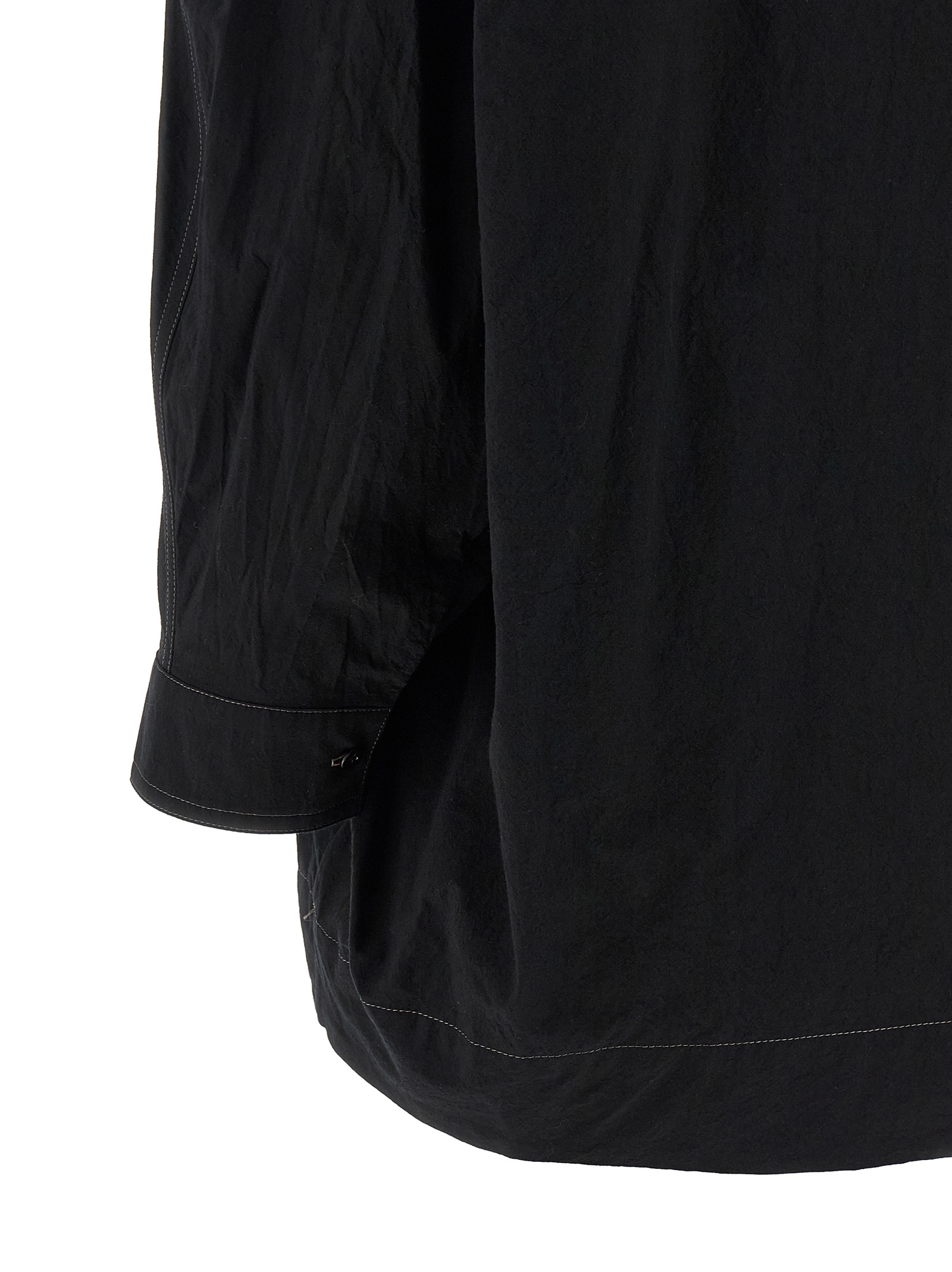 Cotton blouse, V-neck with knotted scarf with resin beaded decorations, 3/4 raglan sleeves with cuffs and buttons, contrast stitching.