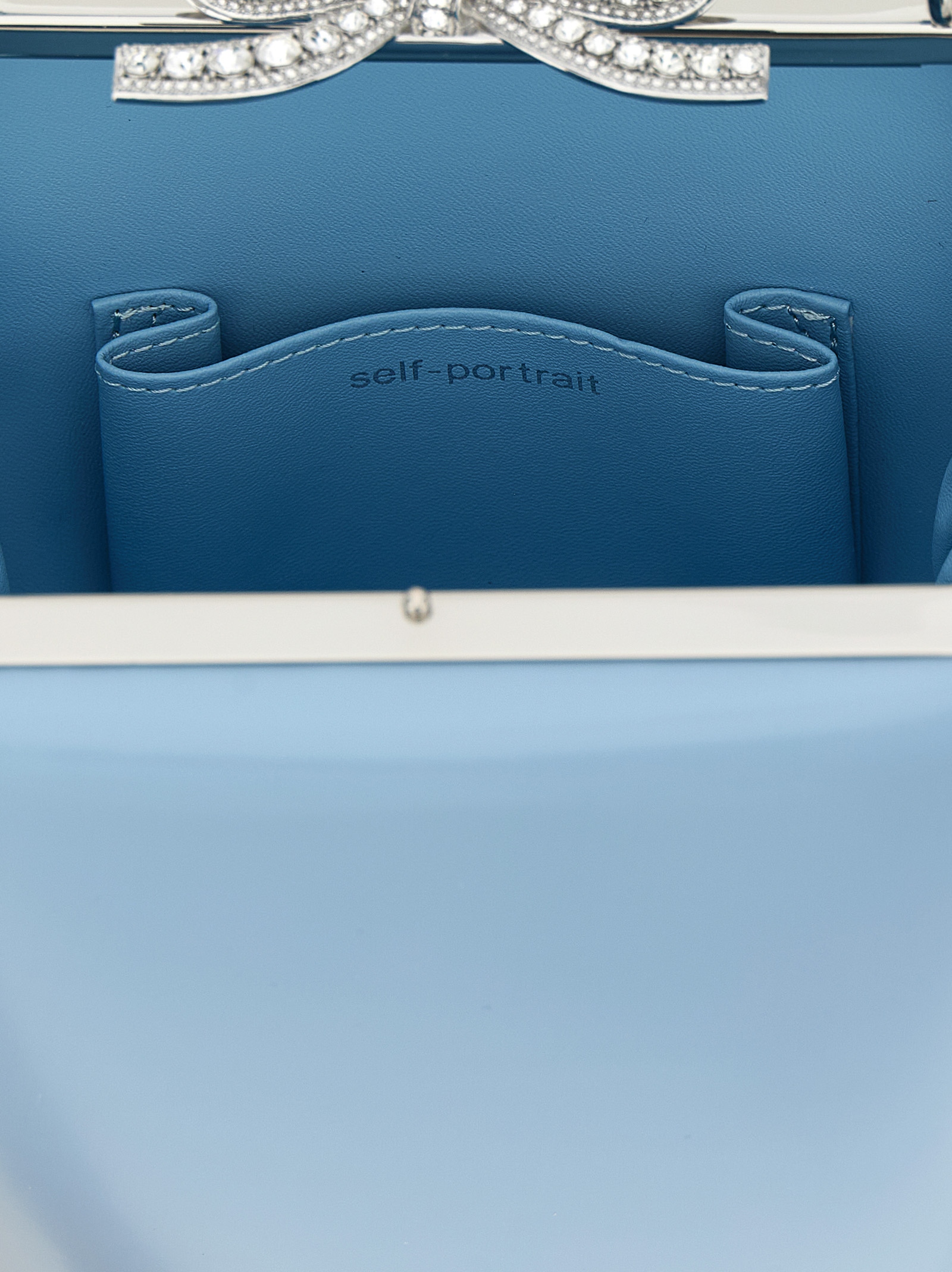 ‘Blue leather bag’ leather handbag with metal details, fixed handle, snap closure with rhinestone metal bow detail, front logo print.