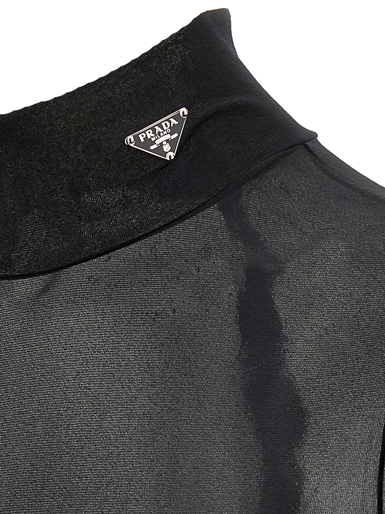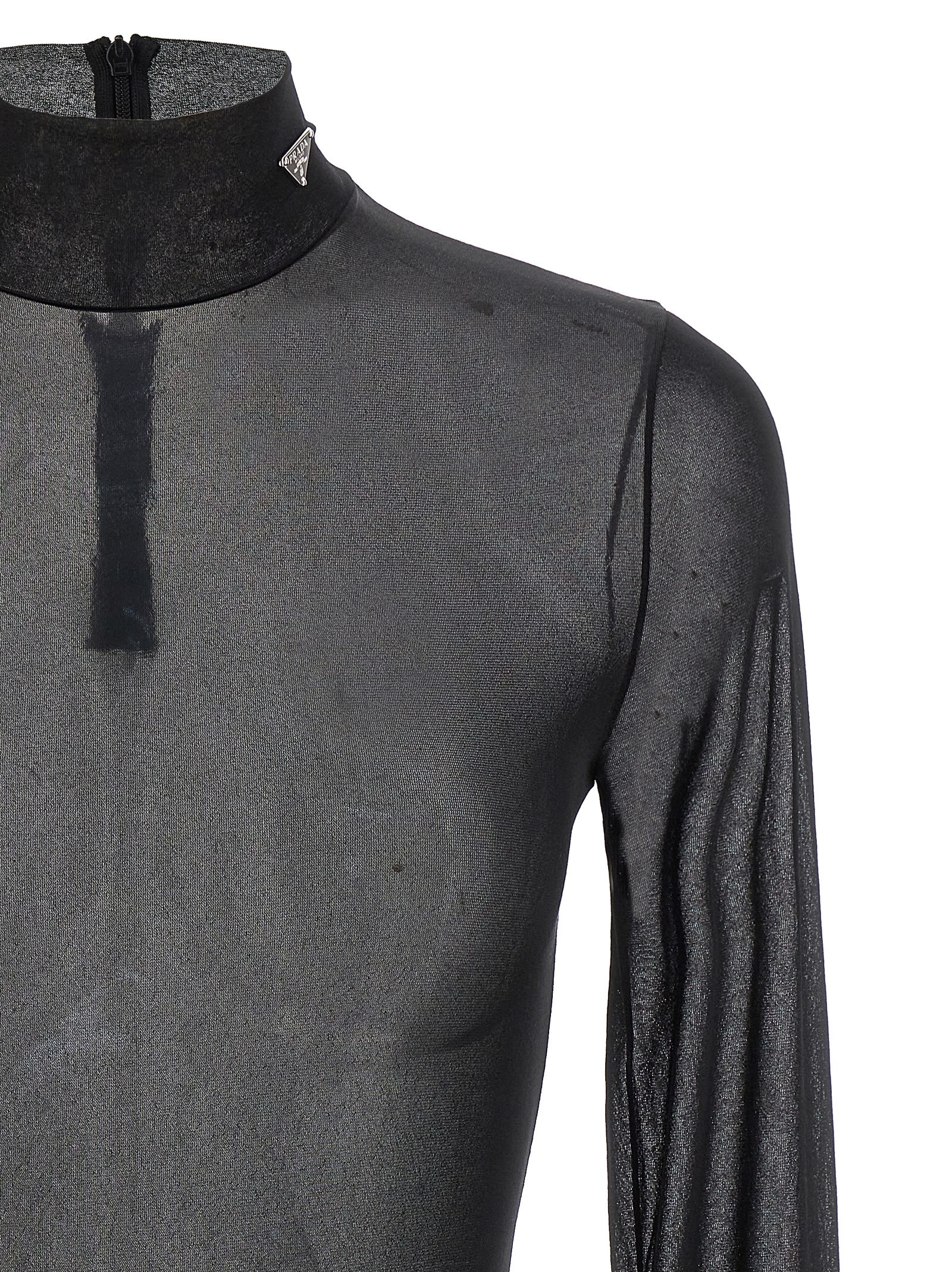 Transparent gazar jersey bodysuit, high neck with triangle enameled metal logo appliqué, long sleeves, back zip closure.