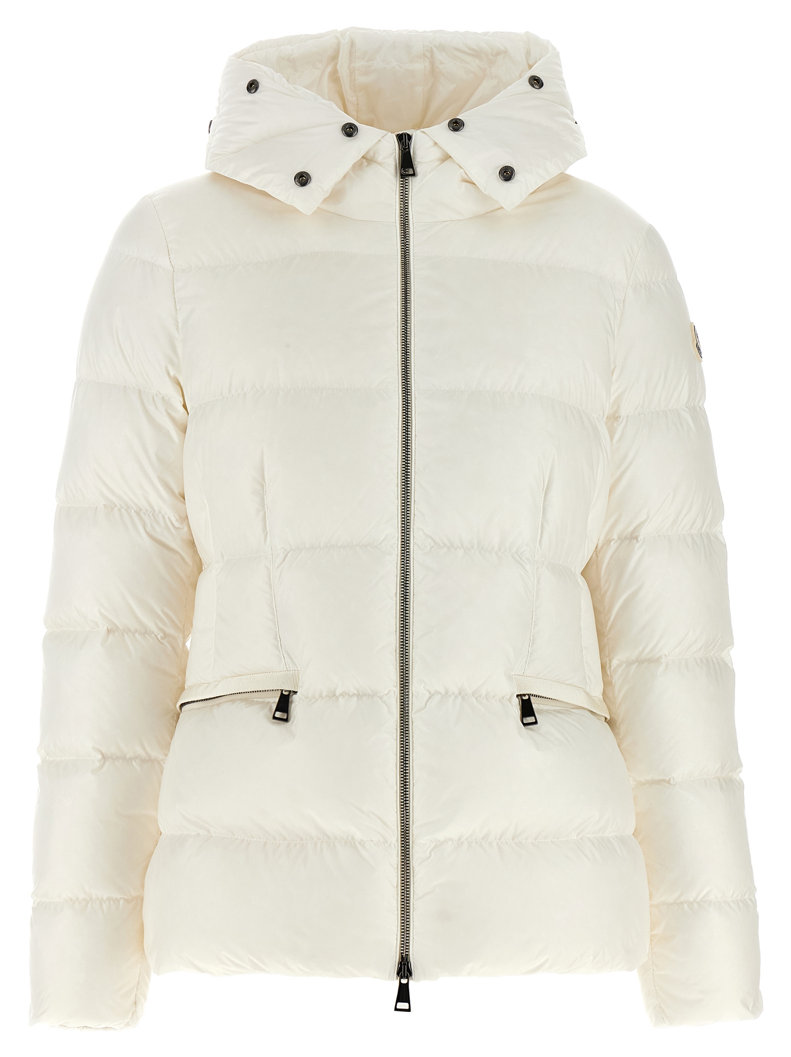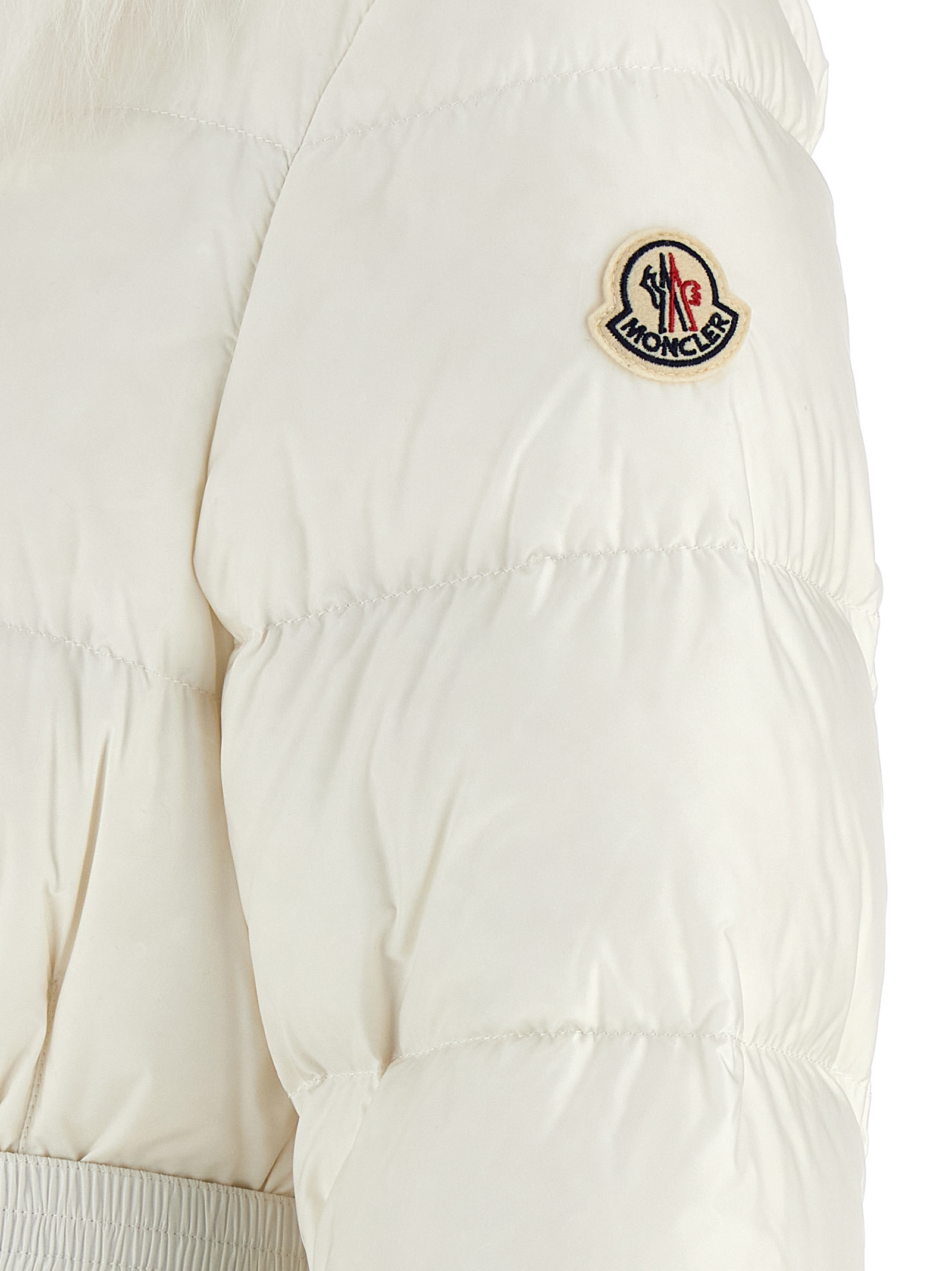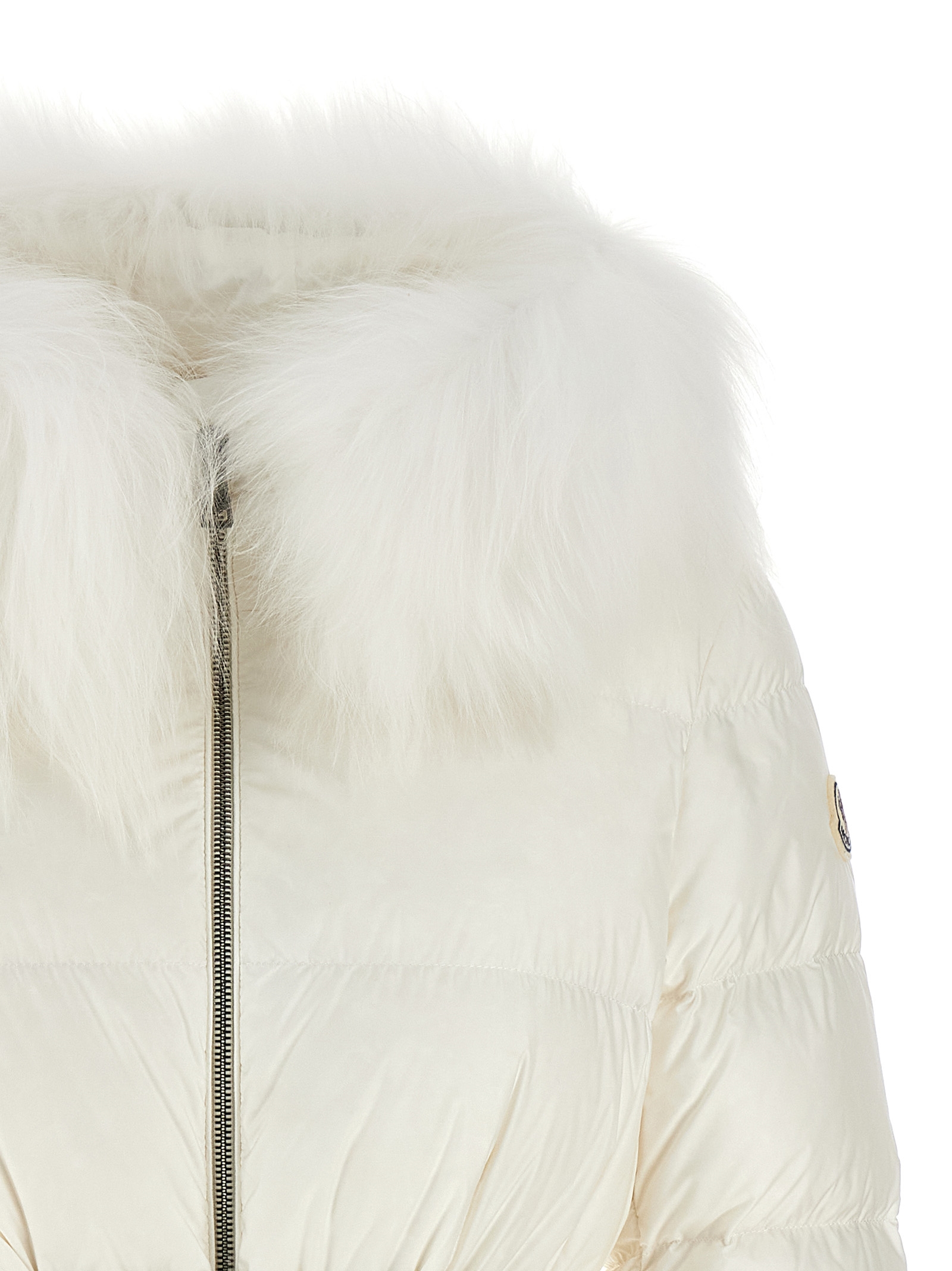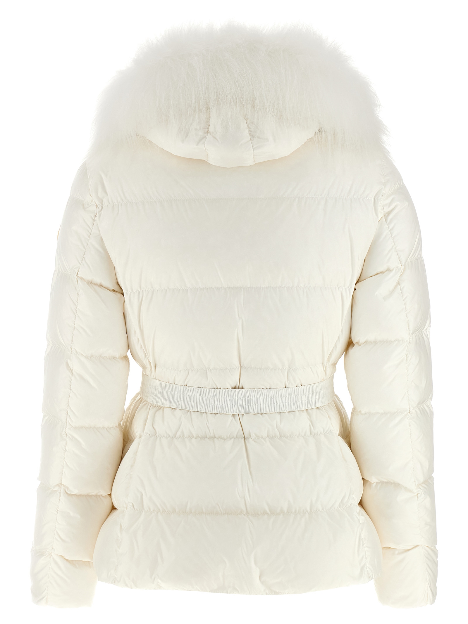 ‘Boed’ quilted longue saison goose down jacket, adjustable hood with removable long-haired sheepskin hem, front zip closure, pockets, long sleeves with felt logo patch, removable belt.