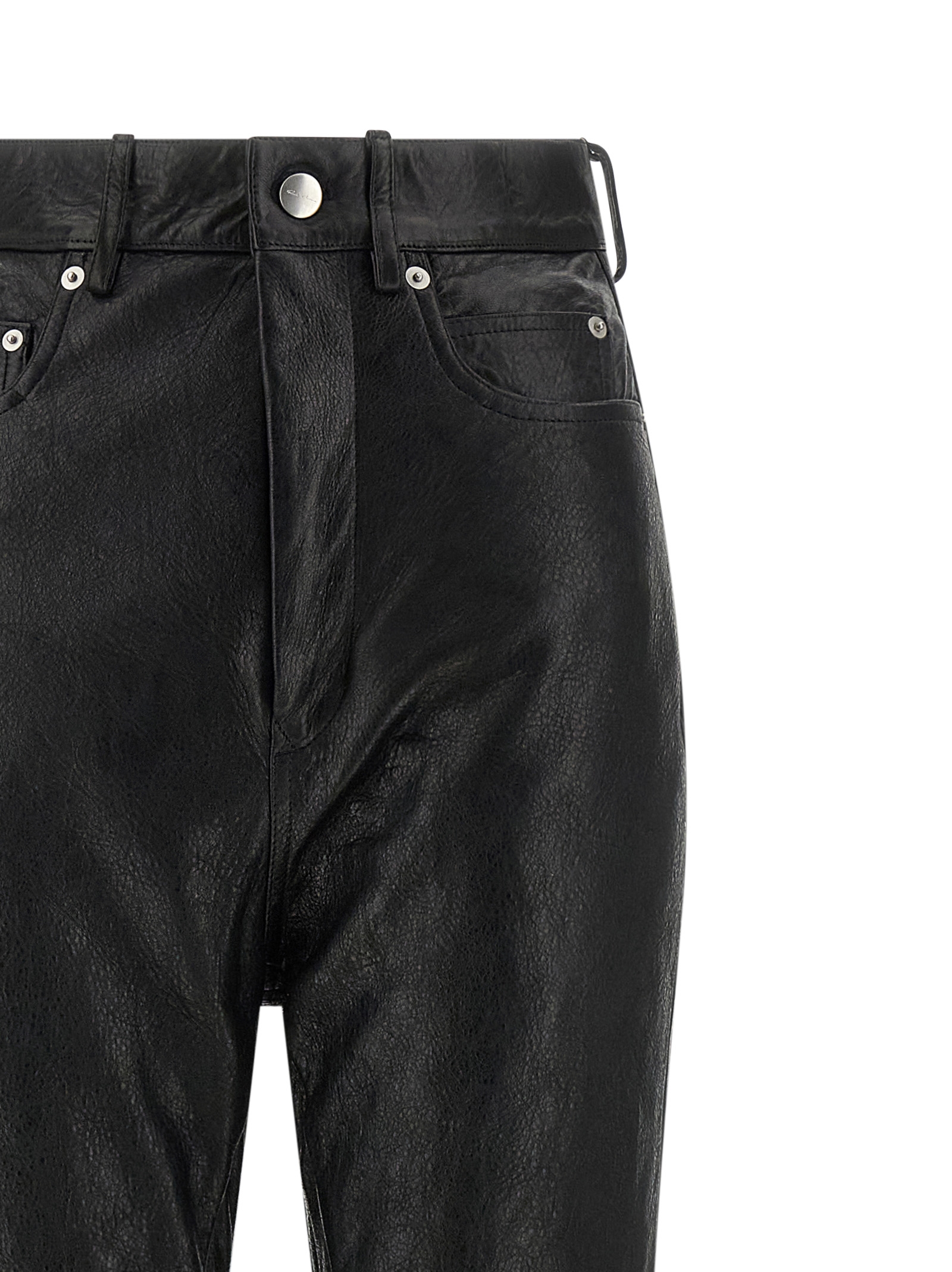 Bolan Bootcut’ leather trousers, high-waisted slim-fit, 5 pockets and bootcut trousers, front flap closure and hidden zip, central button belt, loops at the waist and rivets on the pockets, back details with visible stitching.
