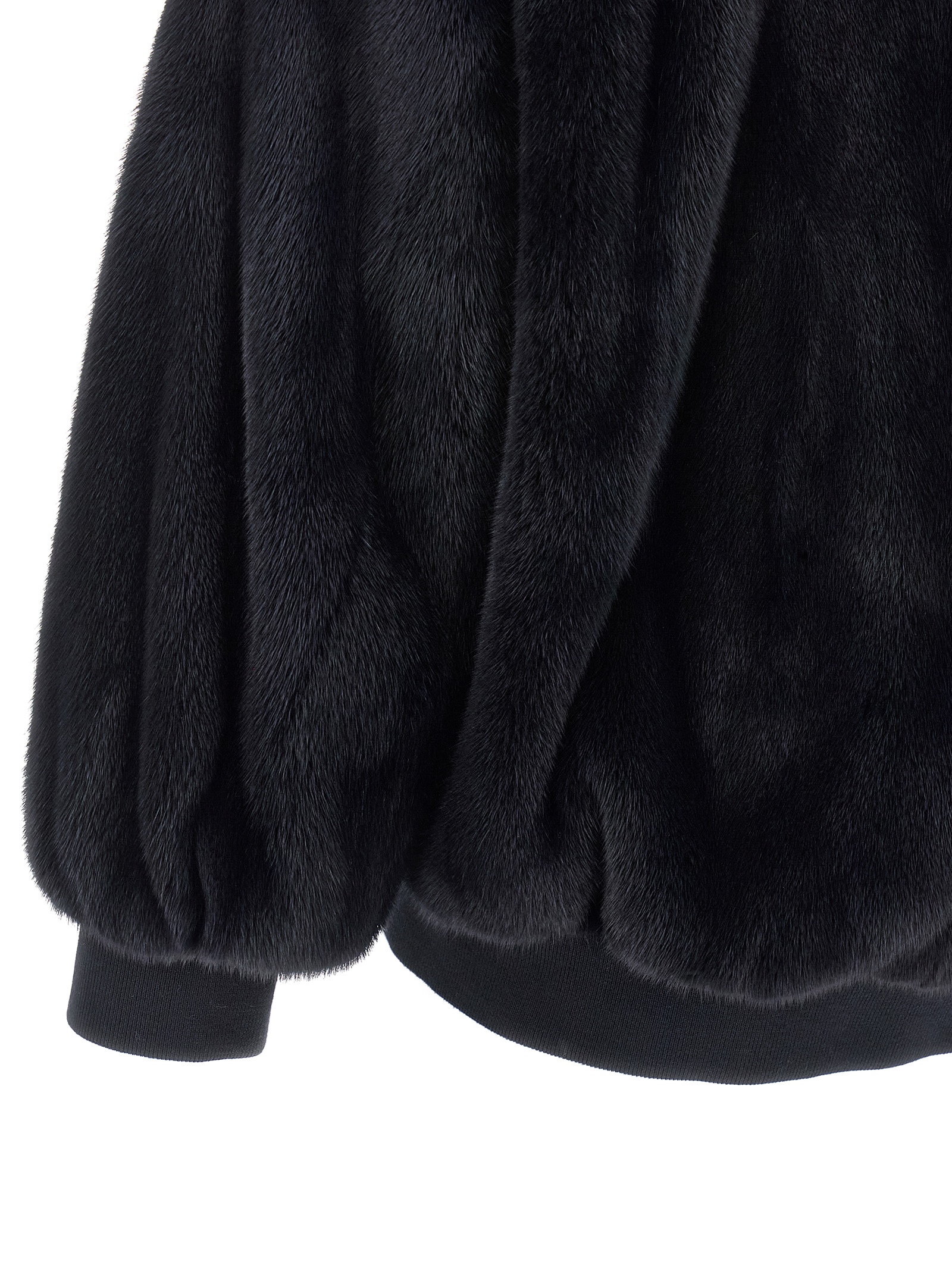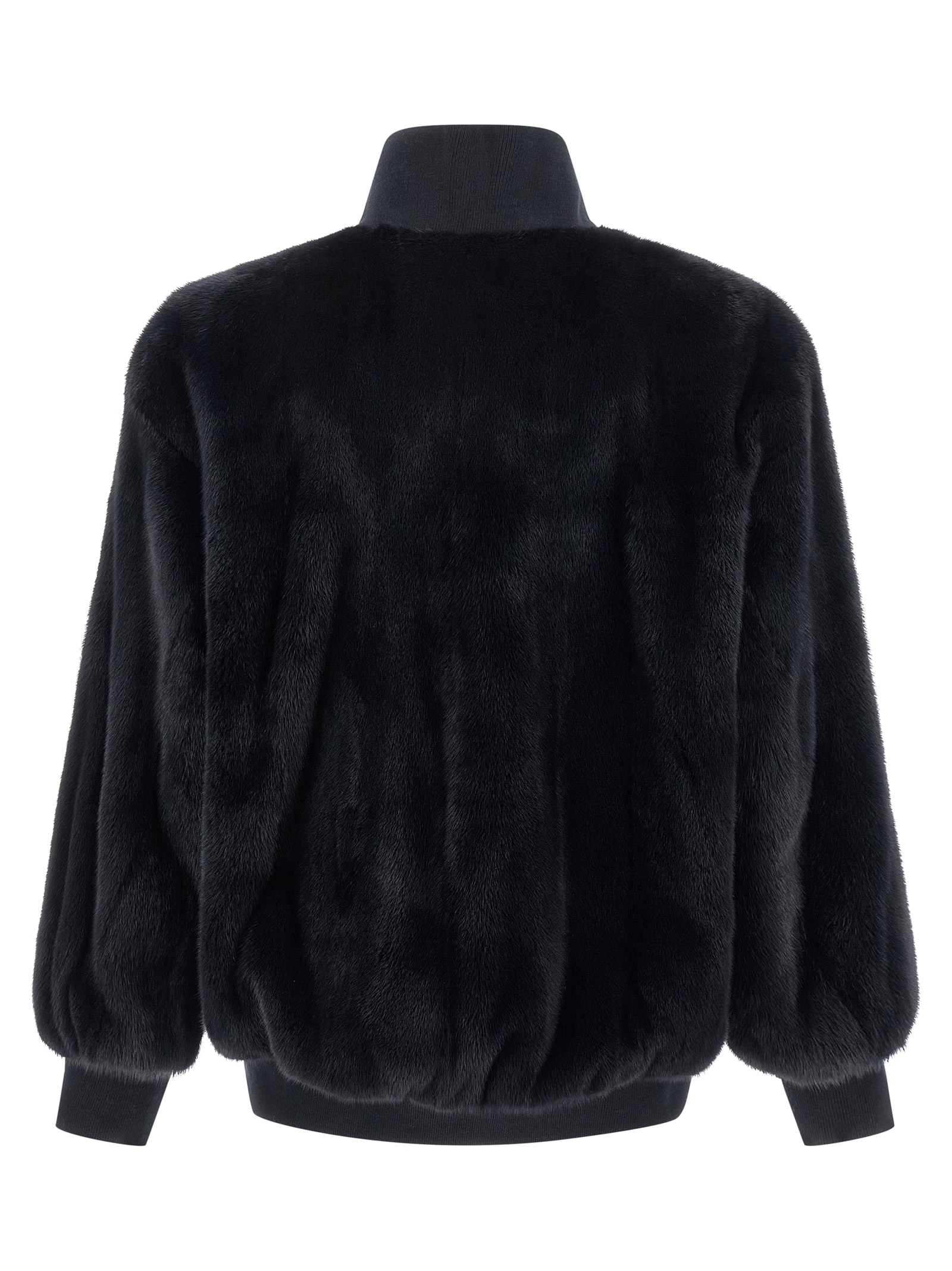 Mink fur bomber jacket, zip closure, side pockets, elastic knit collar and cuffs and hem, long sleeves.
