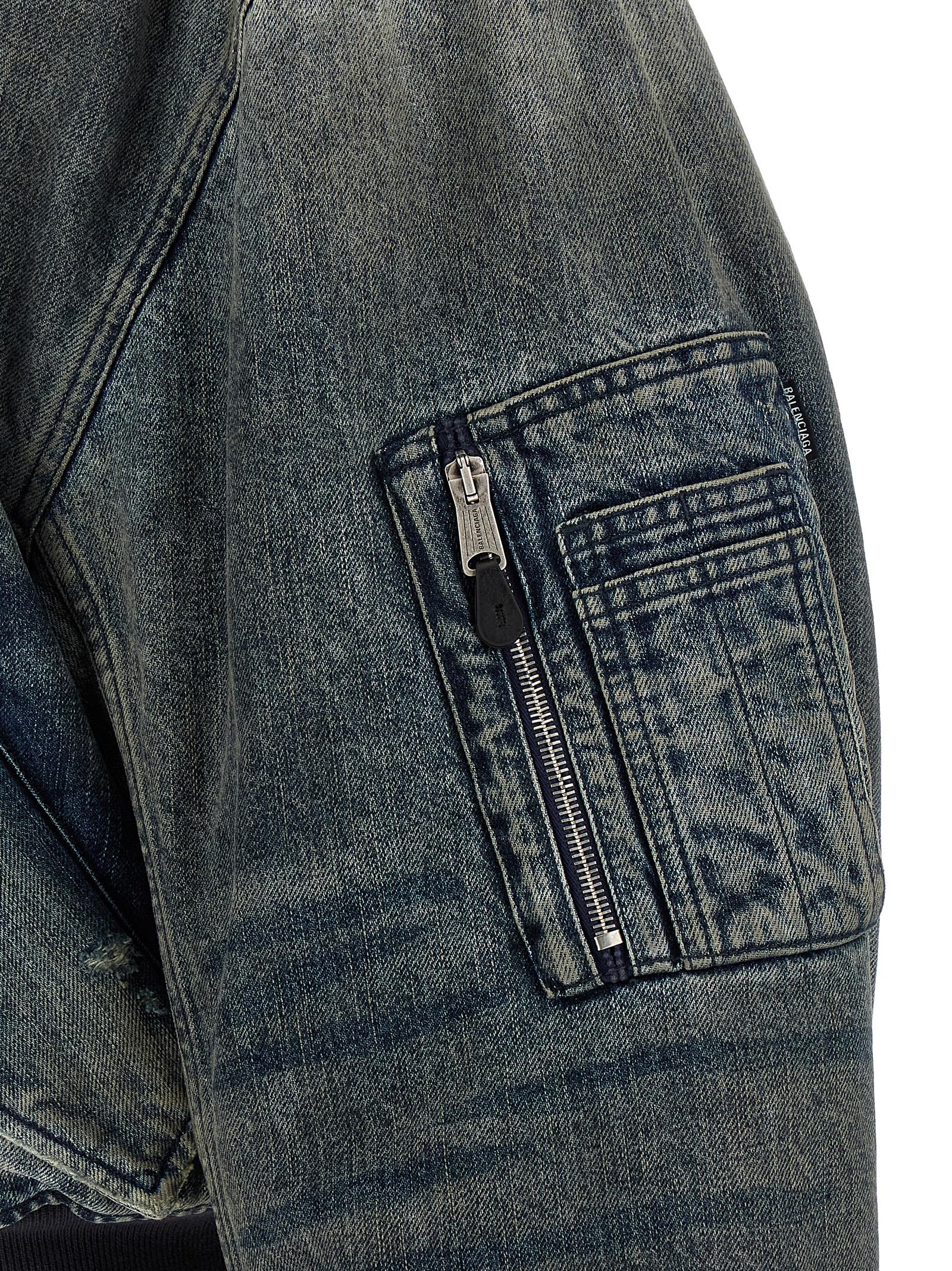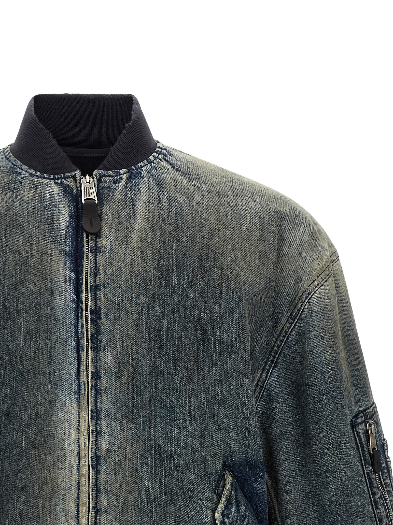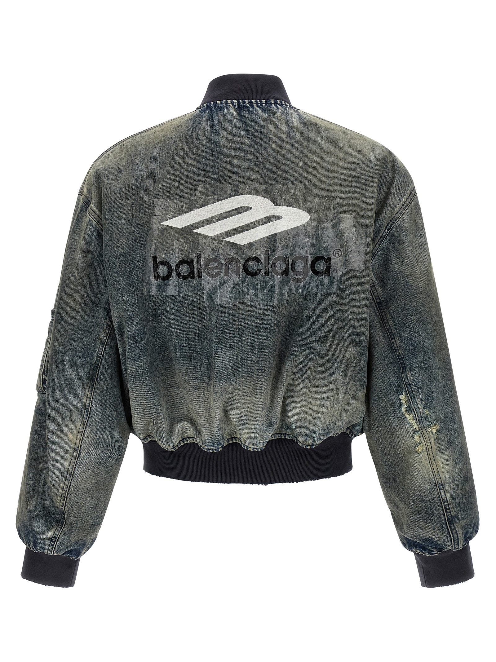 Bomber Standard’ used-effect stone washed cotton denim jacket with contrast micro ribbed stretch knit details, silk blend padded cotton lining, ‘3B Taped’ embroidery at the back, high neck, front zip closure, pockets, long sleeves with cuffs and dropped shoulders, and band on the hem.