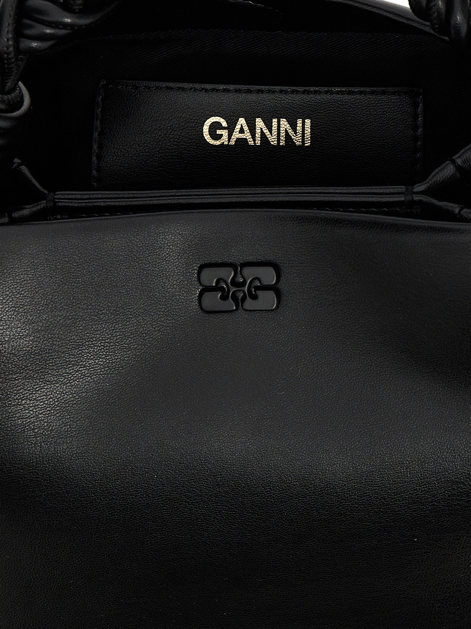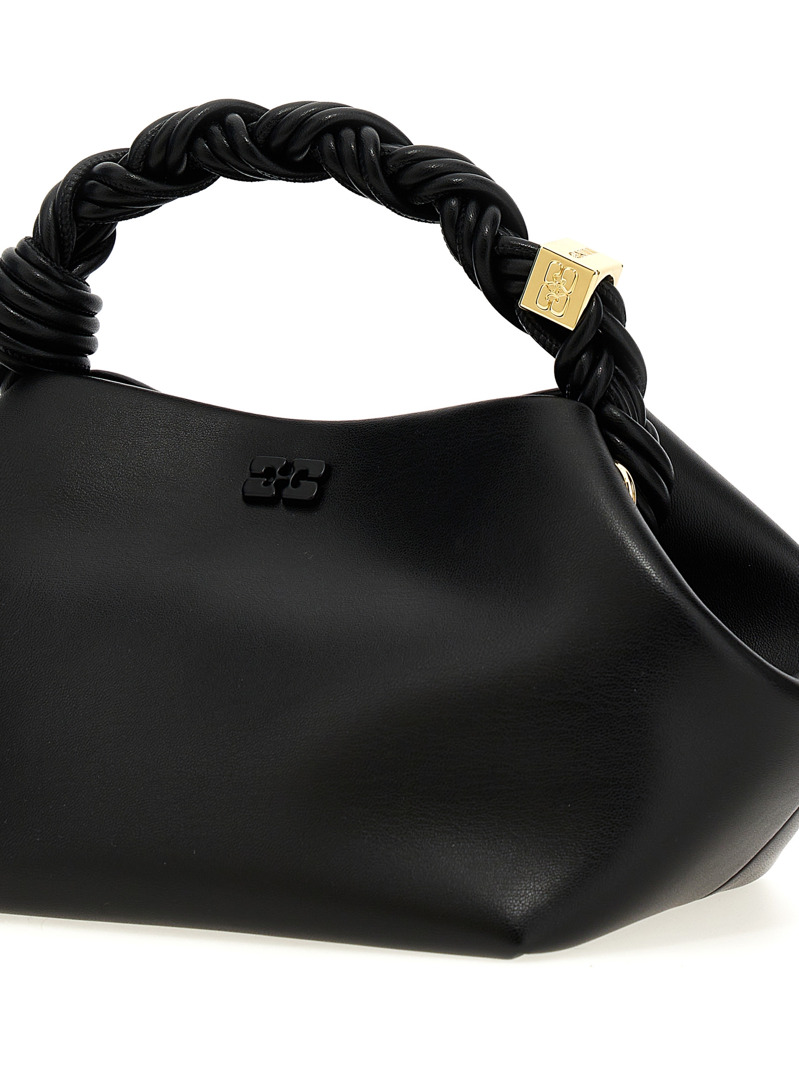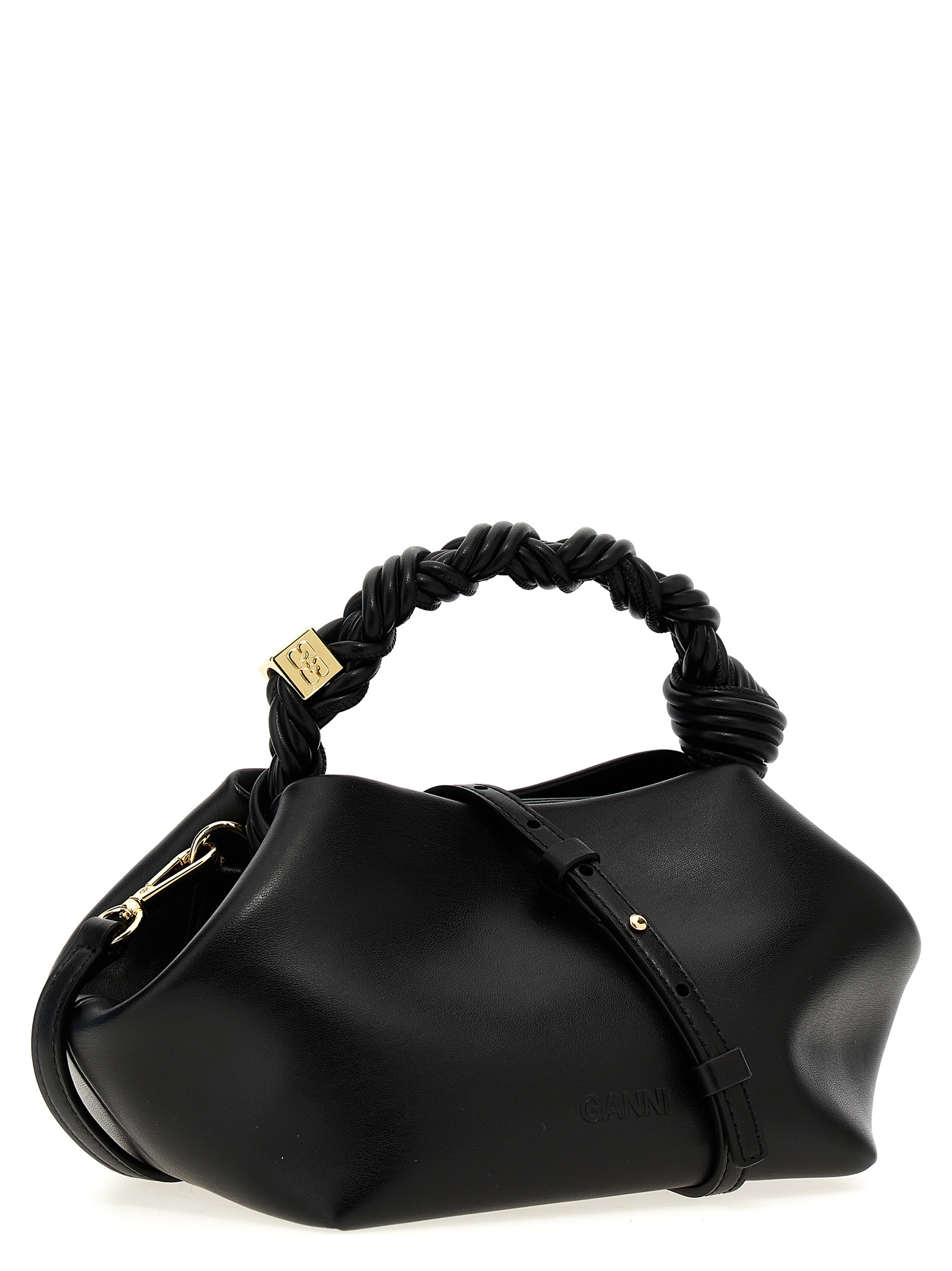 ‘Bou’ handbag in leather-effect fabric with front metal logo, magnetic closure, woven handle with engraved GANNI Butterfly logo, adjustable and removable shoulder strap.