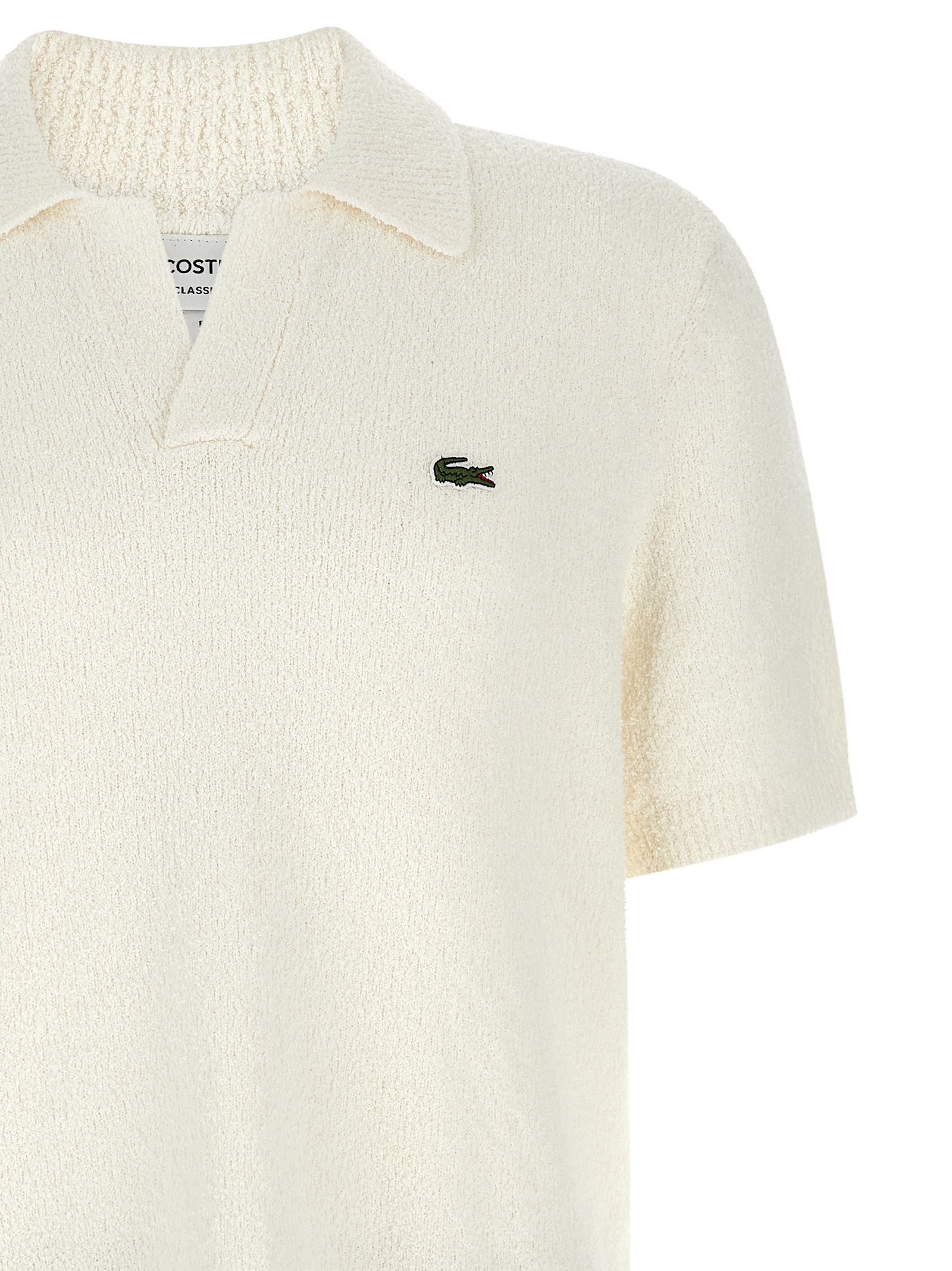 Textured 7 fineness knit cotton jersey polo shirt with medium heaviness, open collar, front logo patch, short sleeves with dropped shoulders.