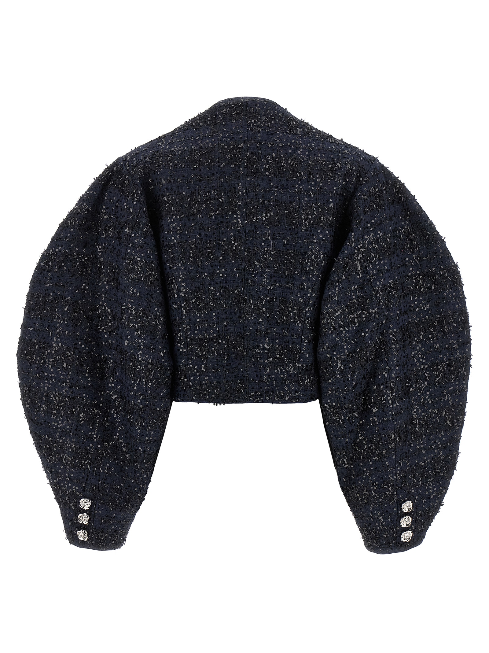 ‘Bouclé Short’ bouclé fabric blazer with all-over sequin appliqué, bolero crop model, front button closure, crew neck, wide long sleeves.