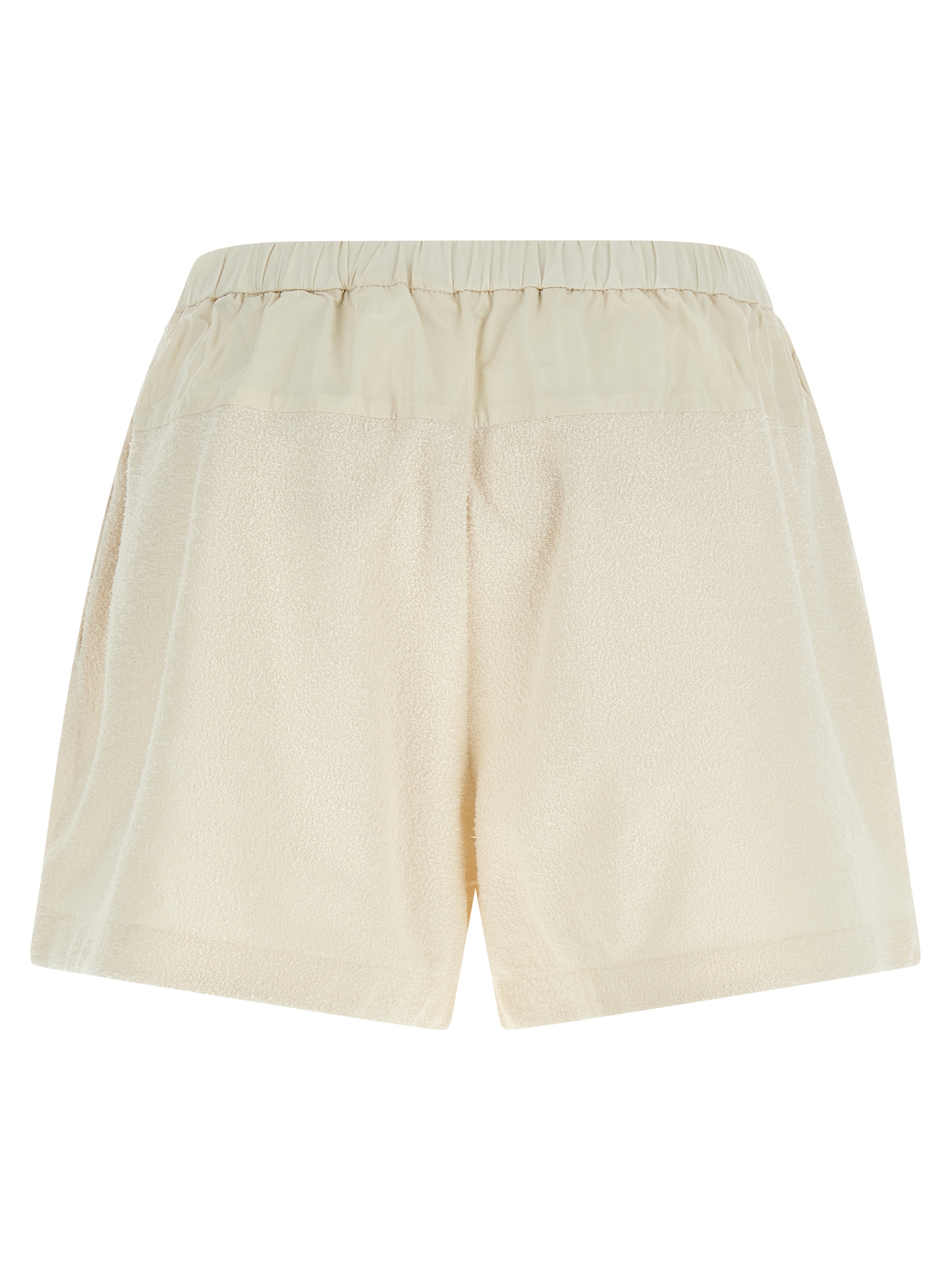 Lightweight bouclé fabric shorts, tone-on-tone nylon insert at the waist with elastic and drawstring, pockets, tone-on-tone grosgrain logo patch on the front.