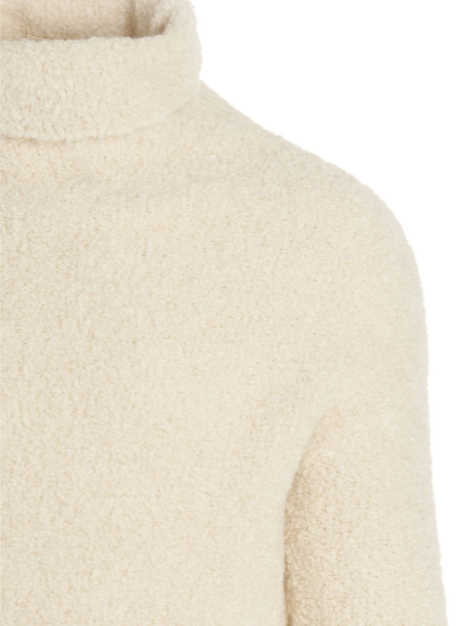 Alpaca blend bouclé sweater, with a high neck, long sleeves with finger hole details.