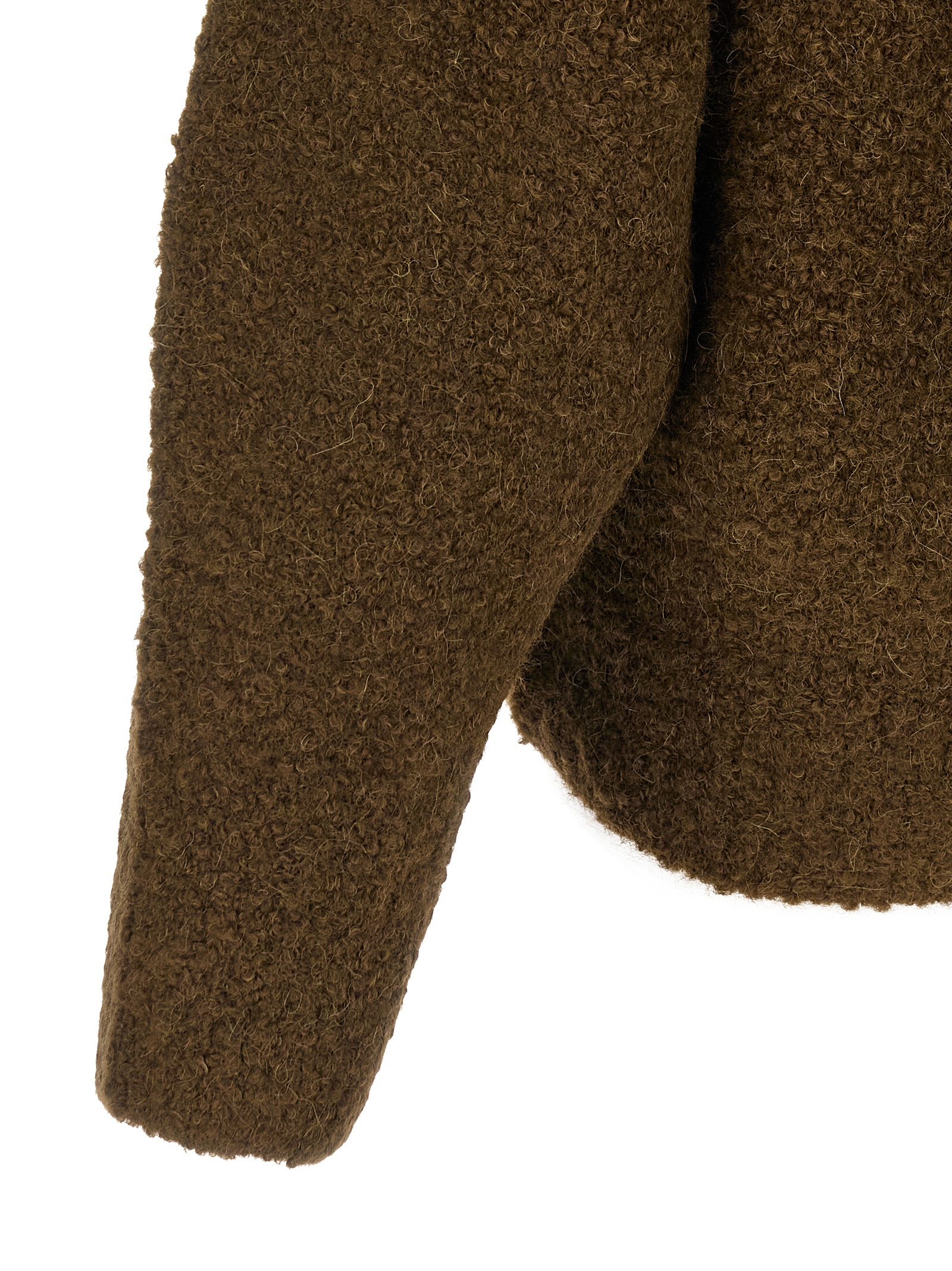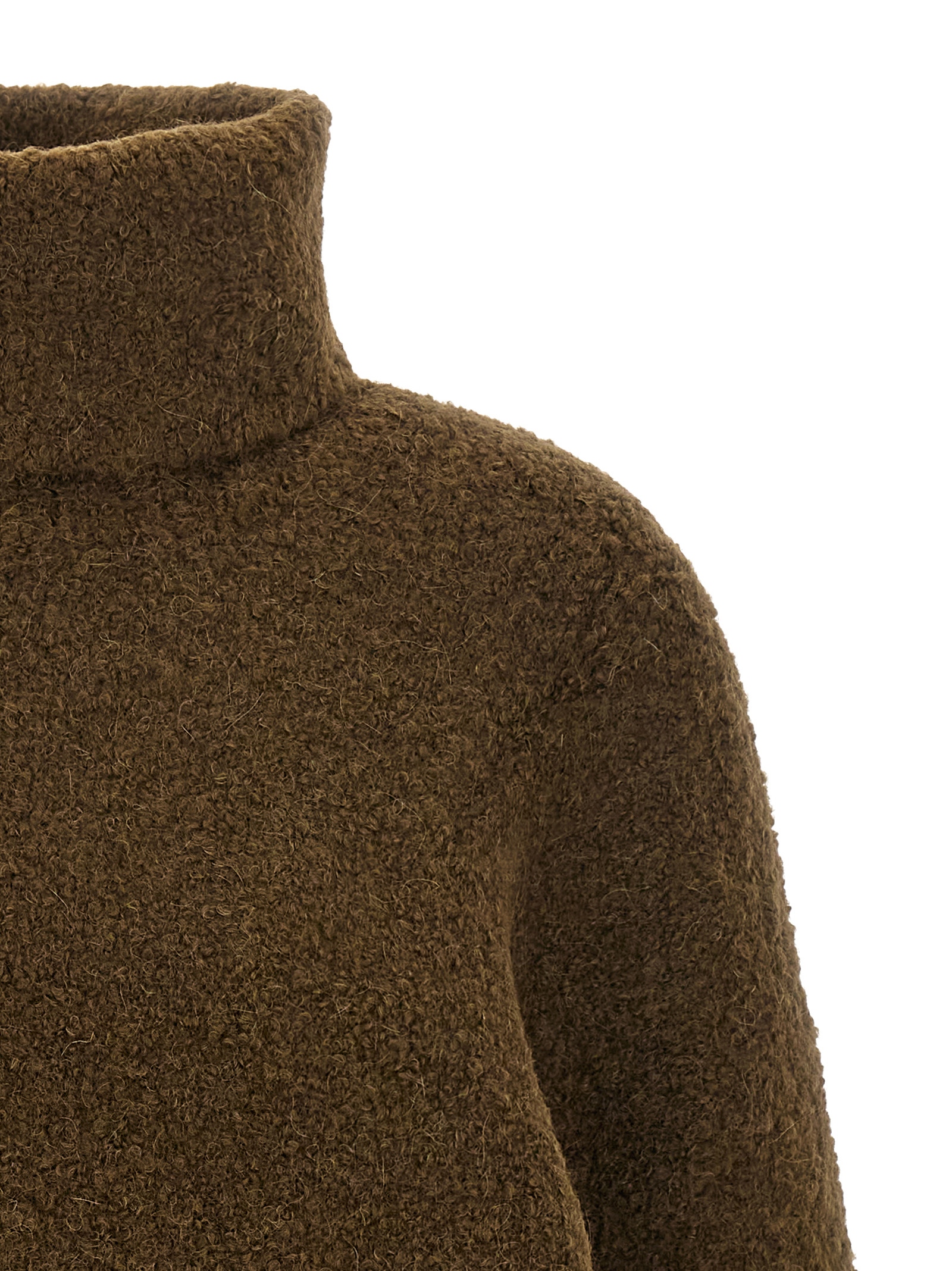 Alpaca blend bouclé turtleneck sweater with a soft teddy bear texture, inverted trapeze silhouette, turned-up high neck, long bat sleeves with dropped shoulders.