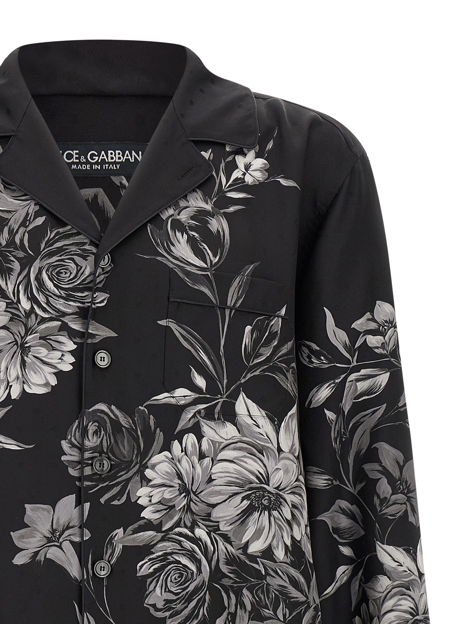 ‘Bouquet Fiori’ print jacquard silk twill shirt, vanity collar, chest pocket, front button closure, long cuffed sleeves, side slits, and asymmetric hem.
