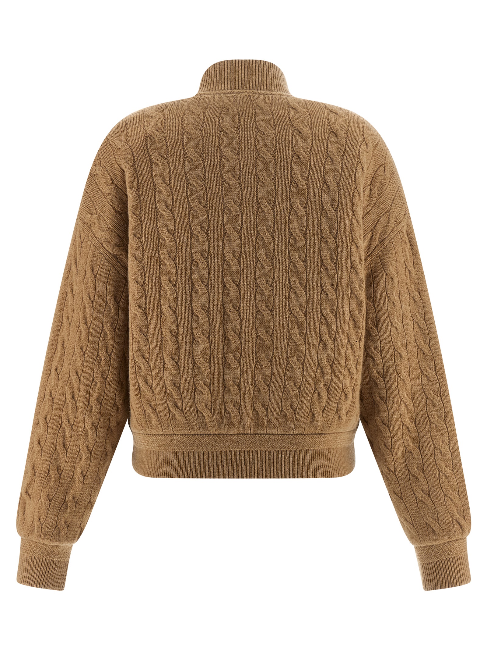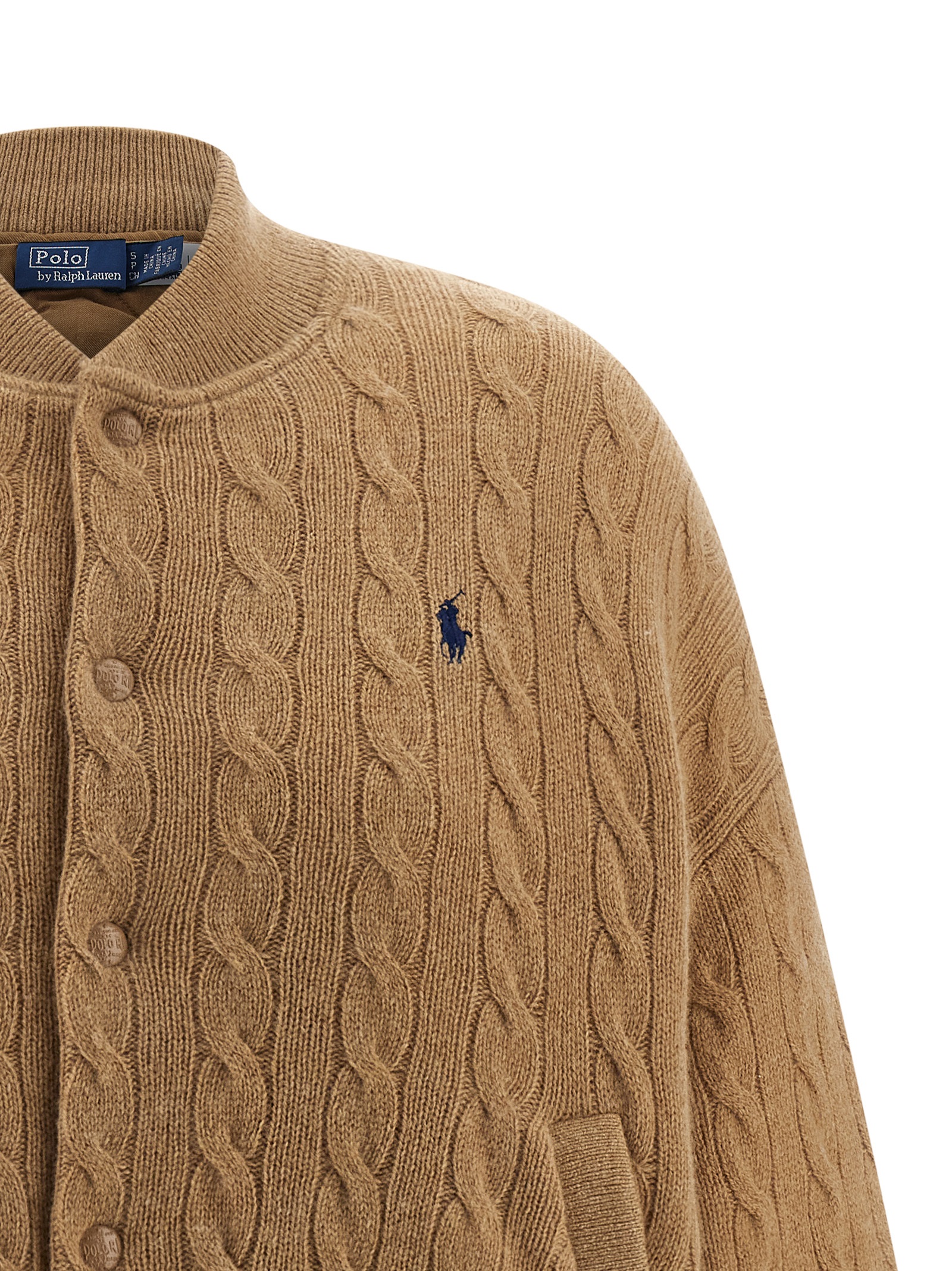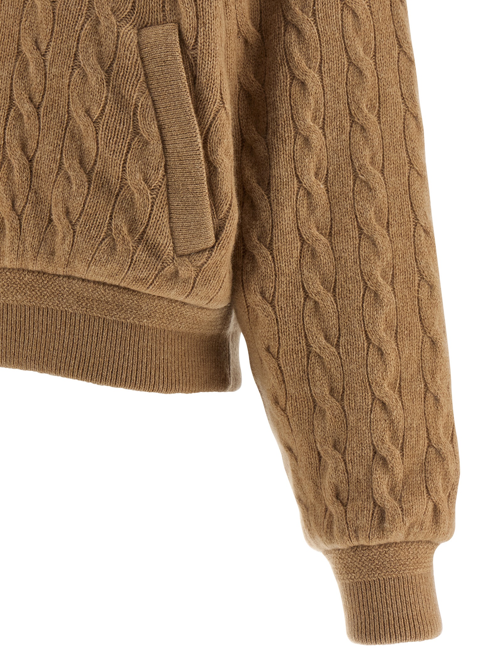 Italian wool and cashmere braided bomber jacket, slightly padded diamond-shaped lining, front logo embroidery, front snap button closure, pockets, long sleeves with cuffs and dropped shoulder.