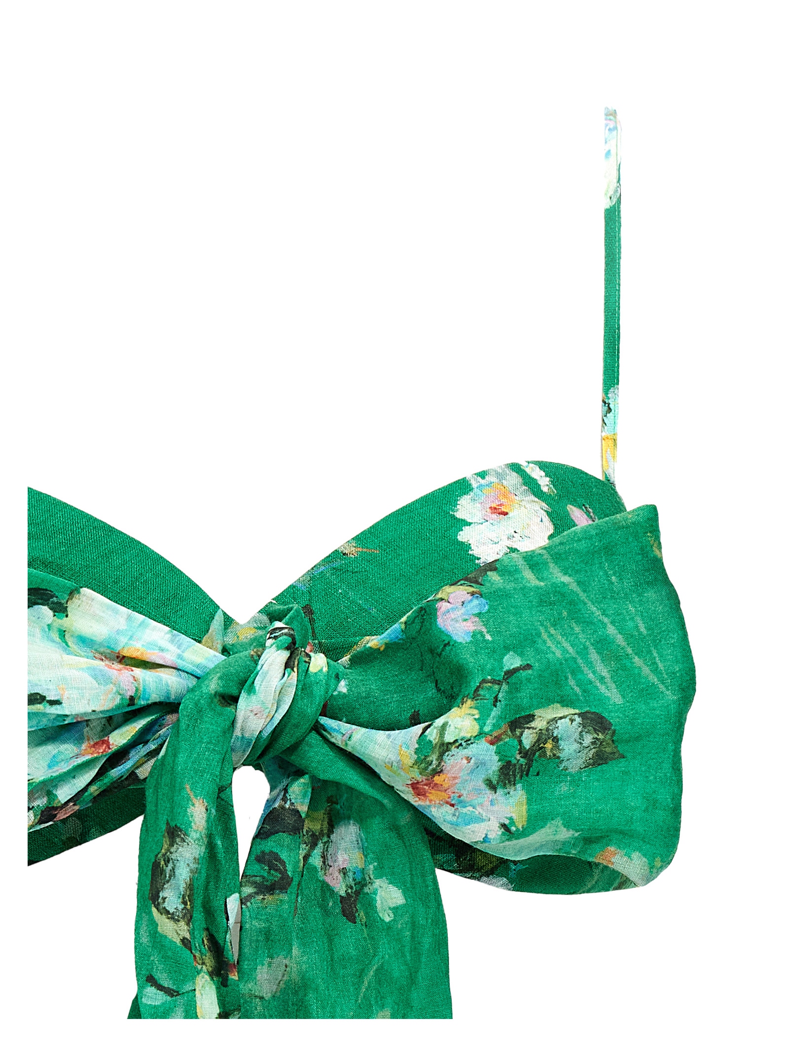 ‘Everley Draped Bow’ floral print linen bralette with front draped bow detail, adjustable and removable shoulder straps, and back hook closure.