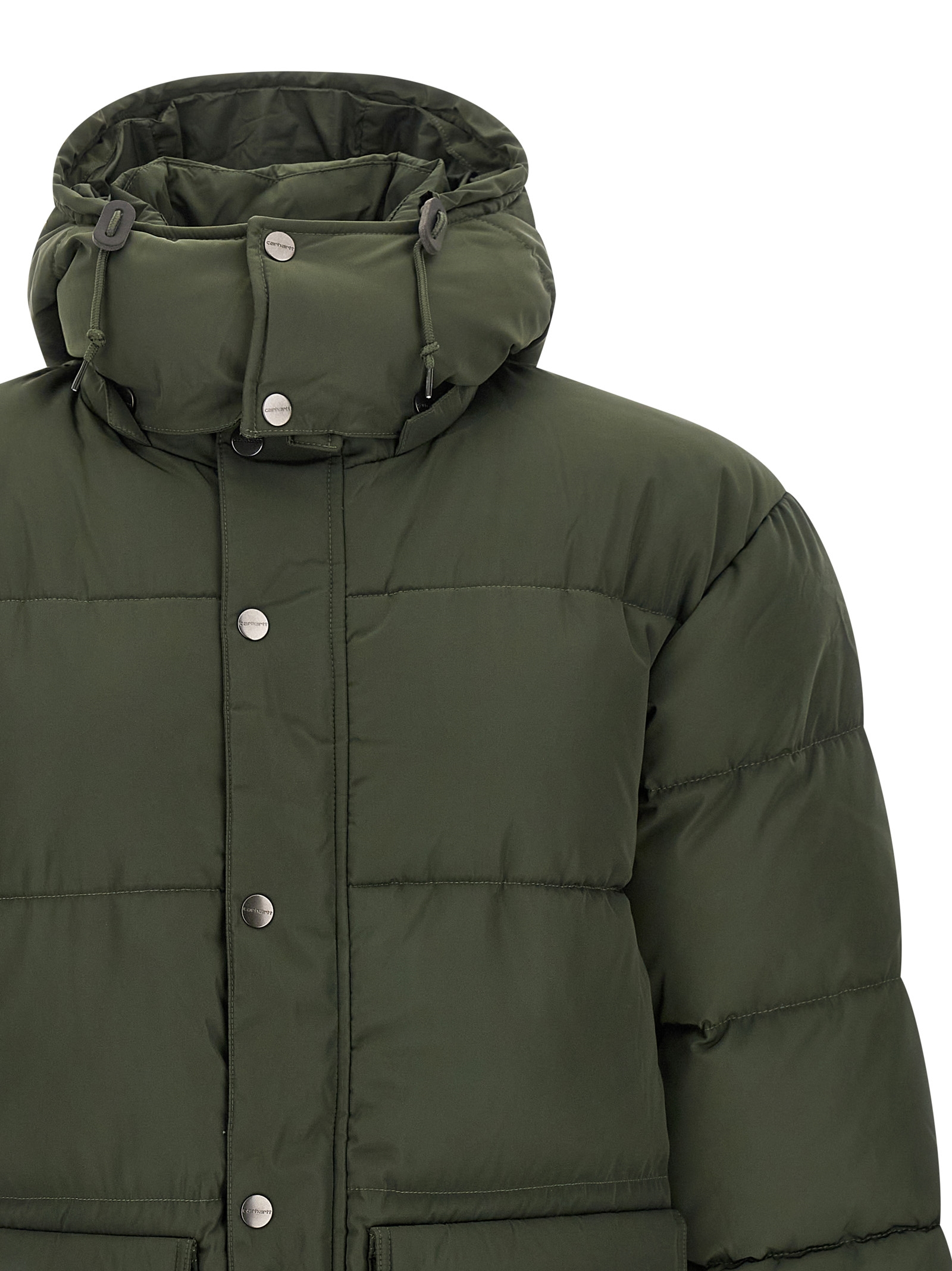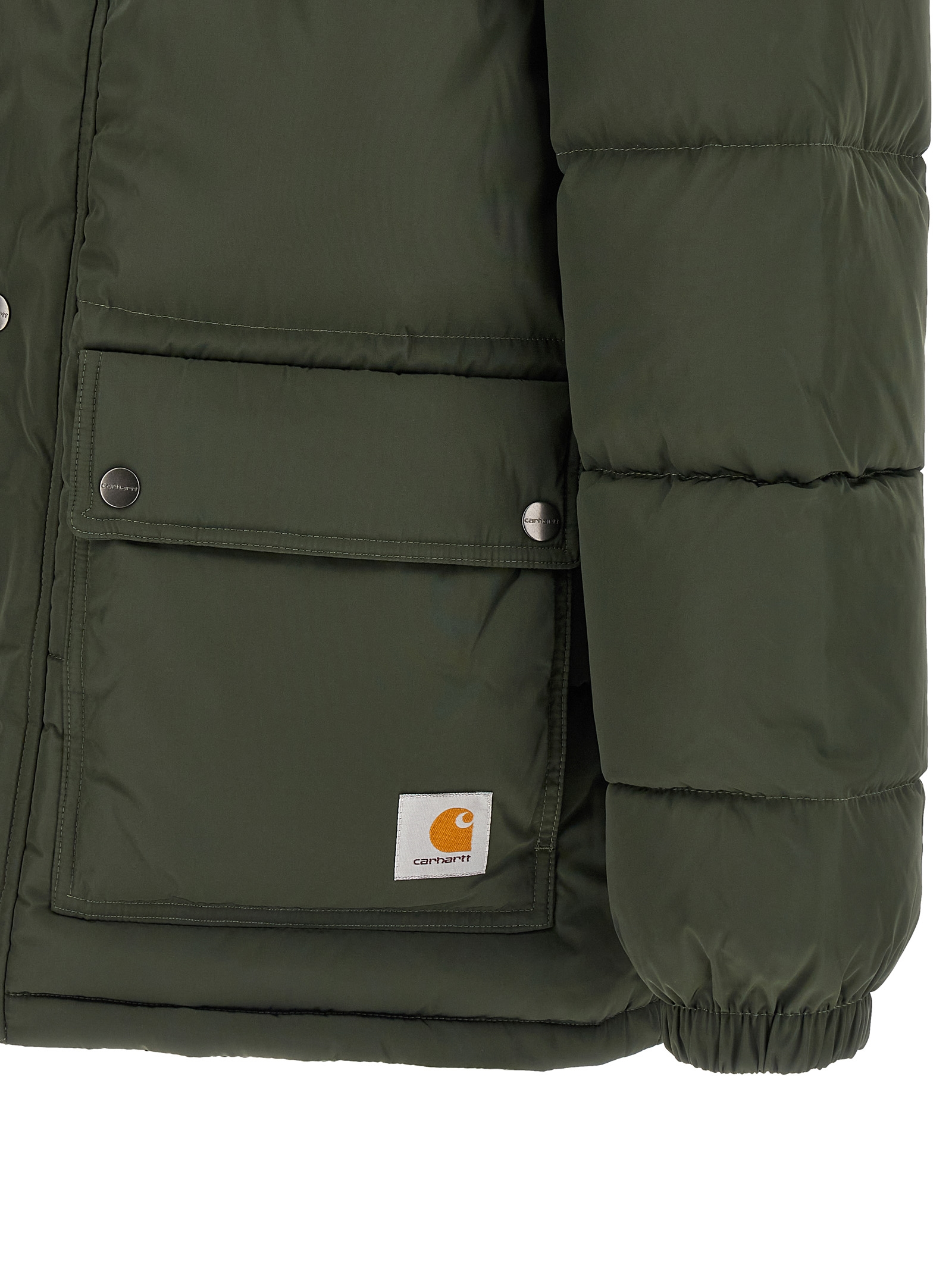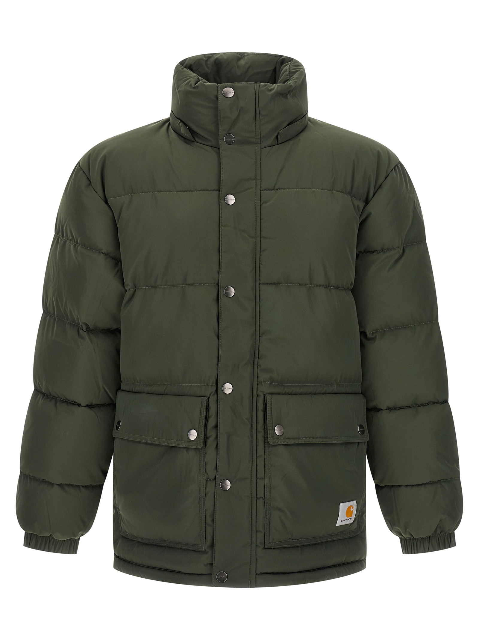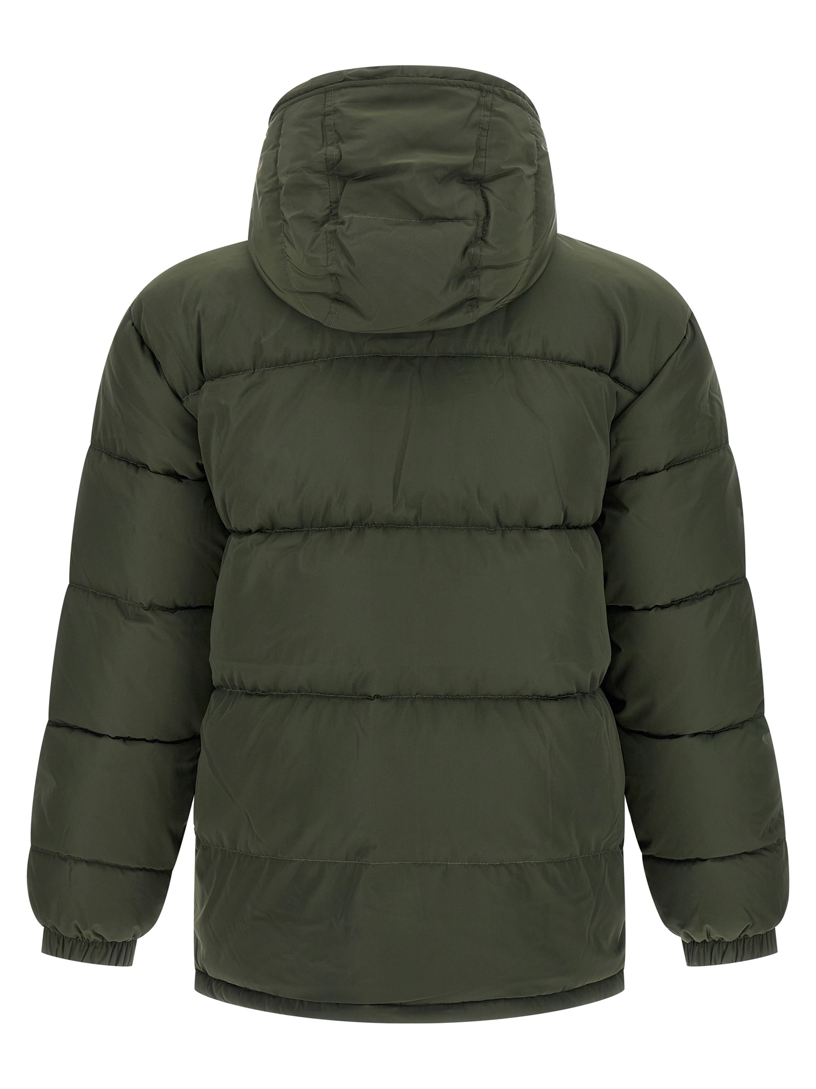 ‘Brent Jacket’ padded and quilted nylon down jacket, removable hood, front pockets with logo patch, front zip closure, long sleeves with elastic cuffs.