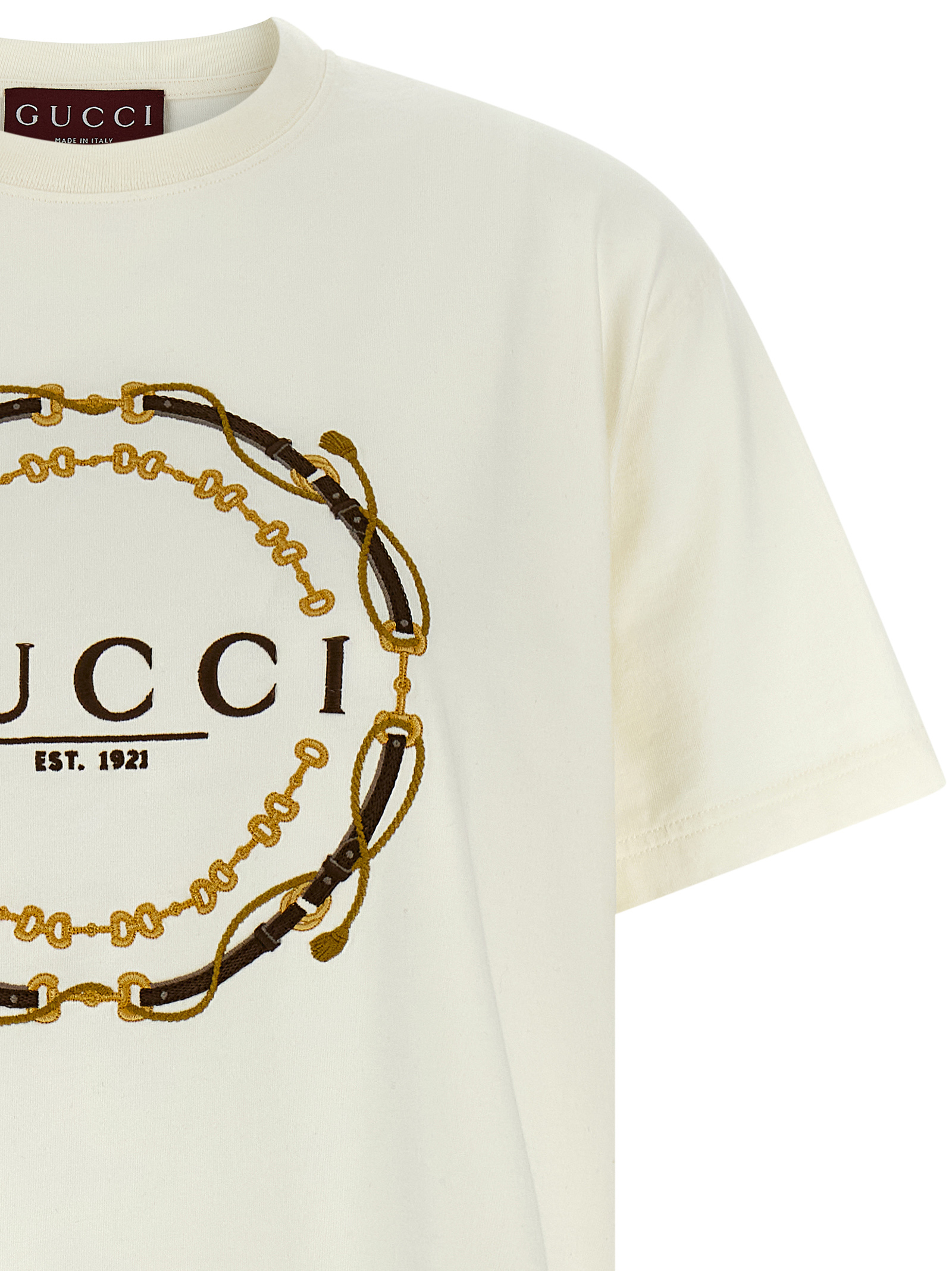 T-shirt in medium cotton jersey, embroidered ‘Briglie Gucci Est 1921’ on the front, crew neck, short sleeves with dropped shoulders.