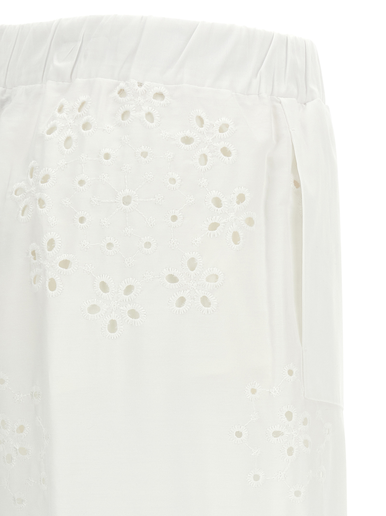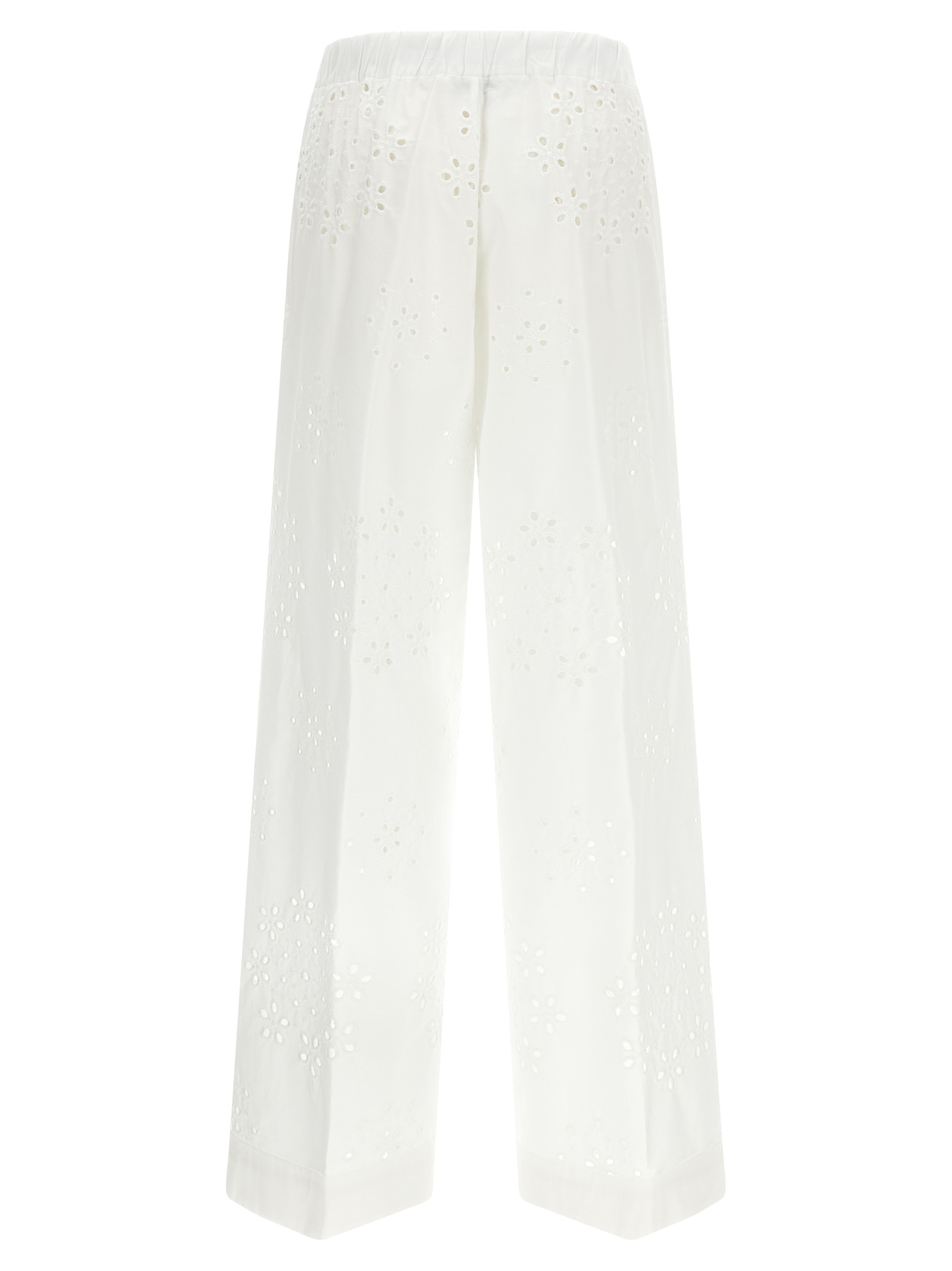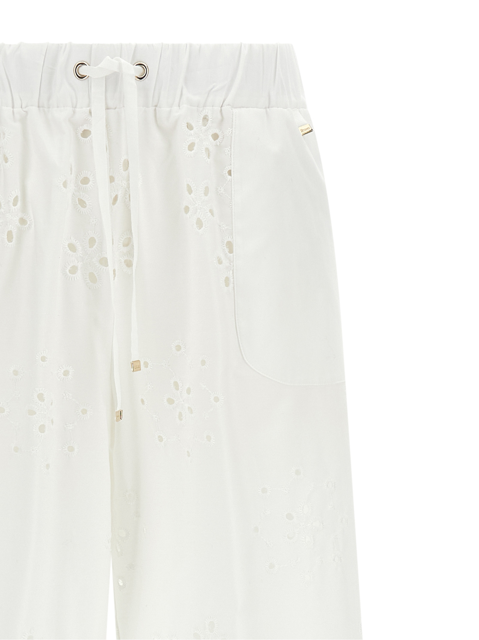 ‘Broderie Anglaise’ cotton pants with embossed embroidery and perforated patterns, lining, wide and straight leg, drawstring elastic waistband, welt pockets, turn-up on the leg bottom.