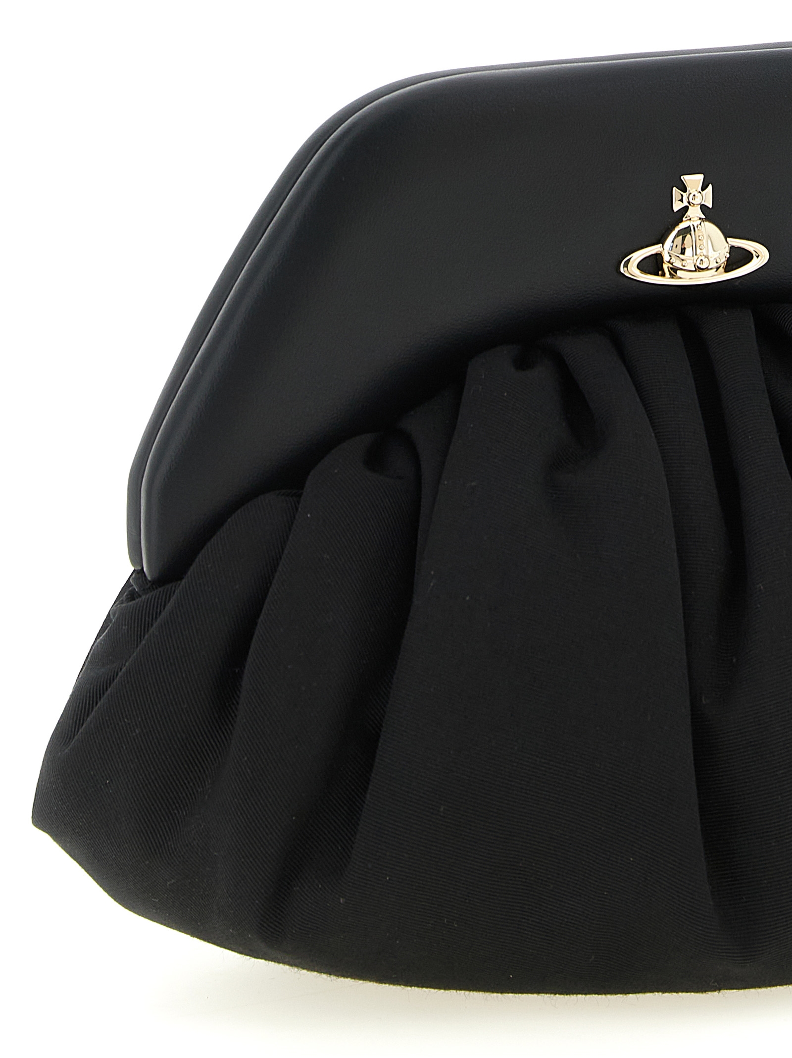 ‘Brooke’ crinkled fabric clutch, magnetic closure with outer leather-effect fabric and metal acting as an inner mirror, metal Orb logo on the front, removable ‘Hazel’ handle.