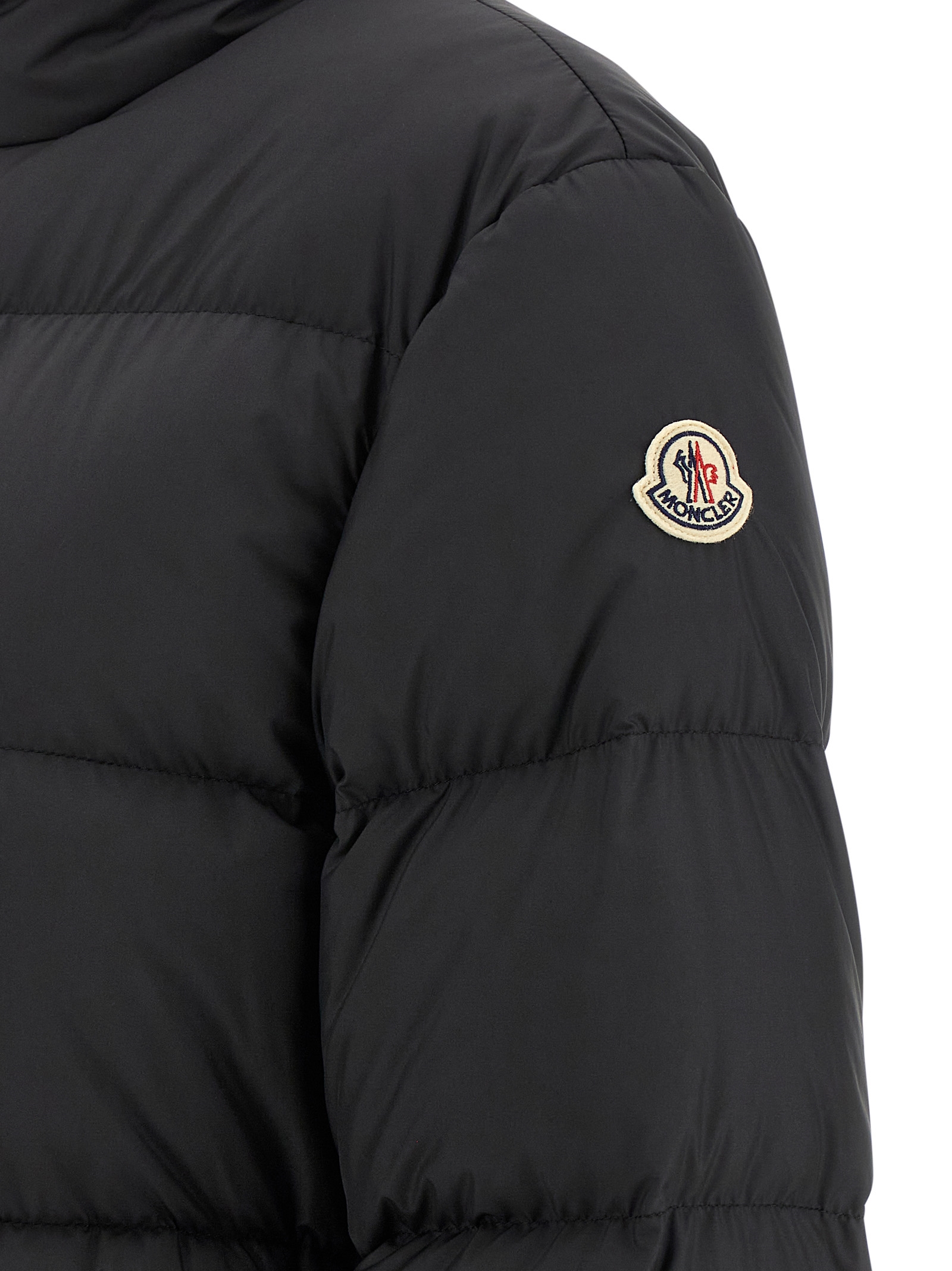‘Brossette’ quilted fabric jacket with goose down padding, hourglass silhouette with elastic waistband, stand-up collar, front zip closure, pockets, long sleeves with elastic cuffs and felt logo patch appliqué.